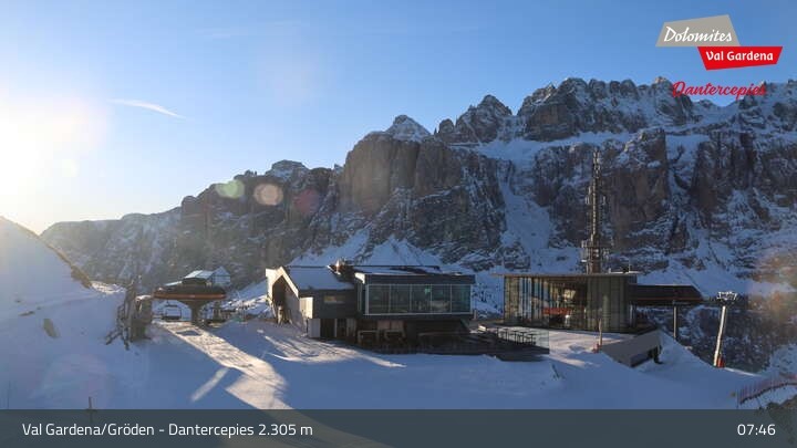 Aktuelle Bilder von der Bergstation der Gondel Dantercepies bei Wolkenstein im Skigebiet Gröden.