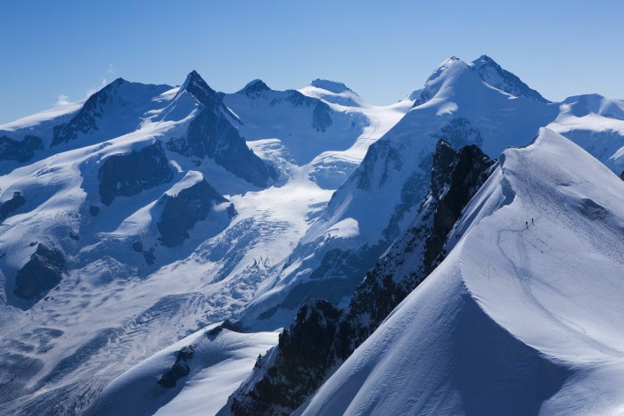 Ausblick über die Bergstation der Längfluhbahn mit Panoramablick auf den Feegletscher und das Skigebiet.