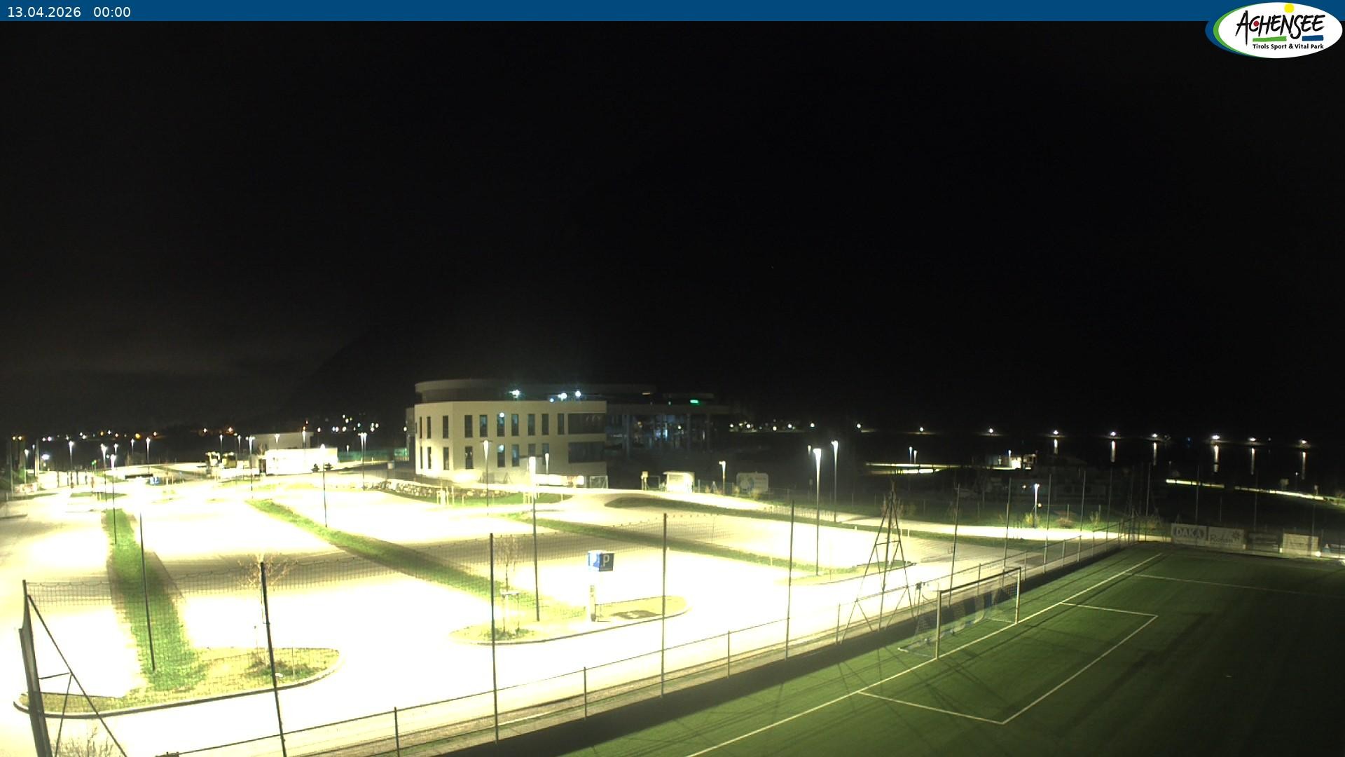 Blick über den Parkplatz auf das Atoll Achensee, ein Multifunktionskomplex mit Schwimmbad, Sauna, Eishalle und vielem mehr. Das Gebäude liegt direkt am Achensee.