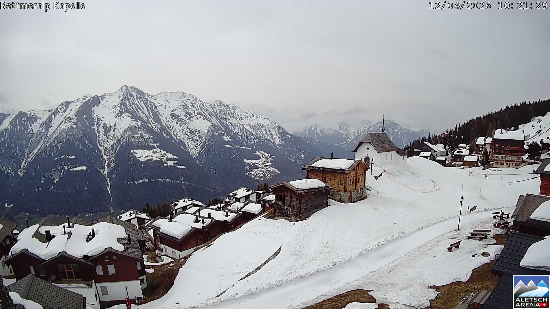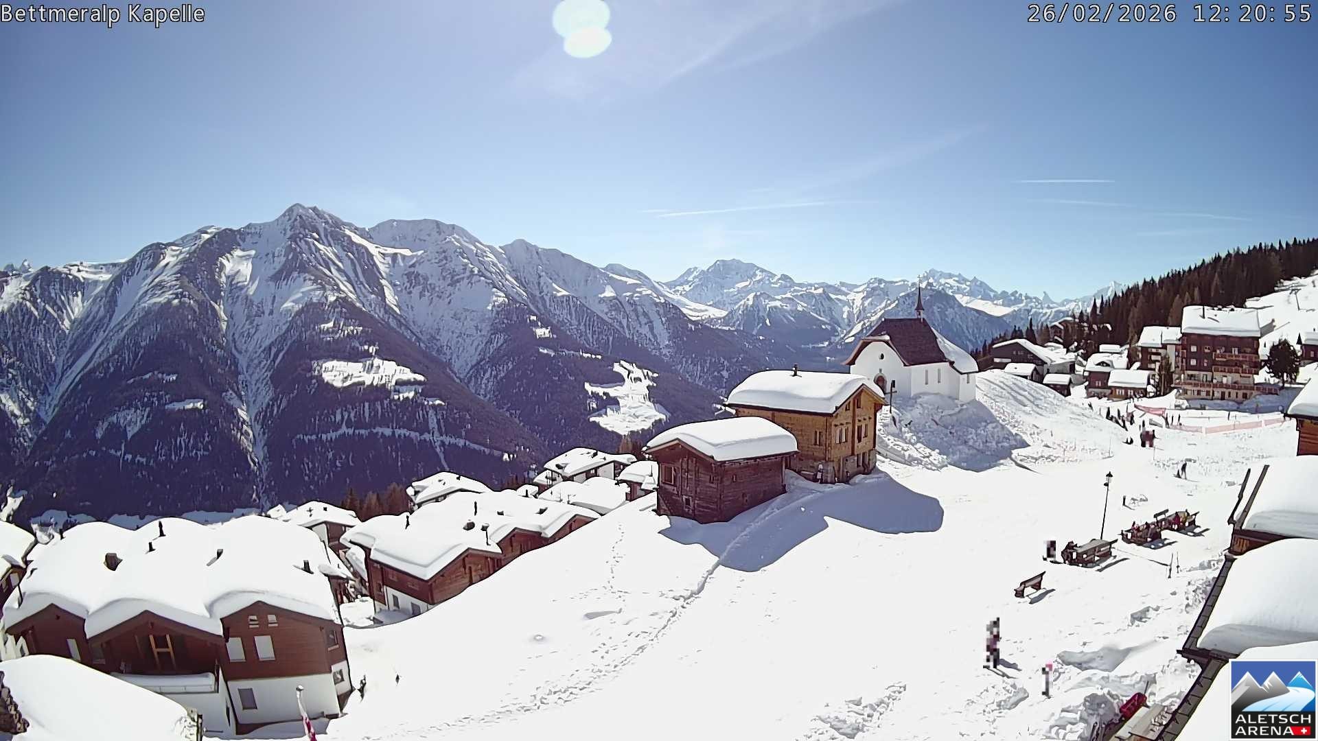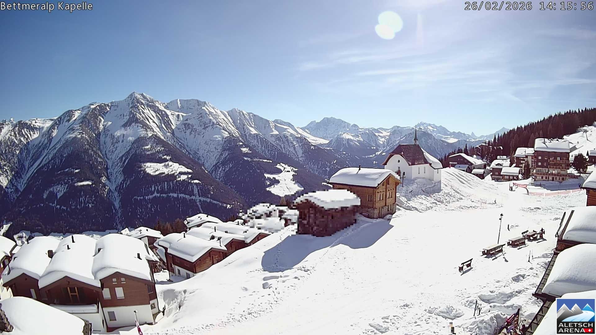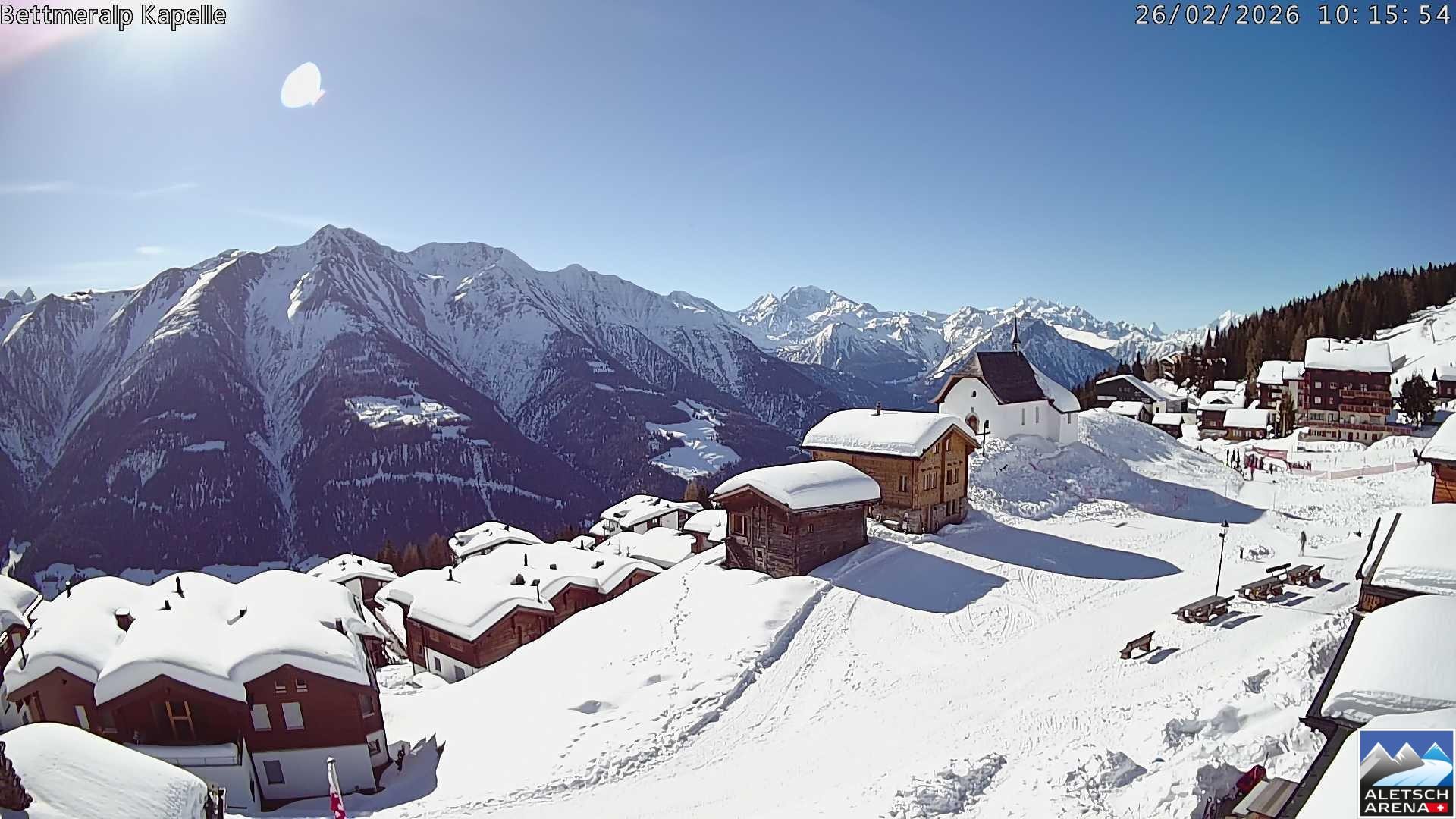 Blick über die Kapelle/Bettmeralp auf die Viertausender des Wallis. Zu sehen ist die Mischabellgruppe mit dem Dom (höchster Gipfel der Schweiz, der komplett auf Schweizer Territorium liegt) und sogar das berühmte Matterhorn.