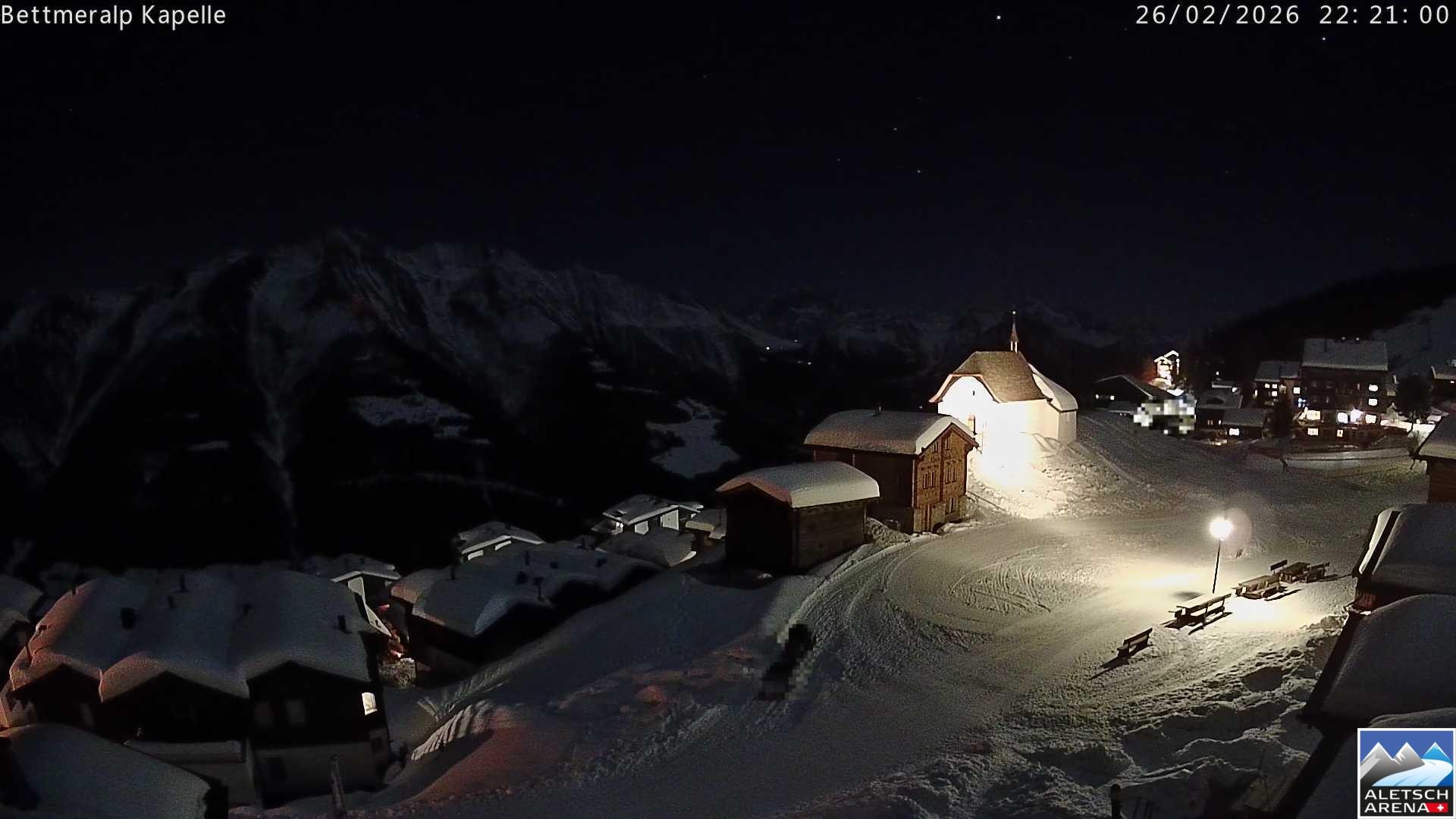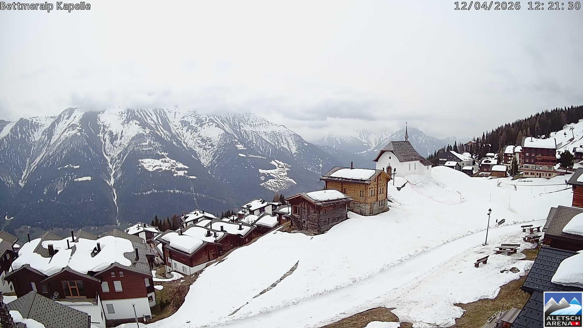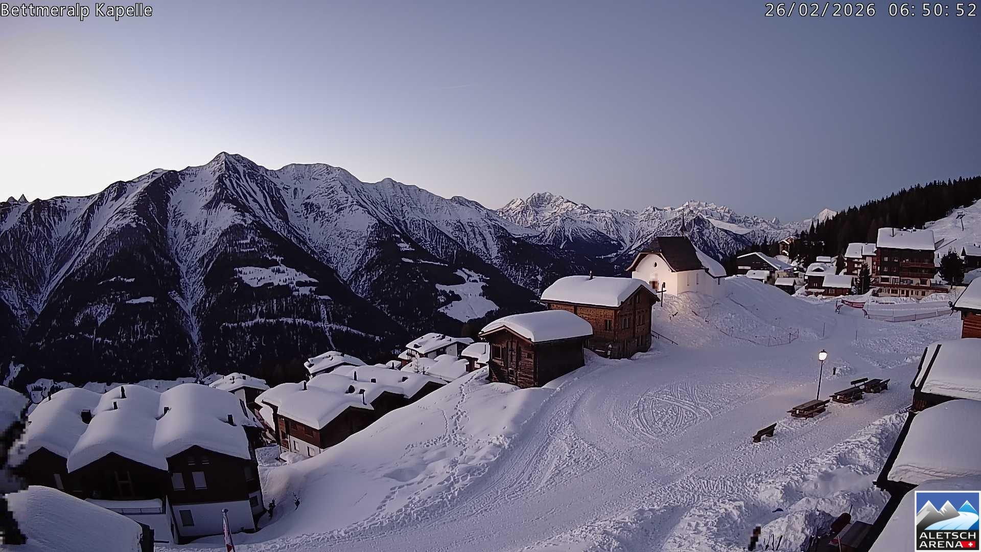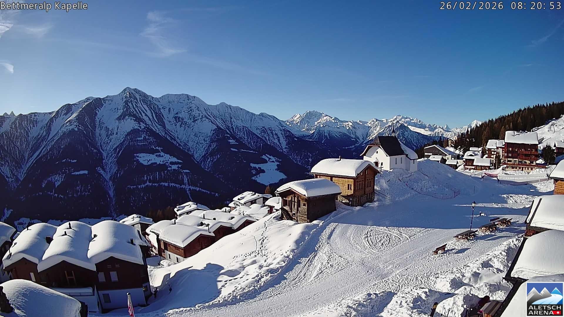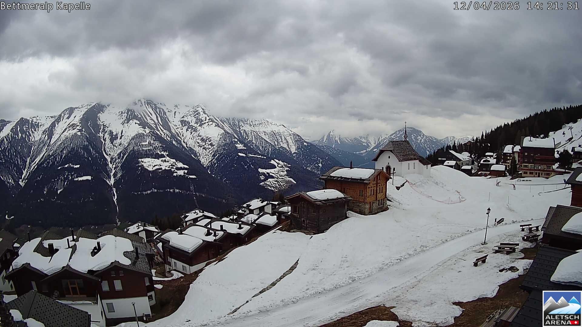 Blick über die Kapelle/Bettmeralp auf die Viertausender des Wallis. Zu sehen ist die Mischabellgruppe mit dem Dom (höchster Gipfel der Schweiz, der komplett auf Schweizer Territorium liegt) und sogar das berühmte Matterhorn.