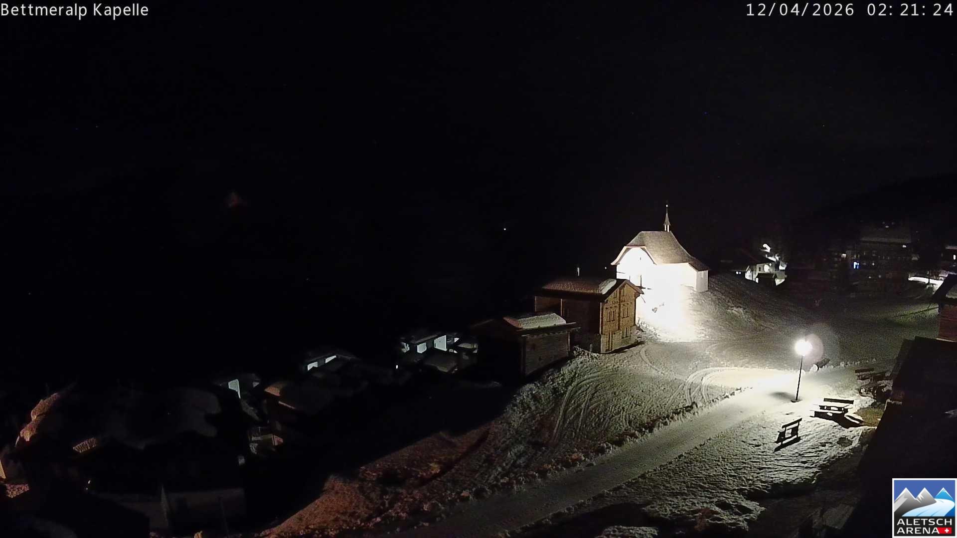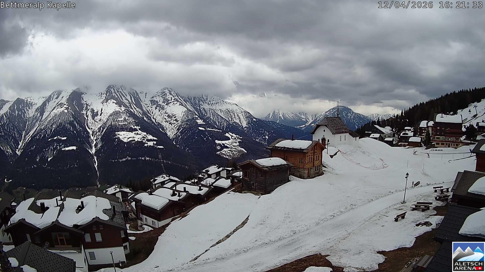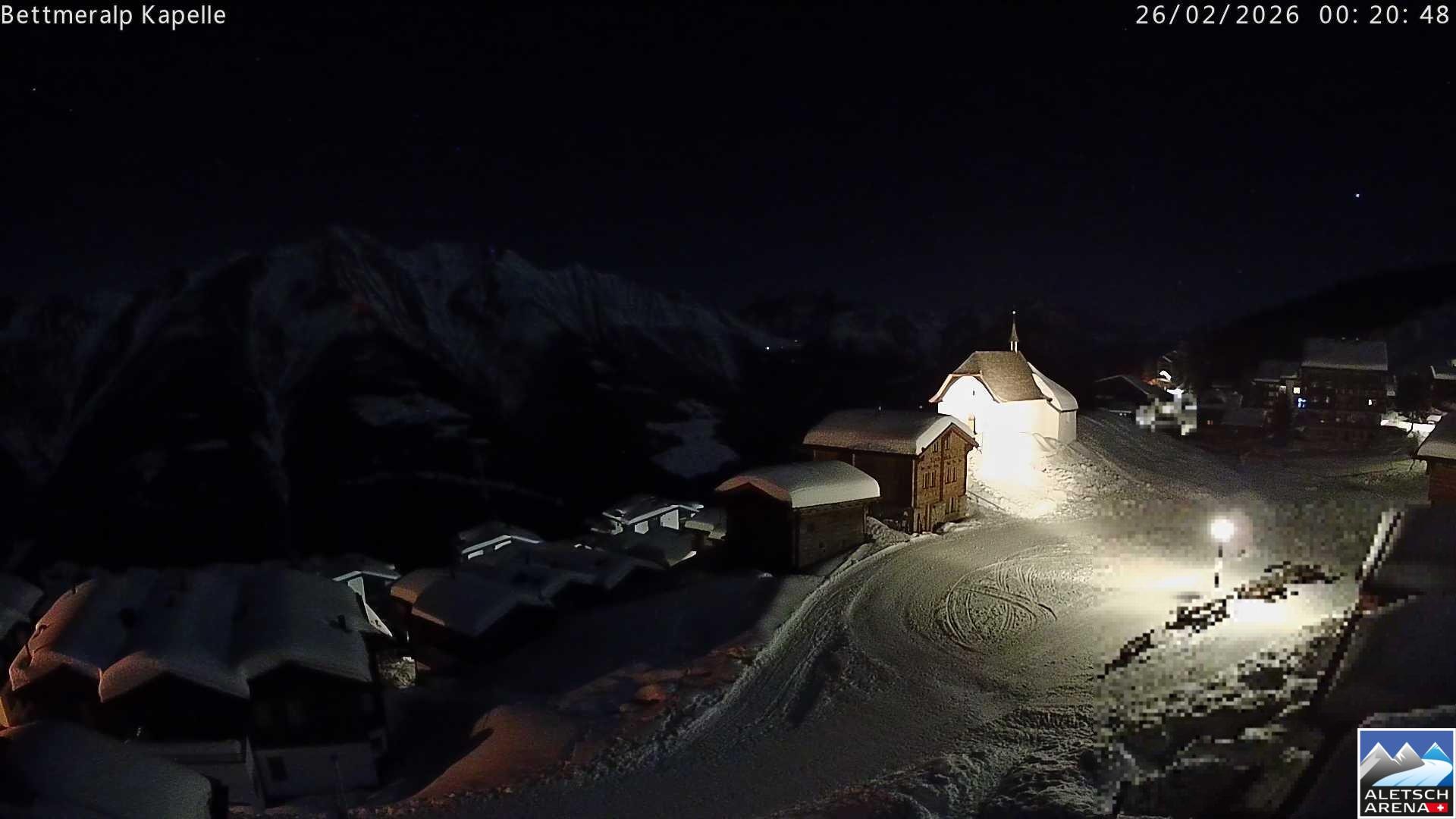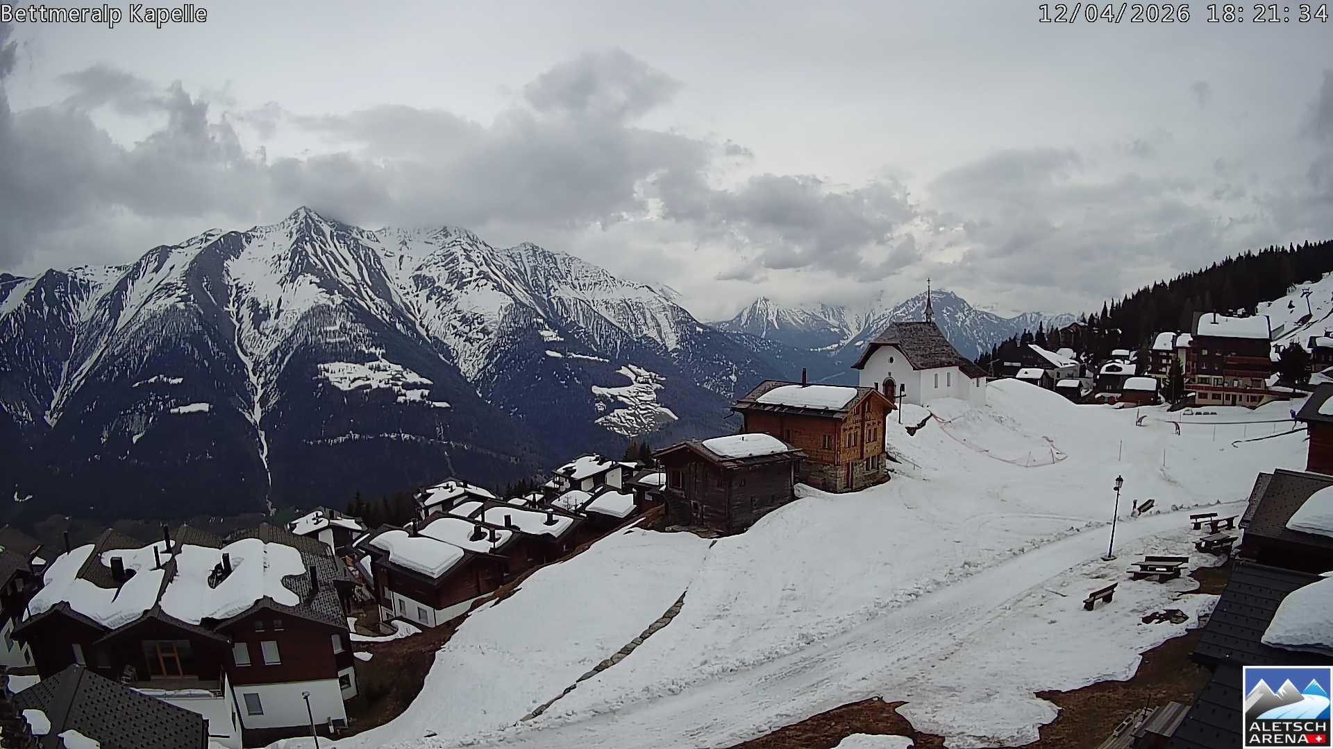 Blick über die Kapelle/Bettmeralp auf die Viertausender des Wallis. Zu sehen ist die Mischabellgruppe mit dem Dom (höchster Gipfel der Schweiz, der komplett auf Schweizer Territorium liegt) und sogar das berühmte Matterhorn.