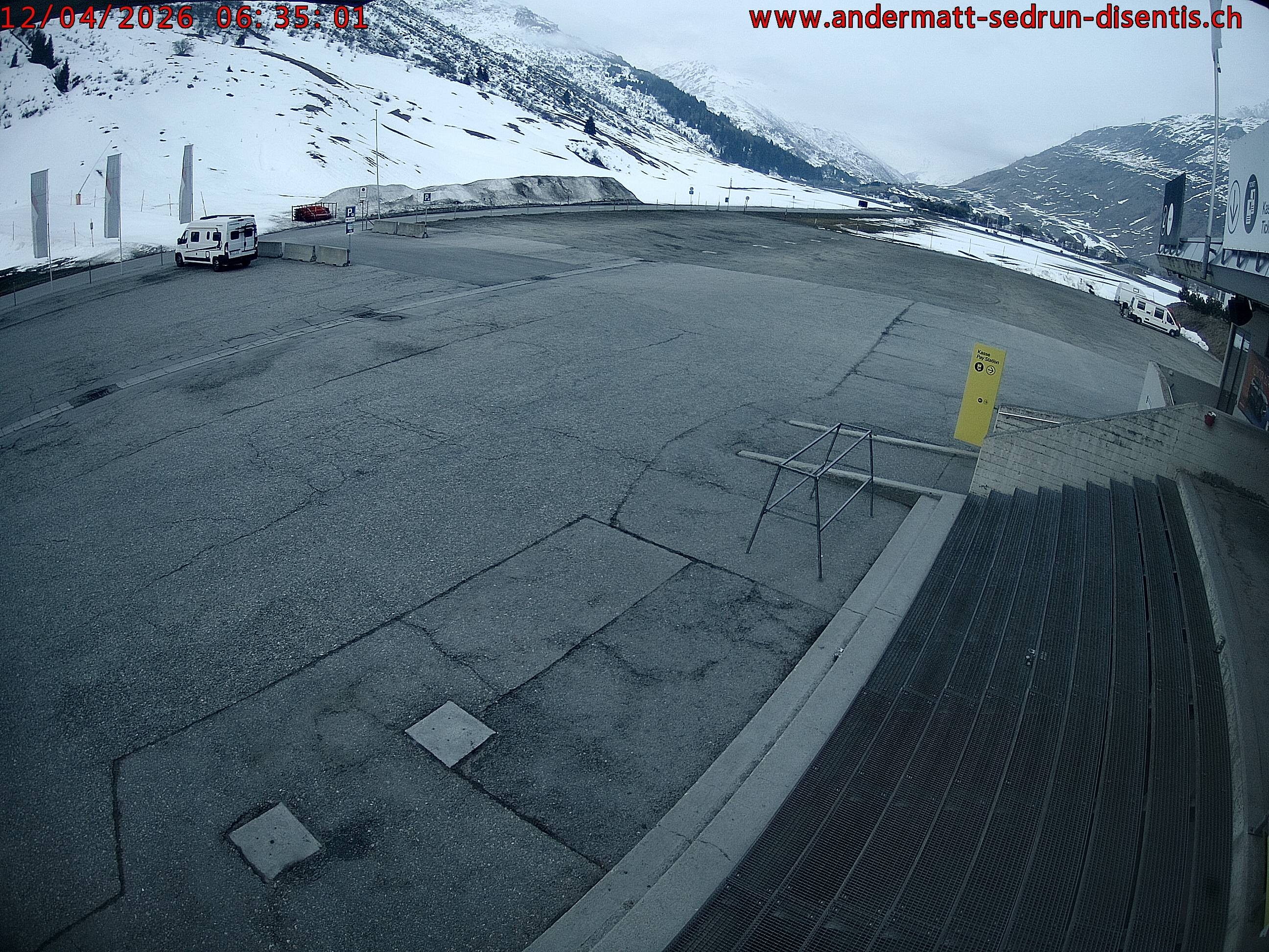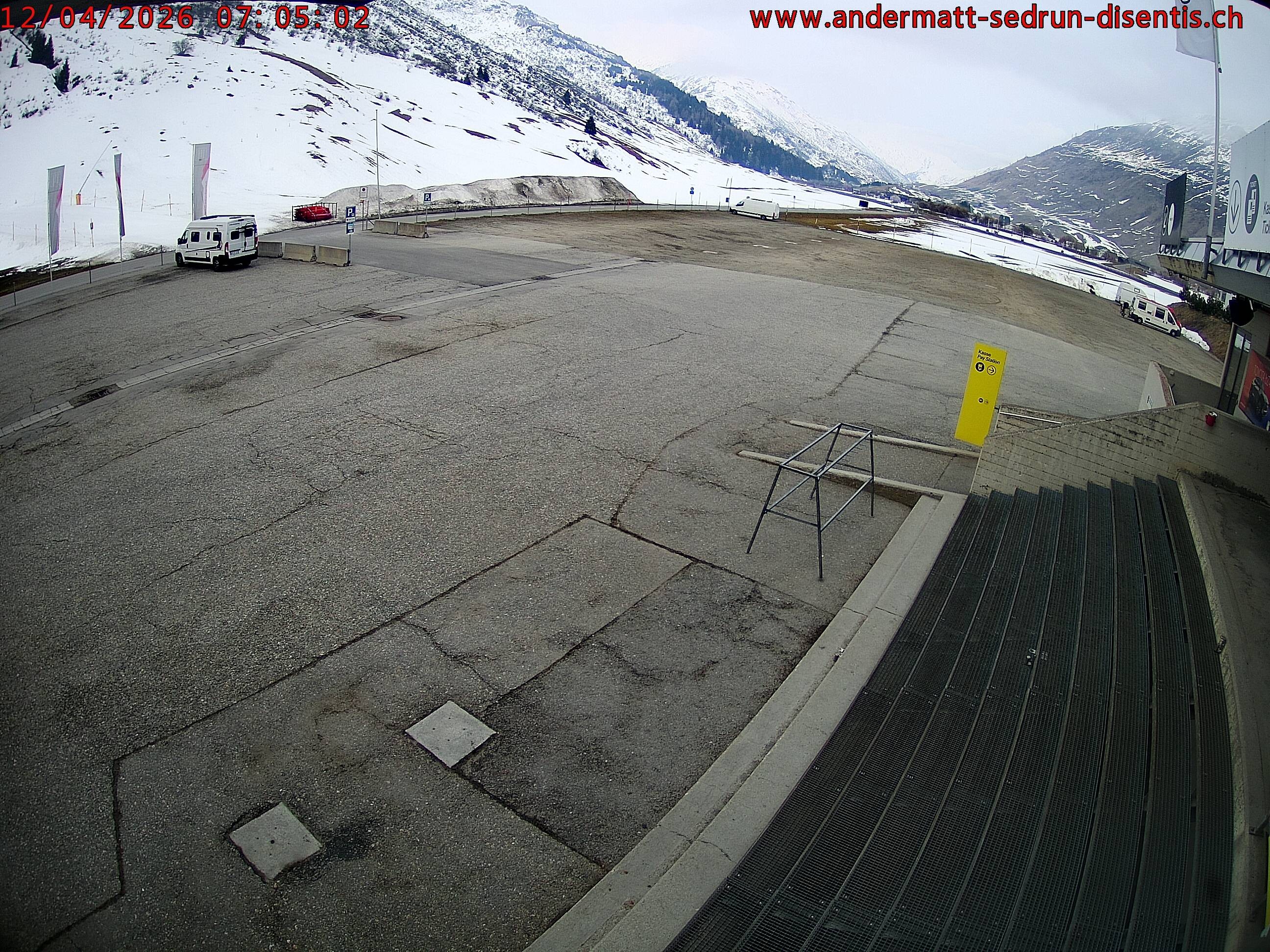 Archiviertes Webcam Bild: Andermatt: Parkplatz Gemsstockbahn am 12.04.2026 um 06:46 Uhr 06:00