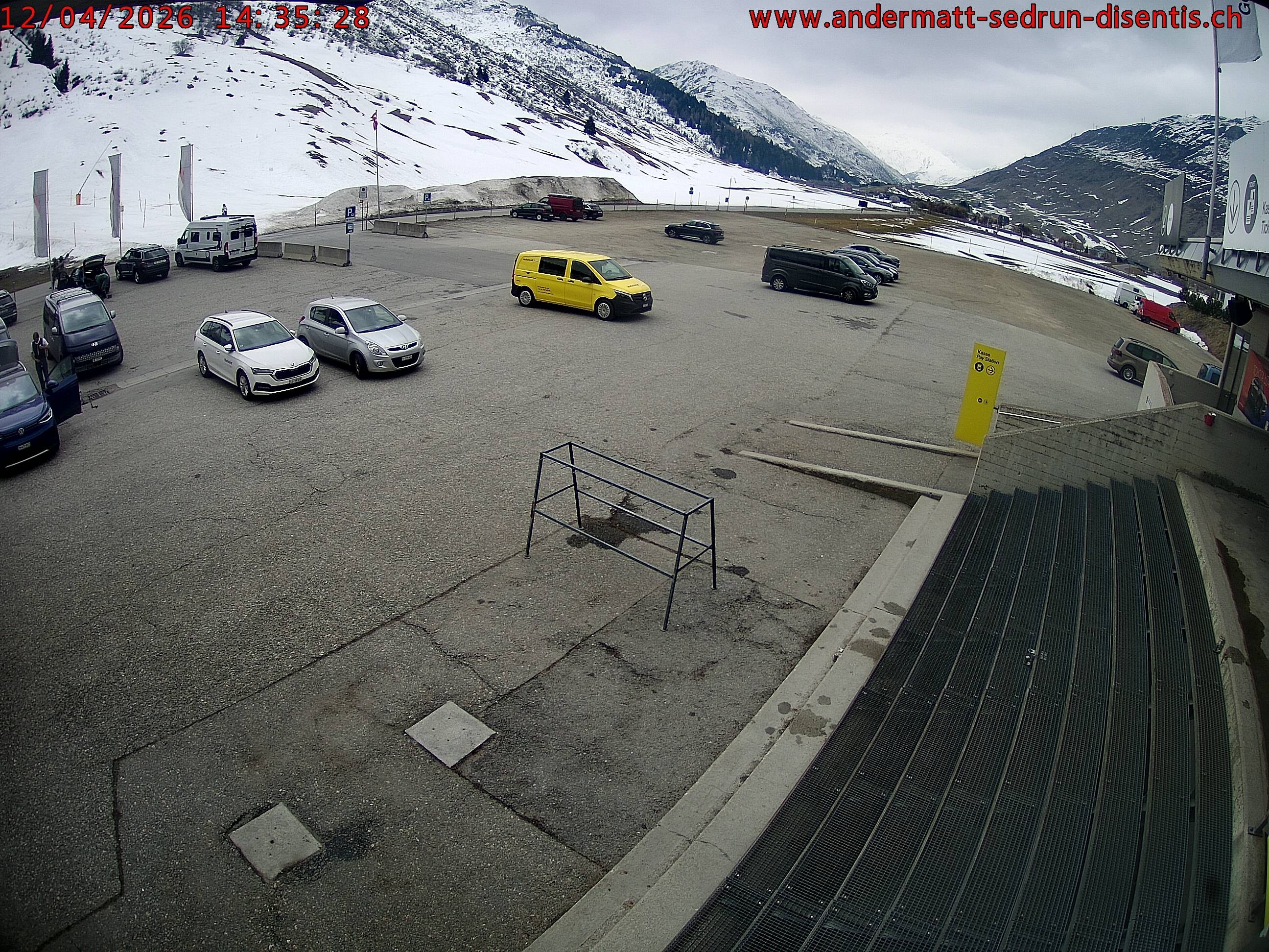 Archiviertes Webcam Bild: Andermatt: Parkplatz Gemsstockbahn am 12.04.2026 um 14:46 Uhr 14:00