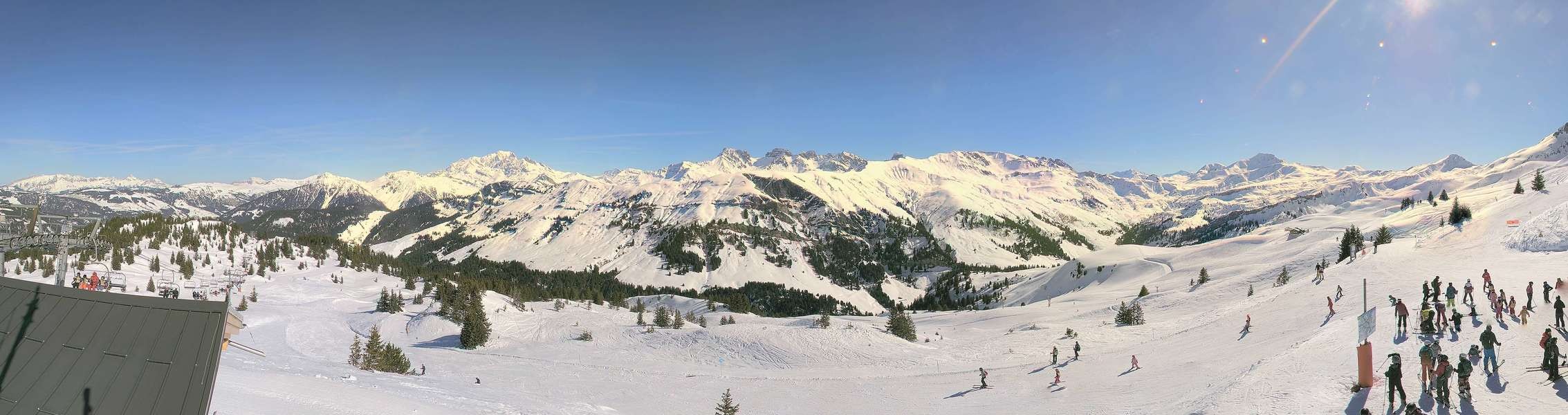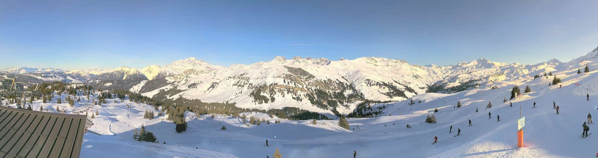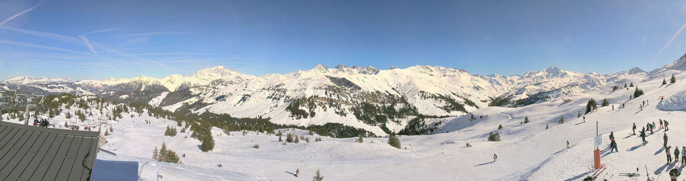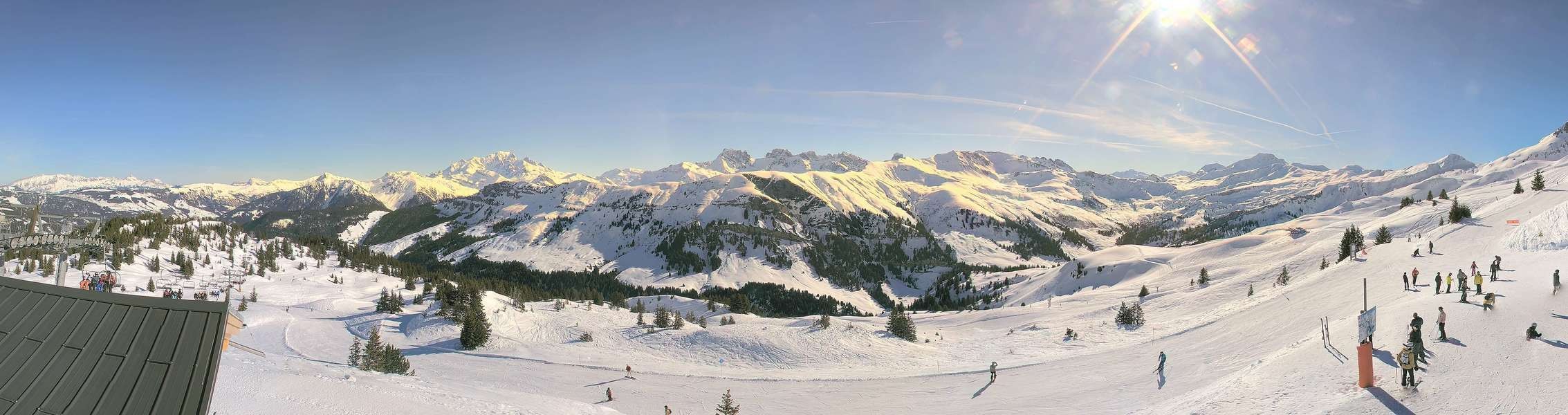 Panoramablick vom höchsten Punkt des Skigebiets Arêches Beaufort bei der Bergstation des Schlepplifts Forclaz.