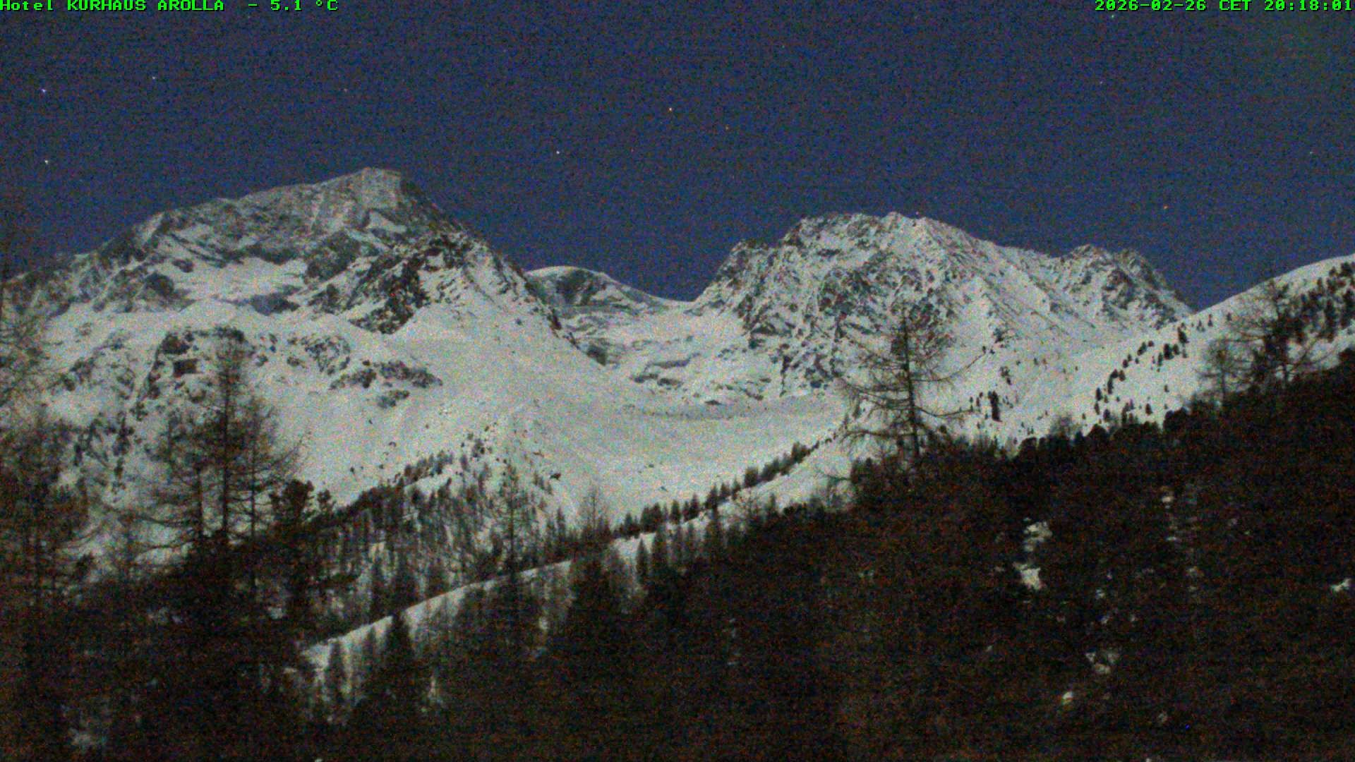 Archiviertes Webcam Bild: Blick vom Kurhaus Arolla in der Gemeinde Evolène am 26 Feb 2026 um 22:06 Uhr Aktuell