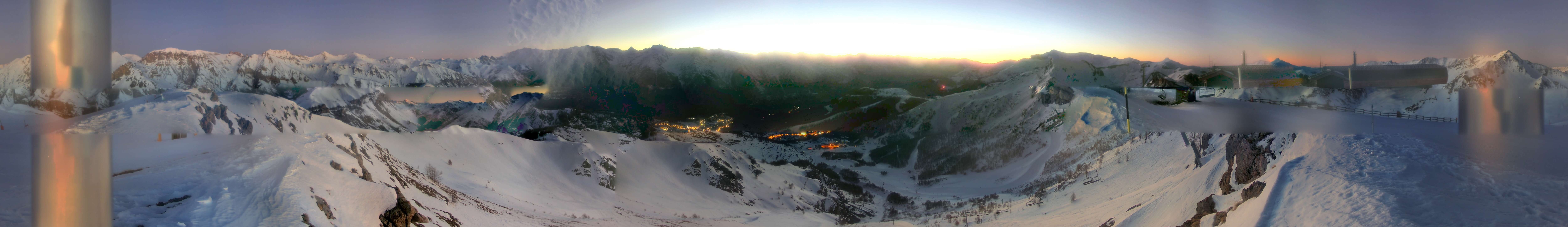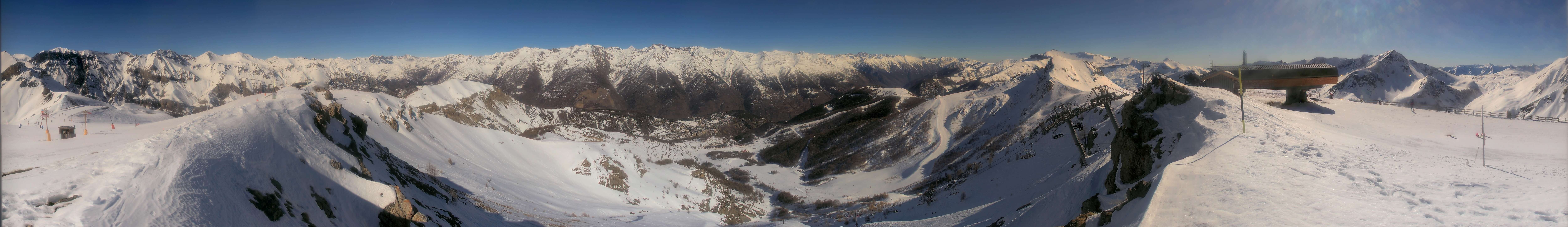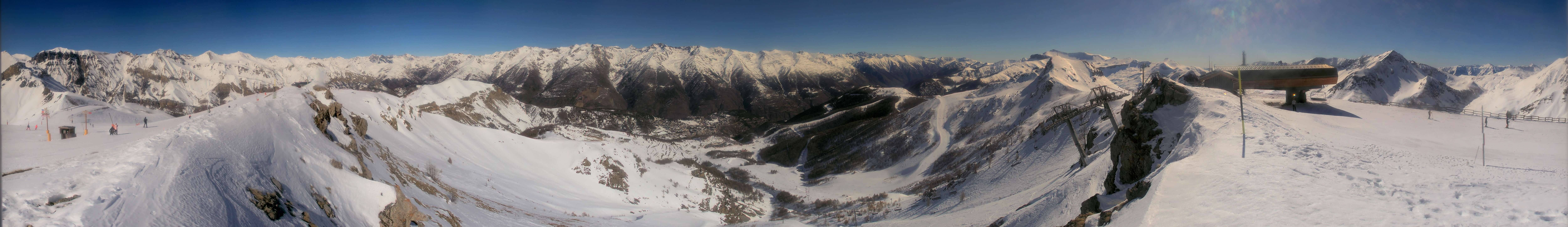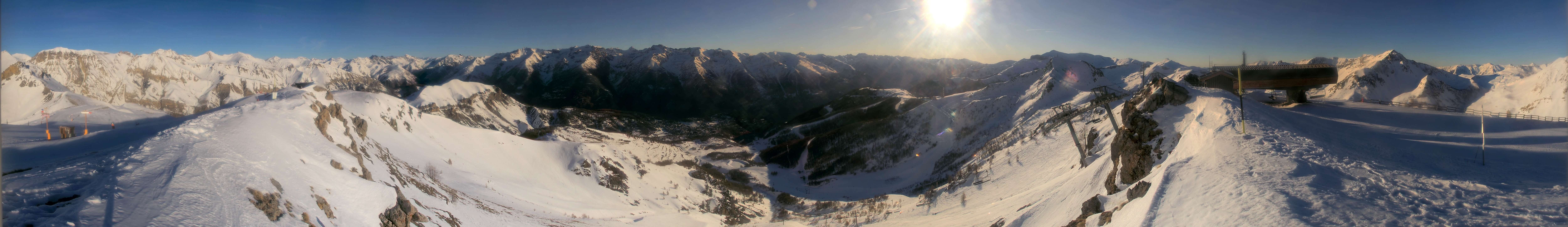 Panoramablick von der Bergstation des 6er-Sessellifts Dôme im Skigebiet Auron.