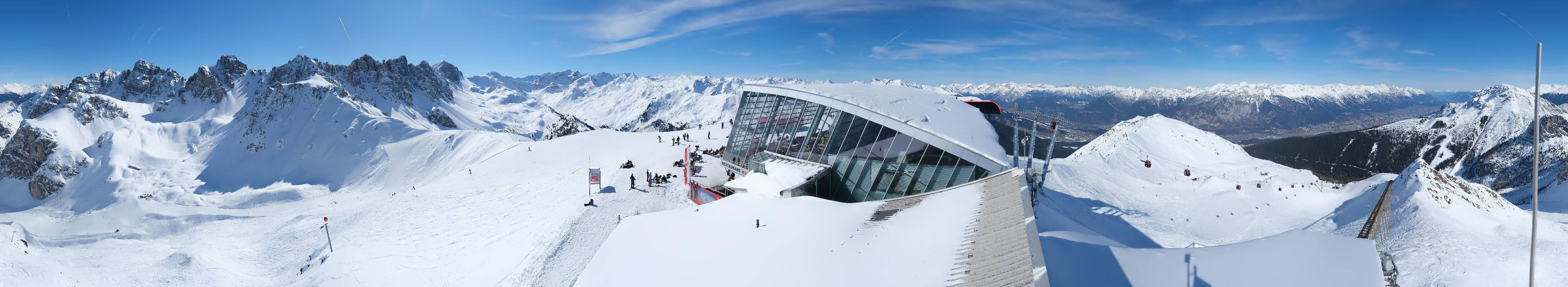 Panoramablick vom Dach der Bergstation der Olympiabahn über das Skigebiet Axamer Lizum. Direkt neben der Bahn, auf dem höchsten Punkt des Skigebiets befindet sich das Panoramarestaurant Hoadl-Haus.
