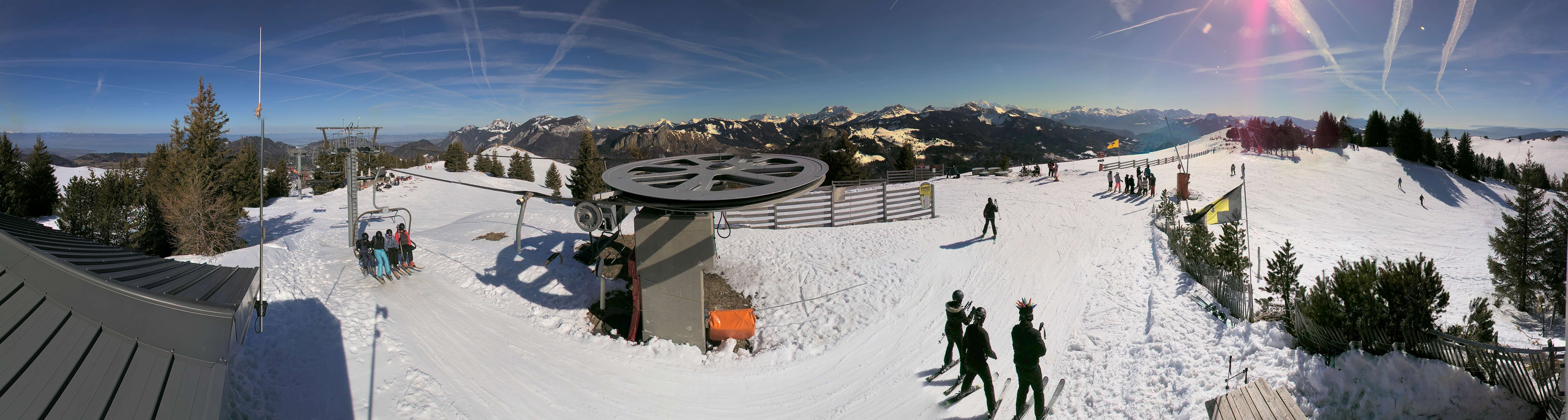 Ausblick von der Bergstation des Télésiège des Crêtes im Skigebiet Bellevaux.