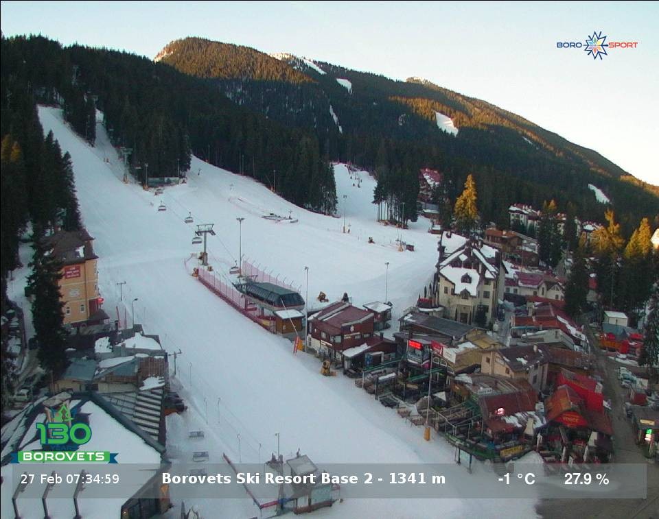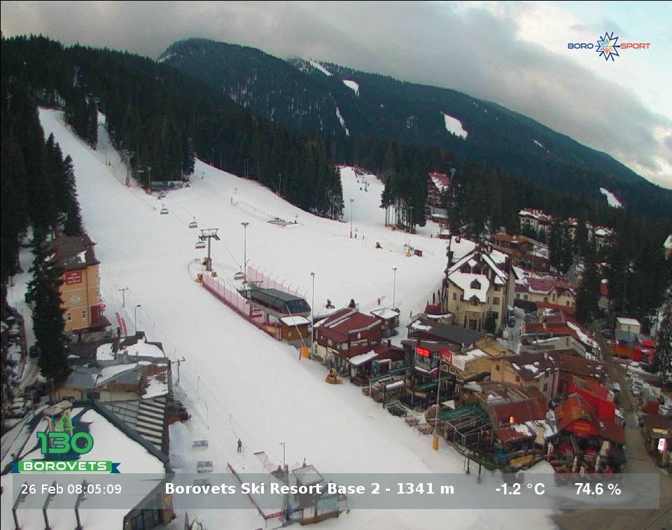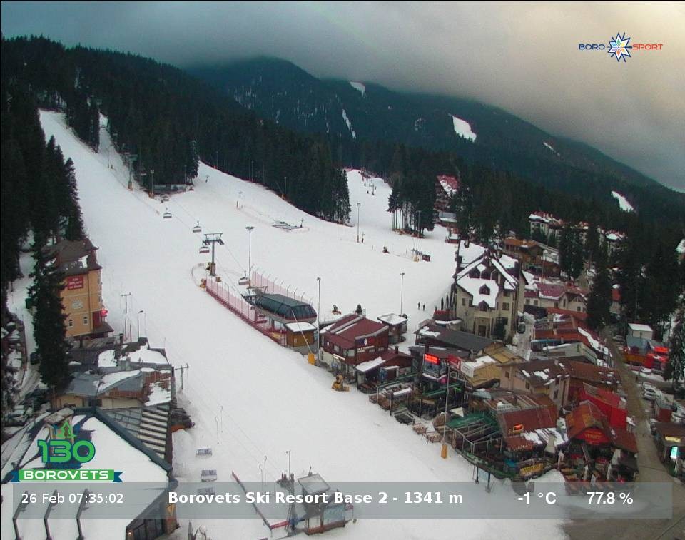 Archived webcam image showing Borovets Base on 26 Feb 2026 at 07:52 07:00