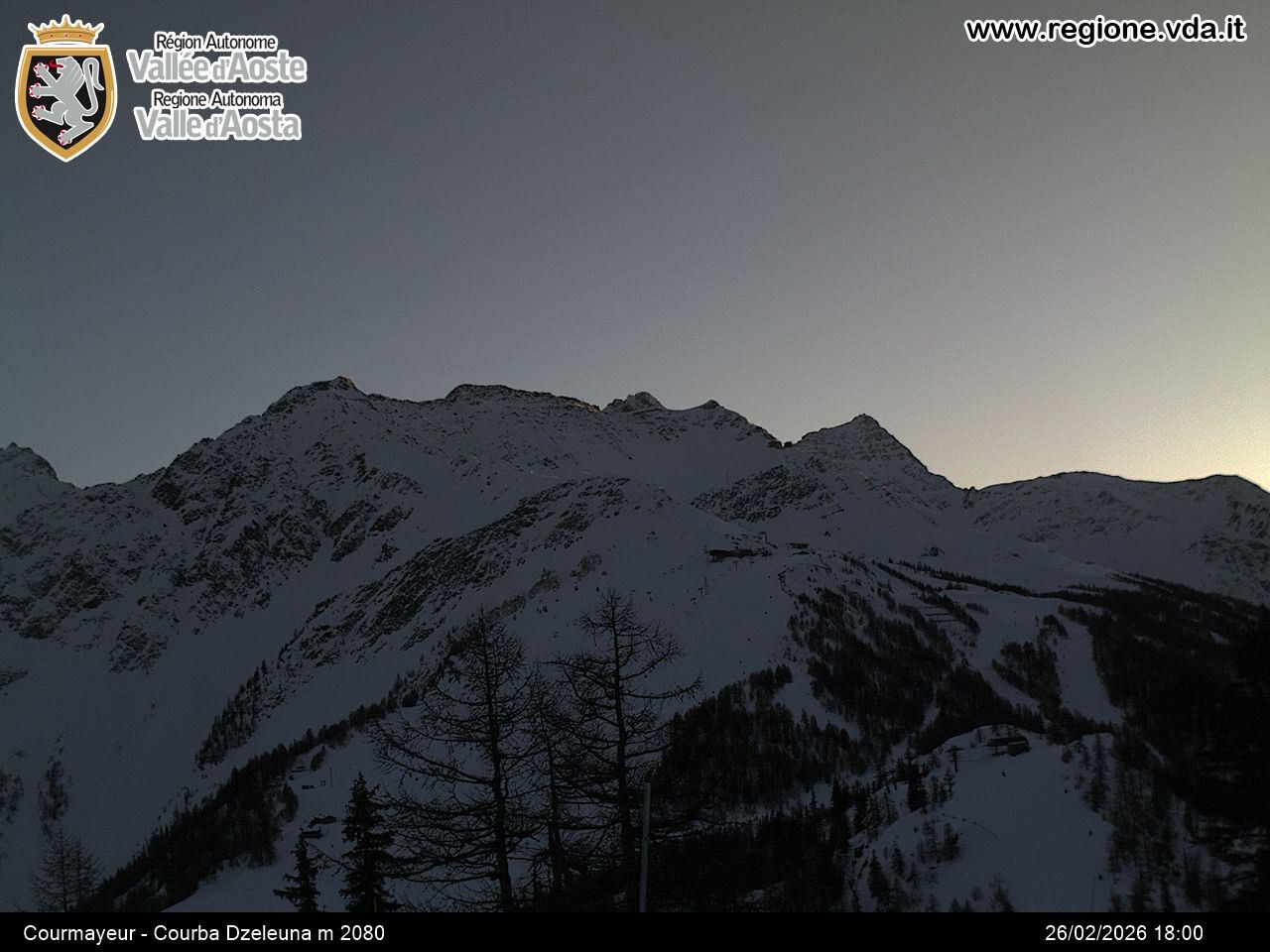 Archiviertes Webcam Bild: Courmayeur - Checrouit am 26 Feb 2026 um 18:44 Uhr Aktuell