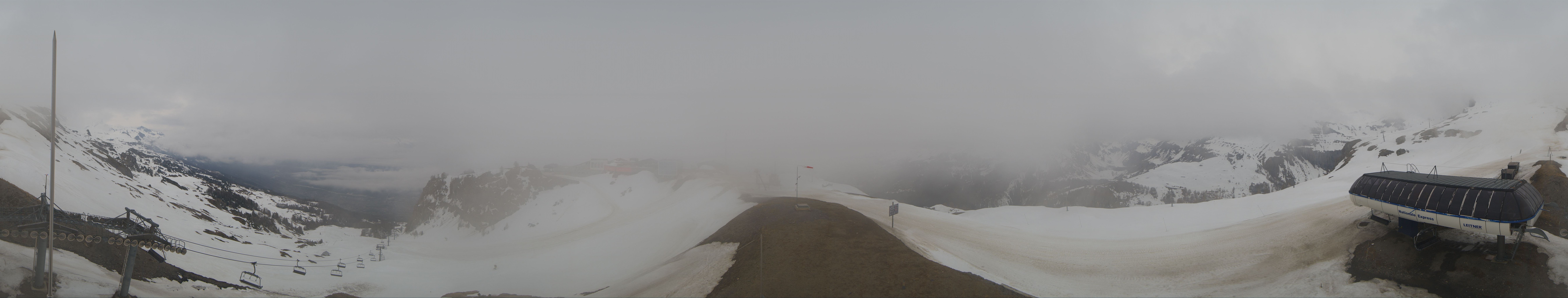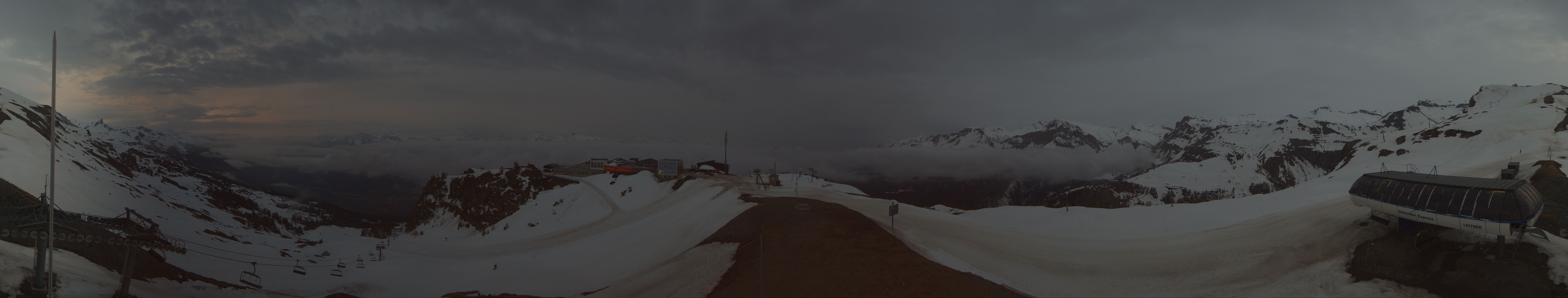 Aussicht von der Bergstation der Sesselbahn Nationale über das Skigebiet von Crans Montana. Im Hintergrund sieht man den Alpenhauptkamm mit den Viertausendern des Wallis.