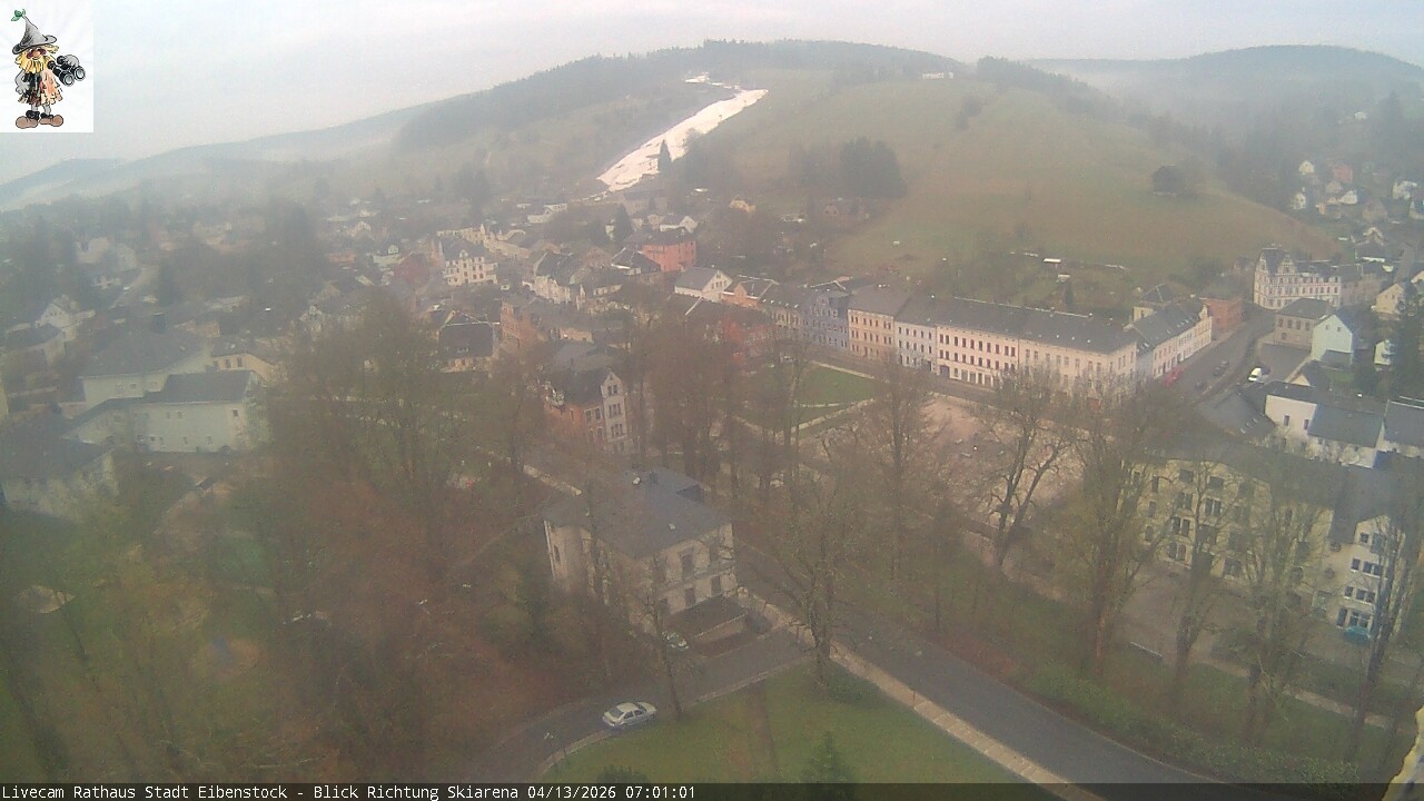 Hier zu sehen ist der Blick vom Rathaus in Eibenstock auf den Skihang bei Wurzelrudis Erlebniswelt. Das Skigebiet liegt mitten im Erzgebirge südlich der Stadt Eibenstock und befindet sich am Nordhang des Adlerfelsen.
