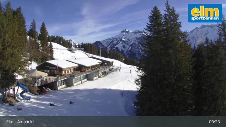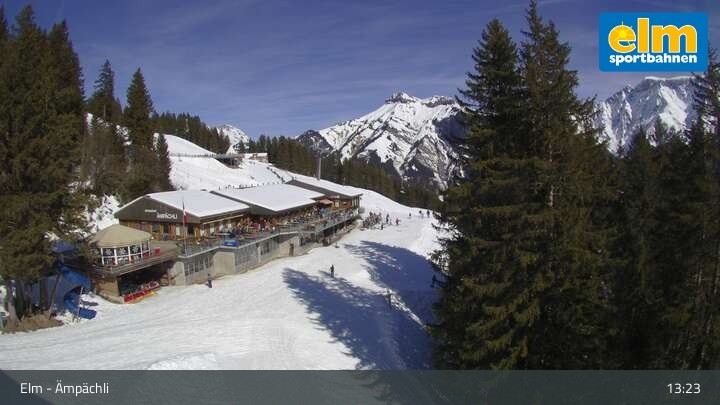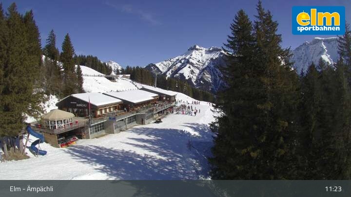 Die Webcam blickt auf das Bergrestaurant Ämpächli in Elm. Hungrige Skifahrer stärken sich hier unter anderem an einer Pasta-Station und einem Salatbuffet. Direkt daneben befindet sich das Übungsareal für Kinder.