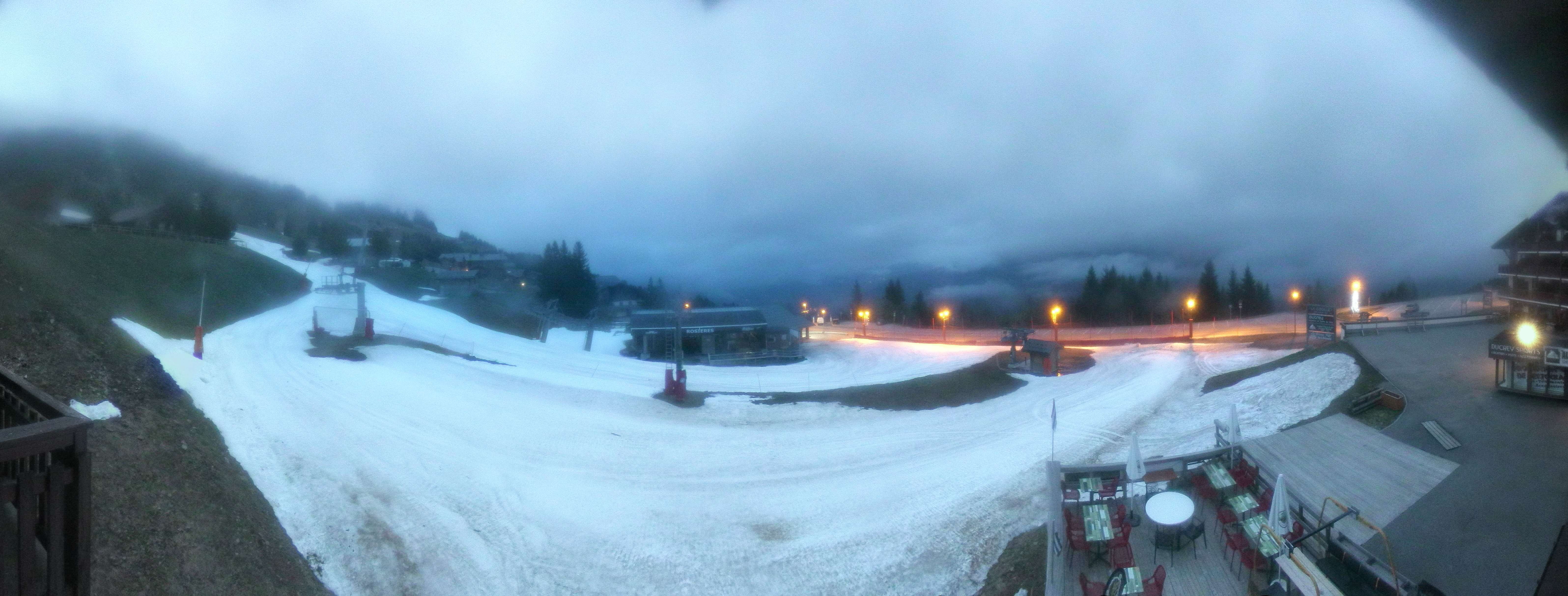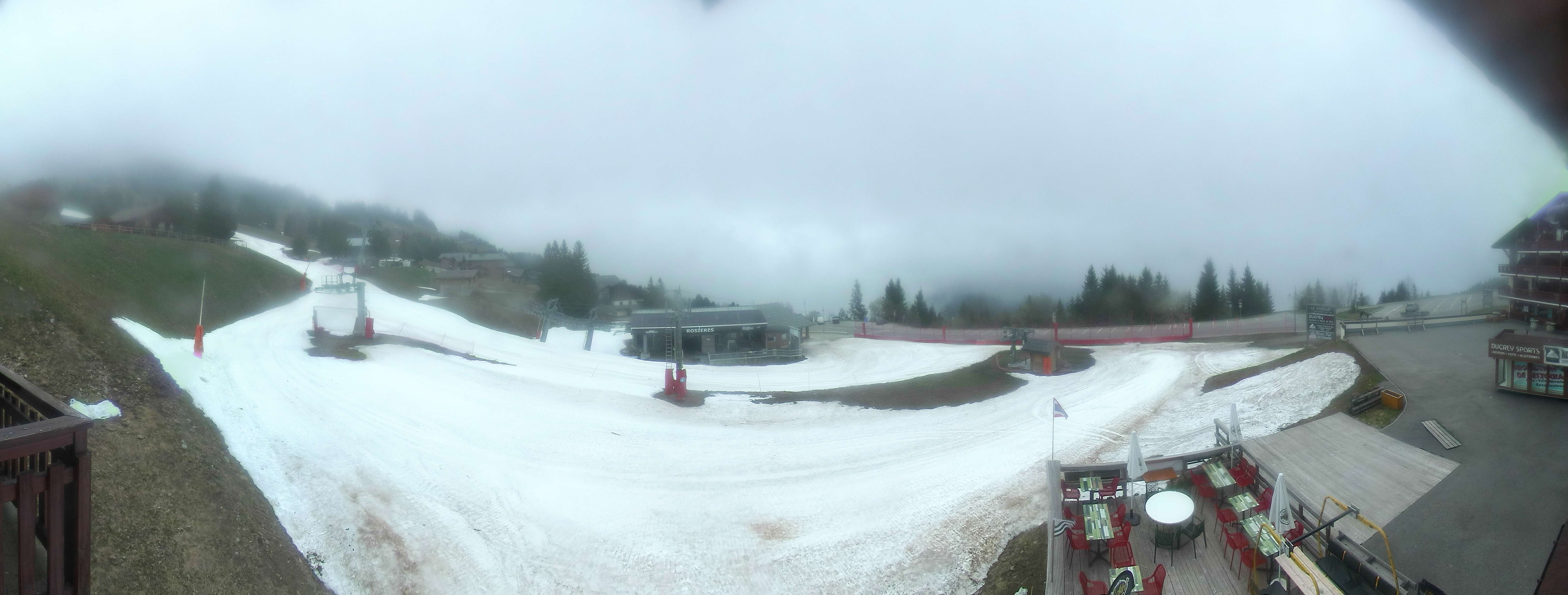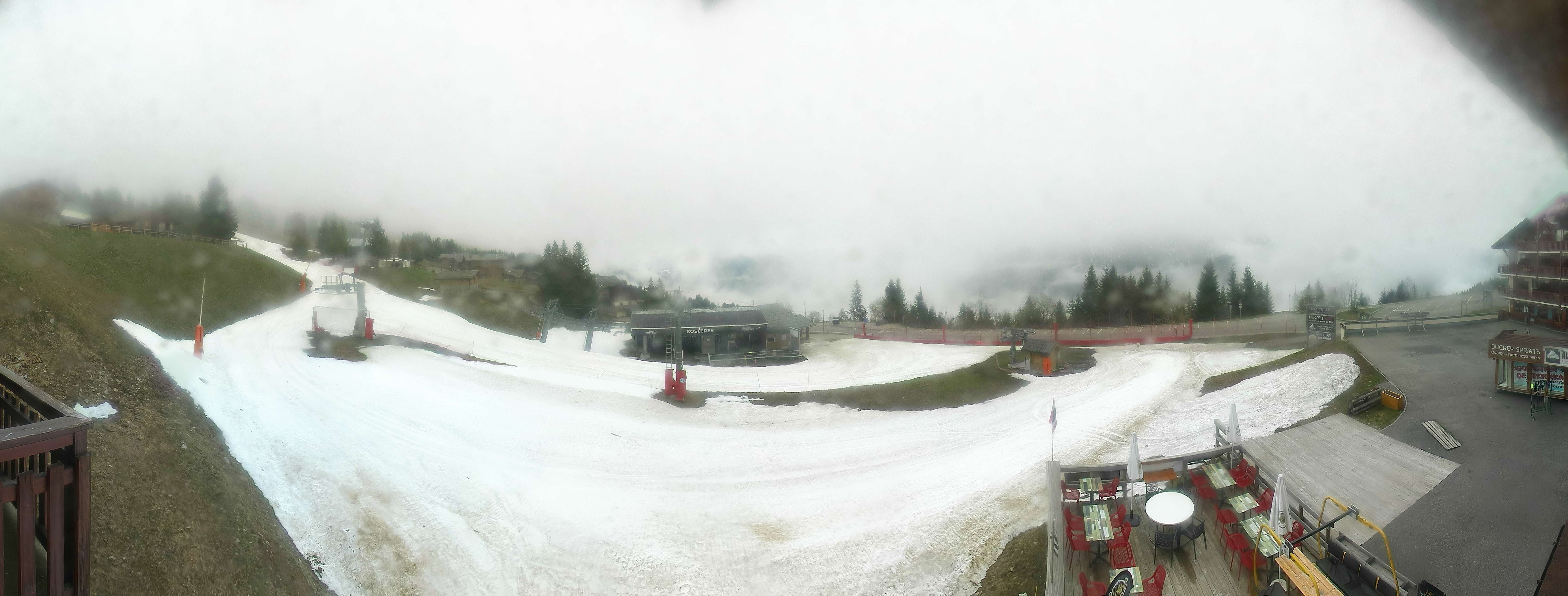 Blick auf die Pisten des Skigebiets Espace Diamant am Bisanne 1500. Im Vordergrund ist die Talstation des Sessellifts Rosières zu sehen, im Hintergrund erkennt man die Berge Mont Blanc (4.810m), Rocher du Vent (2.360m), Aiguille du Grand Fond (2.920m), Pierra Menta (2.714m) und Mont Mirantin (2.460m).