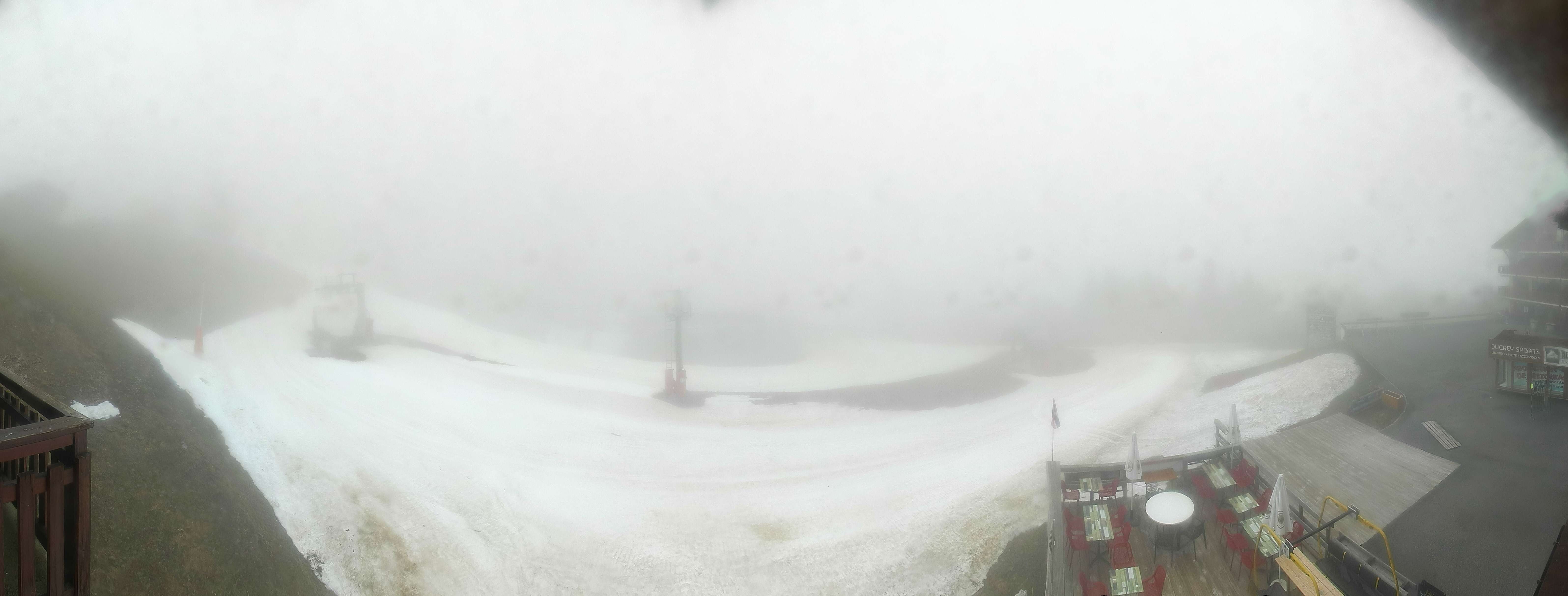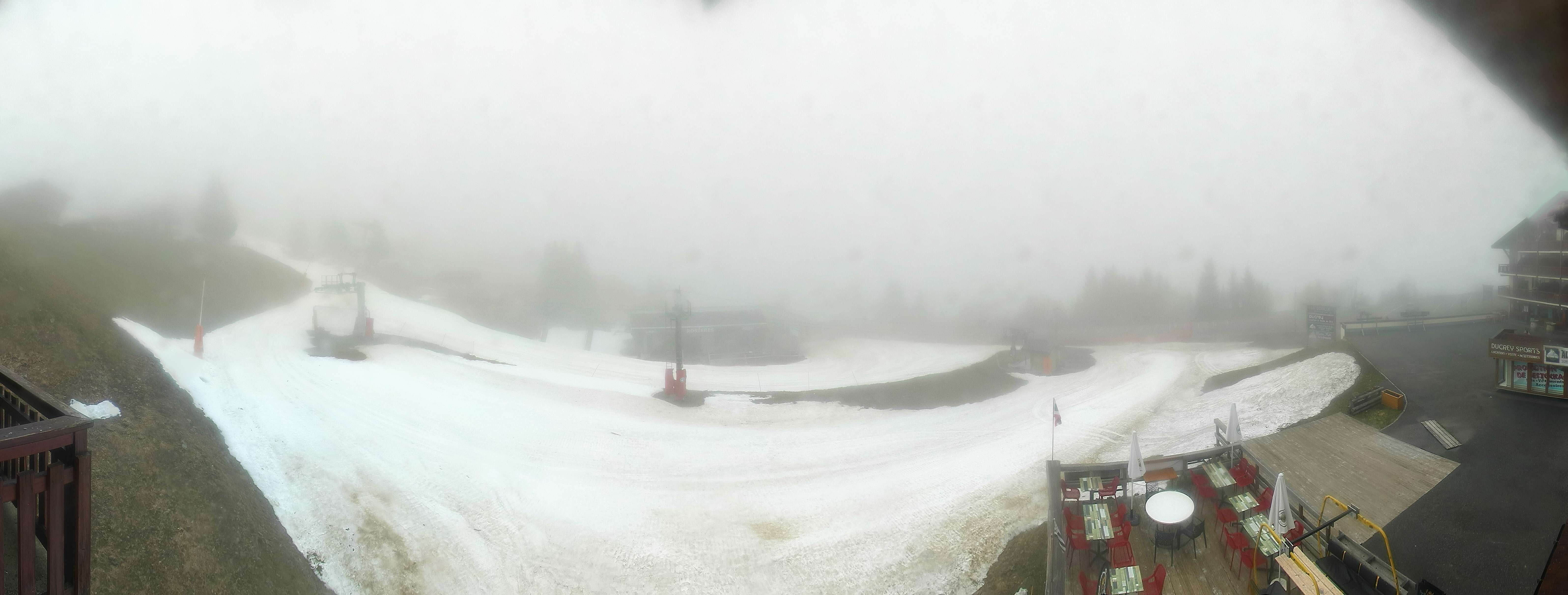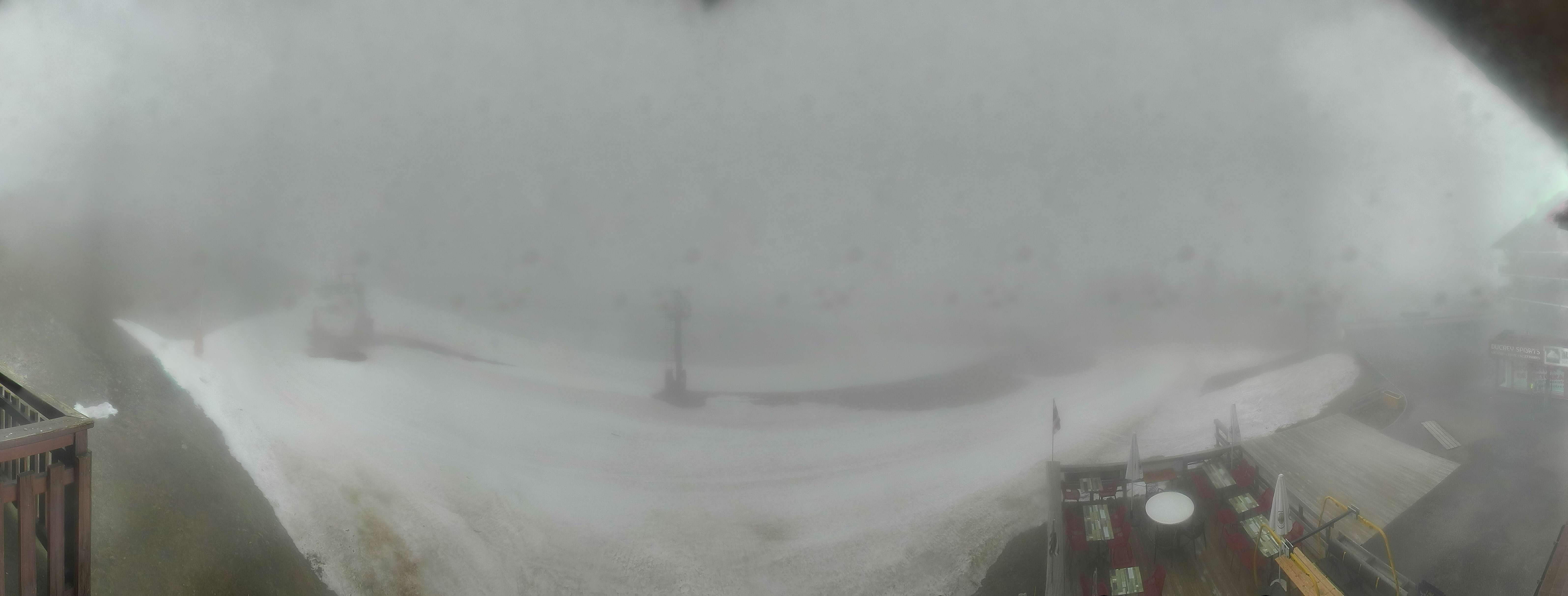 Blick auf die Pisten des Skigebiets Espace Diamant am Bisanne 1500. Im Vordergrund ist die Talstation des Sessellifts Rosières zu sehen, im Hintergrund erkennt man die Berge Mont Blanc (4.810m), Rocher du Vent (2.360m), Aiguille du Grand Fond (2.920m), Pierra Menta (2.714m) und Mont Mirantin (2.460m).