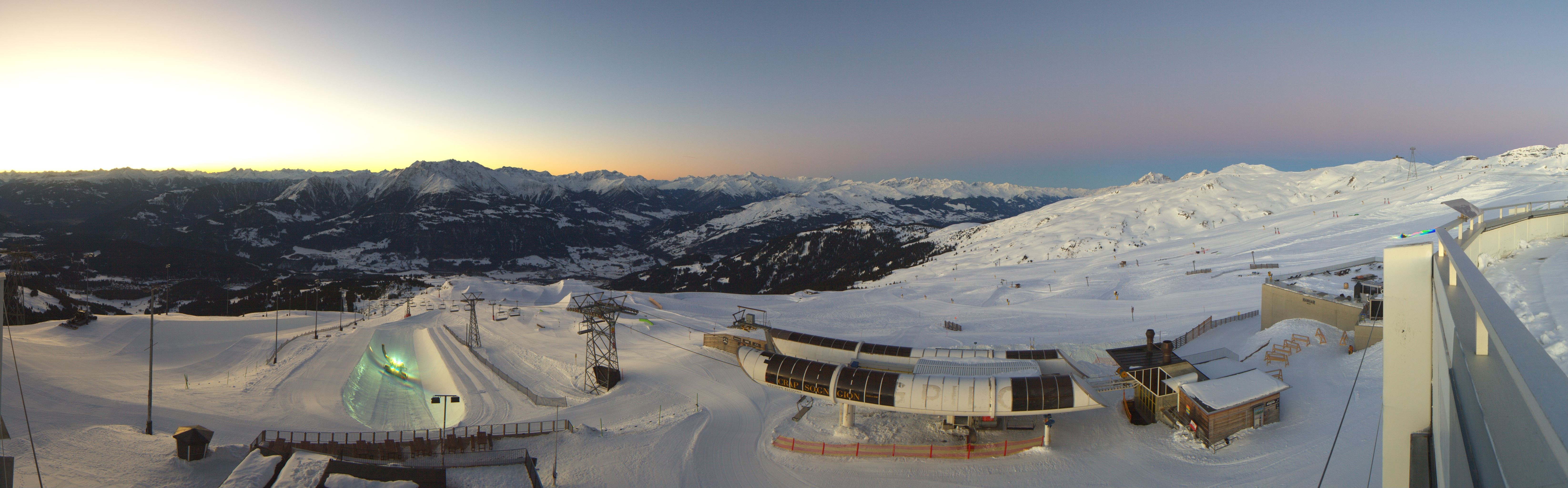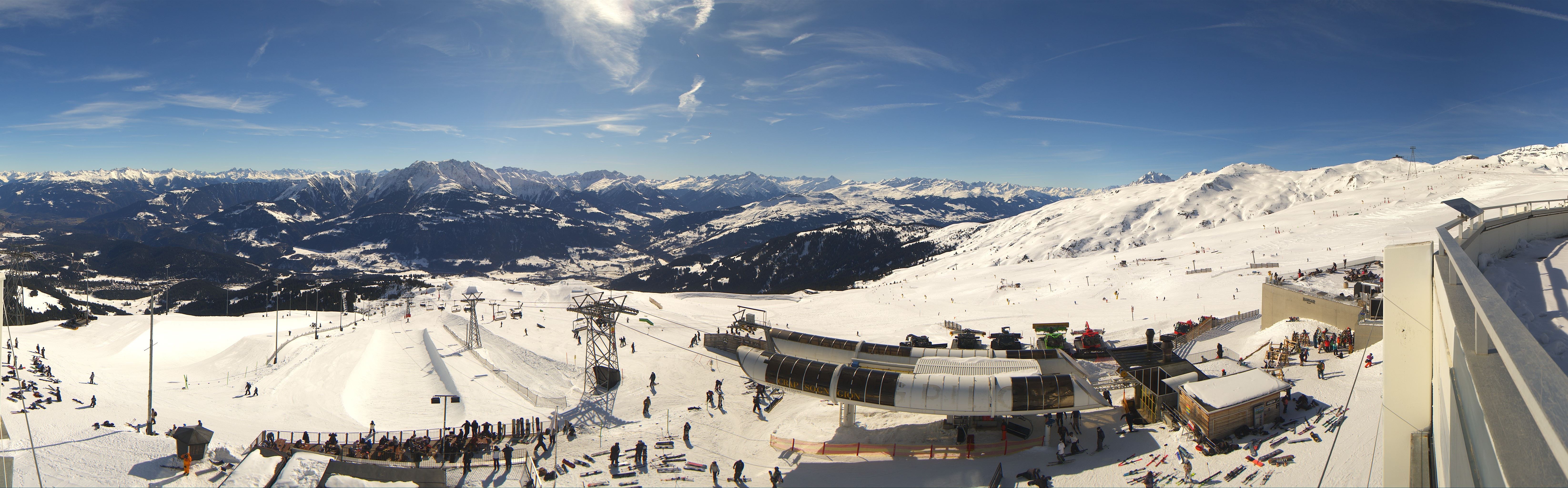 Direkt an der Bergstation des Curnius Sessellifts im Schweizer Skigebiet Laax gelegen, bietet die Roundshot-Cam einen fantastischen 360-Grad-Blick auf den Snowpark am Crap Sogn Gion.