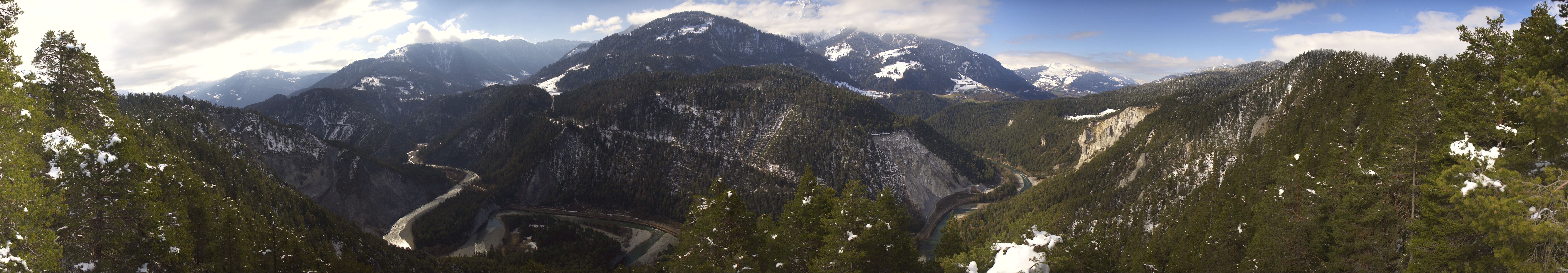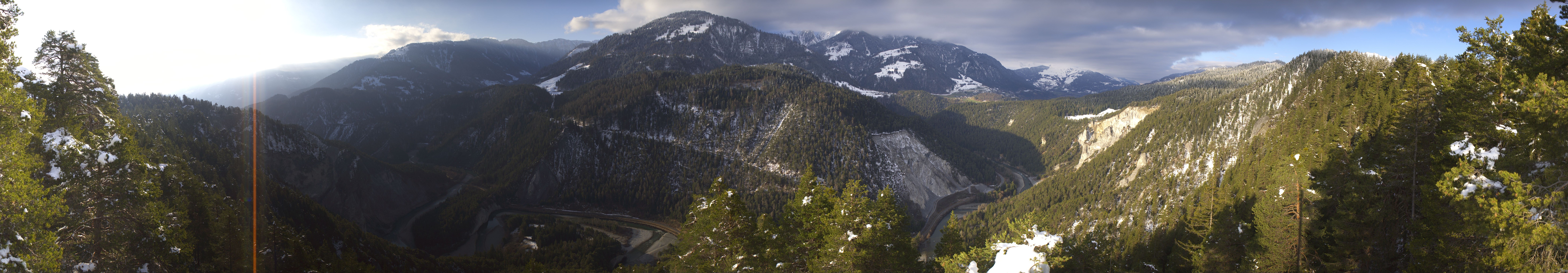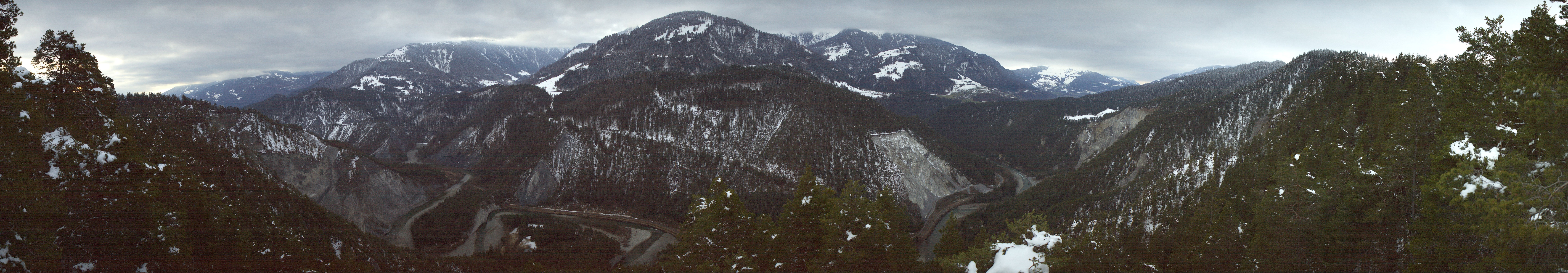 Panoramablick über die Rheinschlucht südöstlich vom Skigebiet Laax Flims. Die Schlucht ist auch als der Swiss Grand Canyon bekannt.