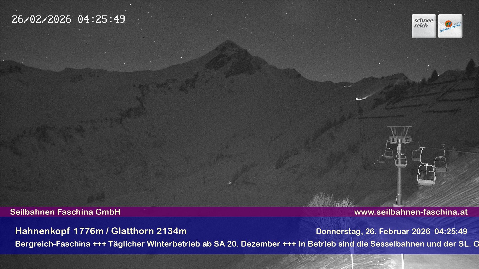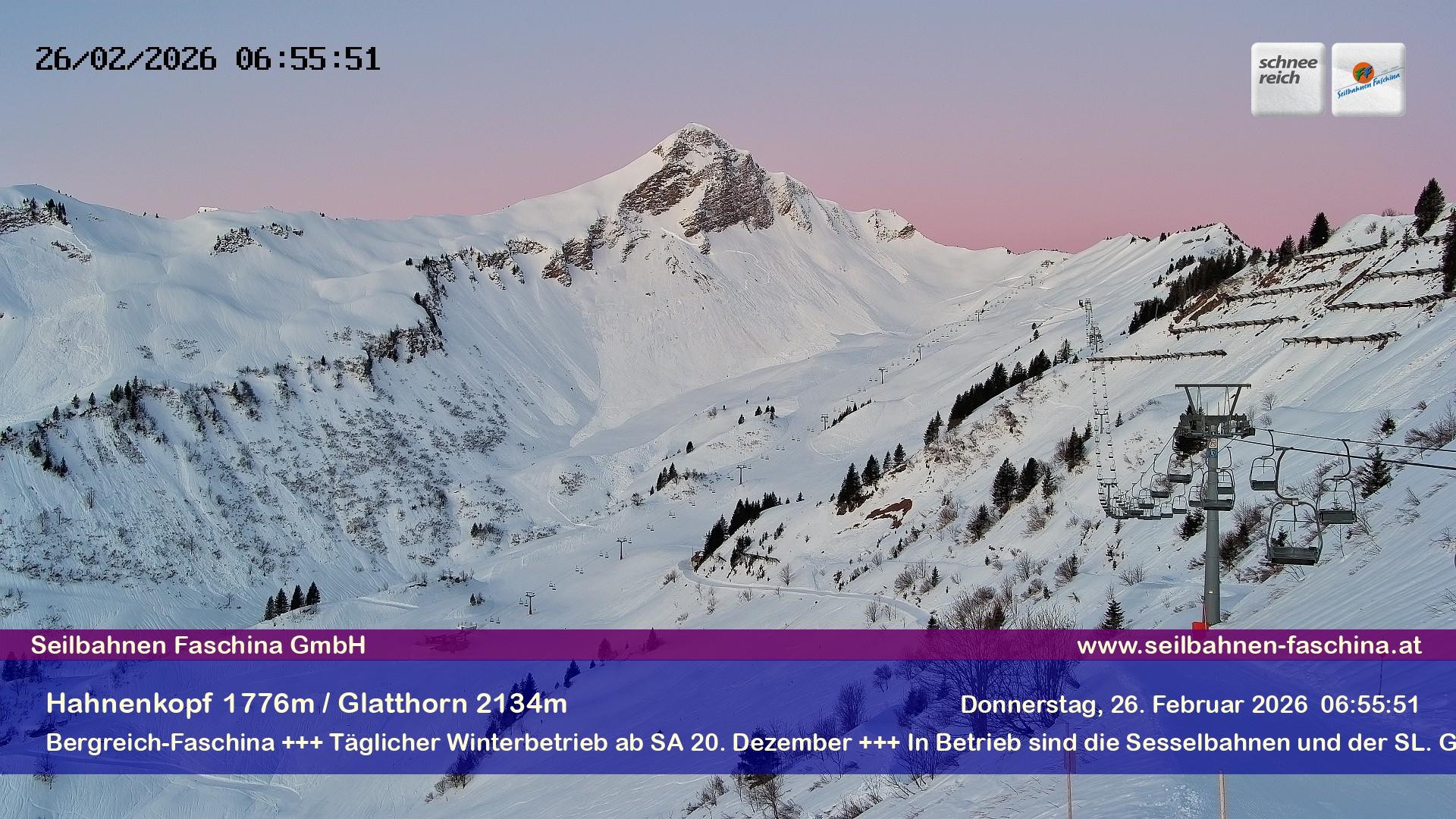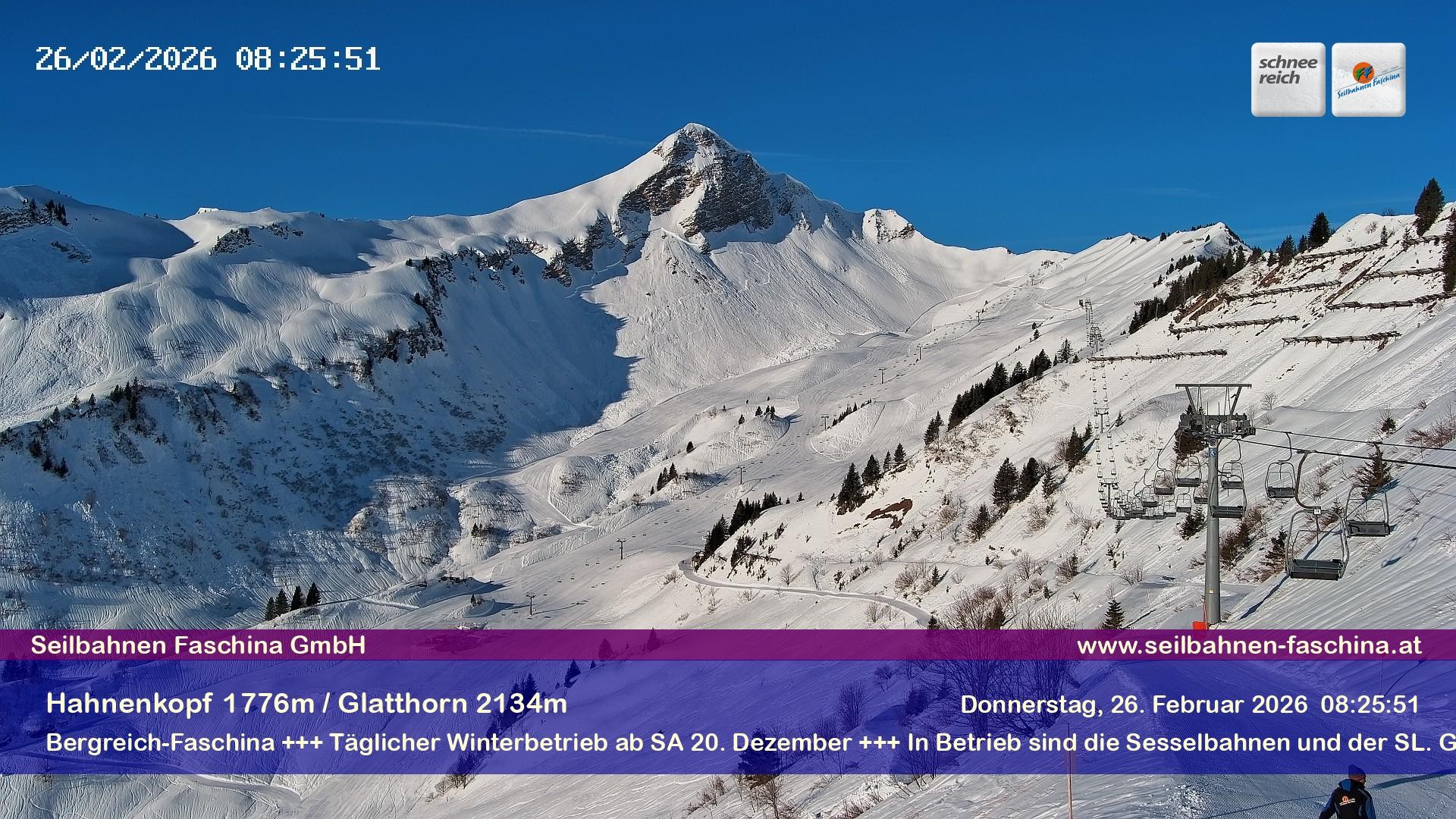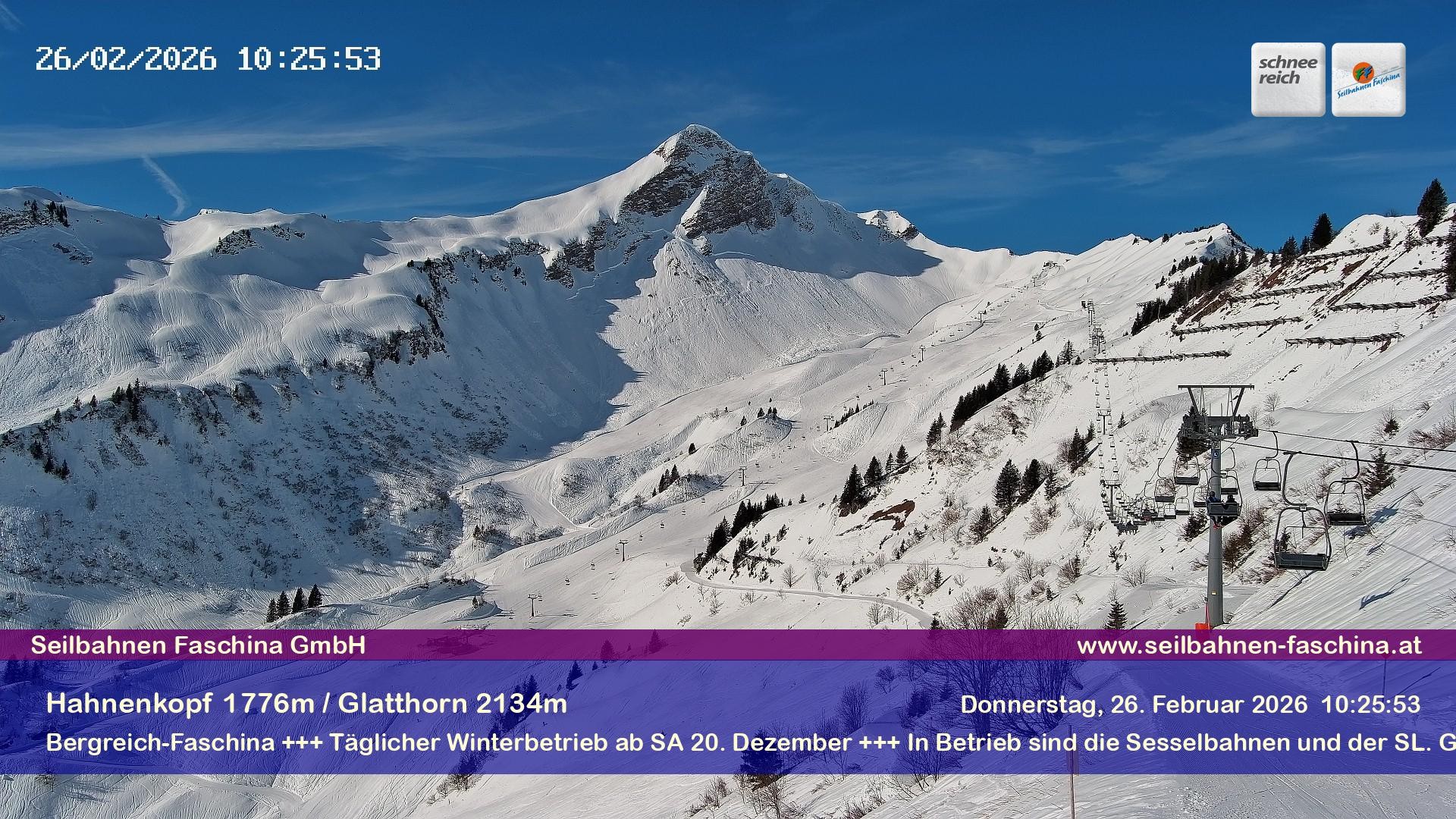 Webcam auf 1776 Meter im Skigebiet Faschina. Der Blick richtet sich zur Glatthornbahn.
