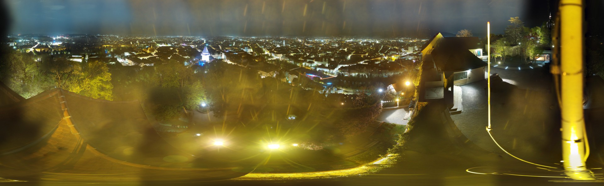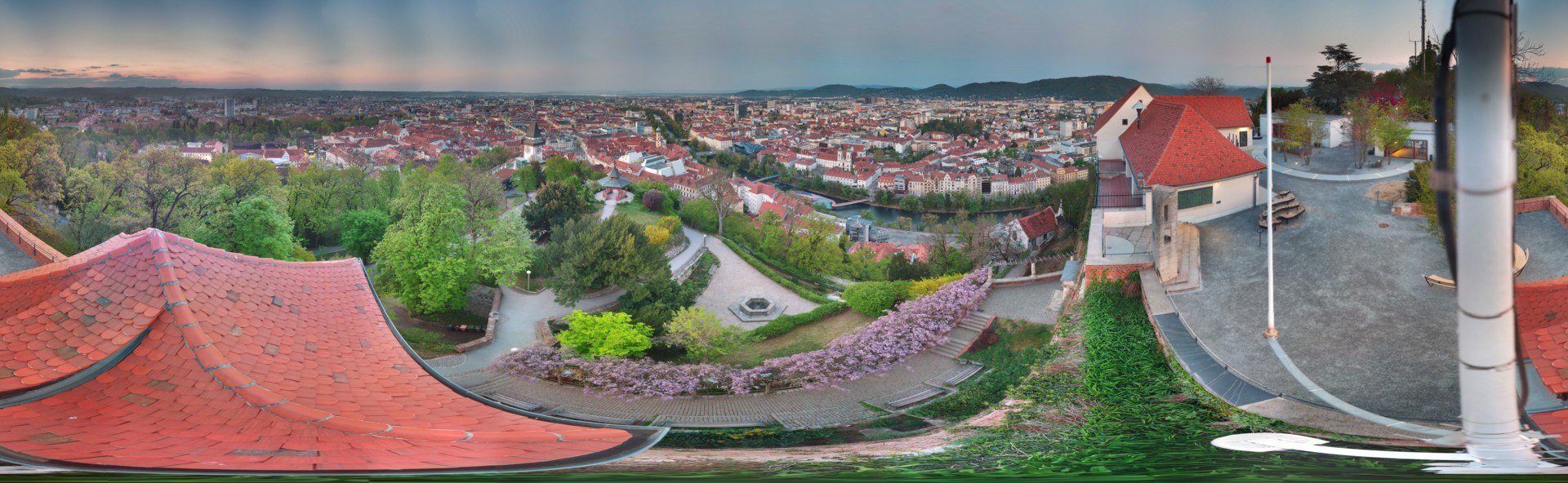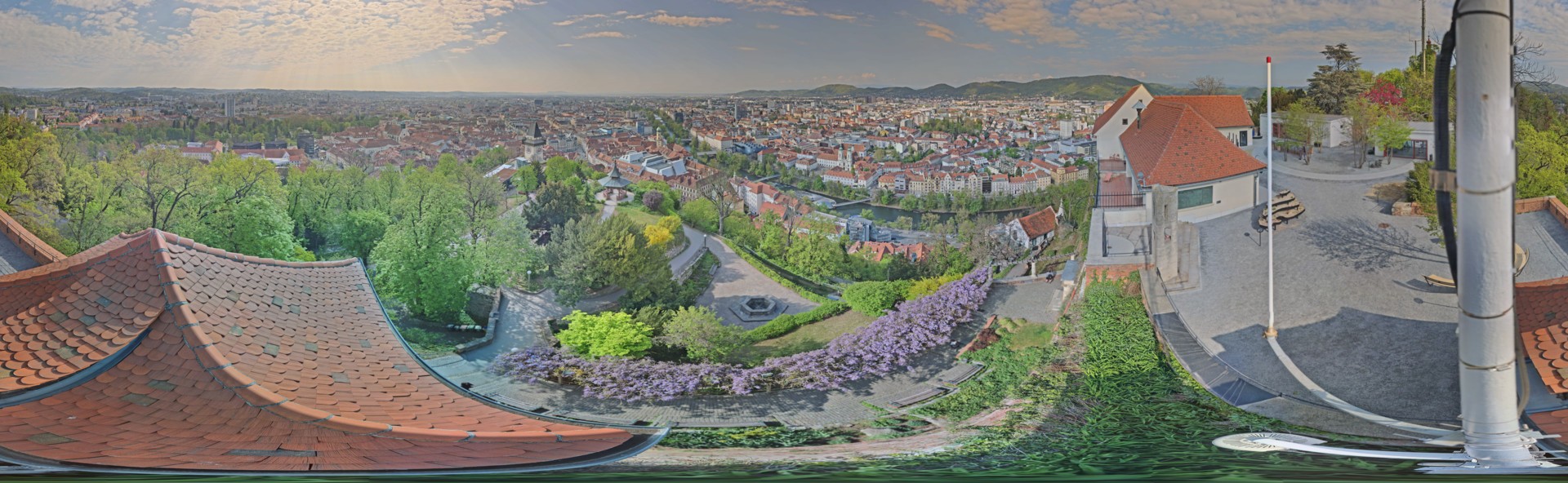 Blick von der auf dem Schlossberg in Graz positionierten Panorama-Webcam. Gut zu erkennen ist unter anderem der Uhrenturm und das Kunsthaus mit seiner ausgefallenen Architektur.