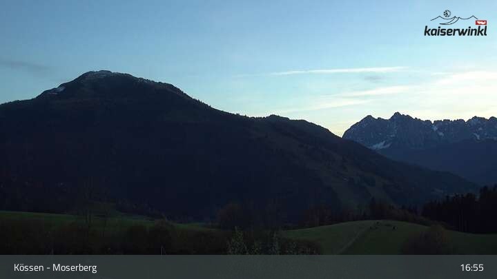 Blick vom Moserberg im Skigebiet Kössen auf die umliegende Bergwelt.