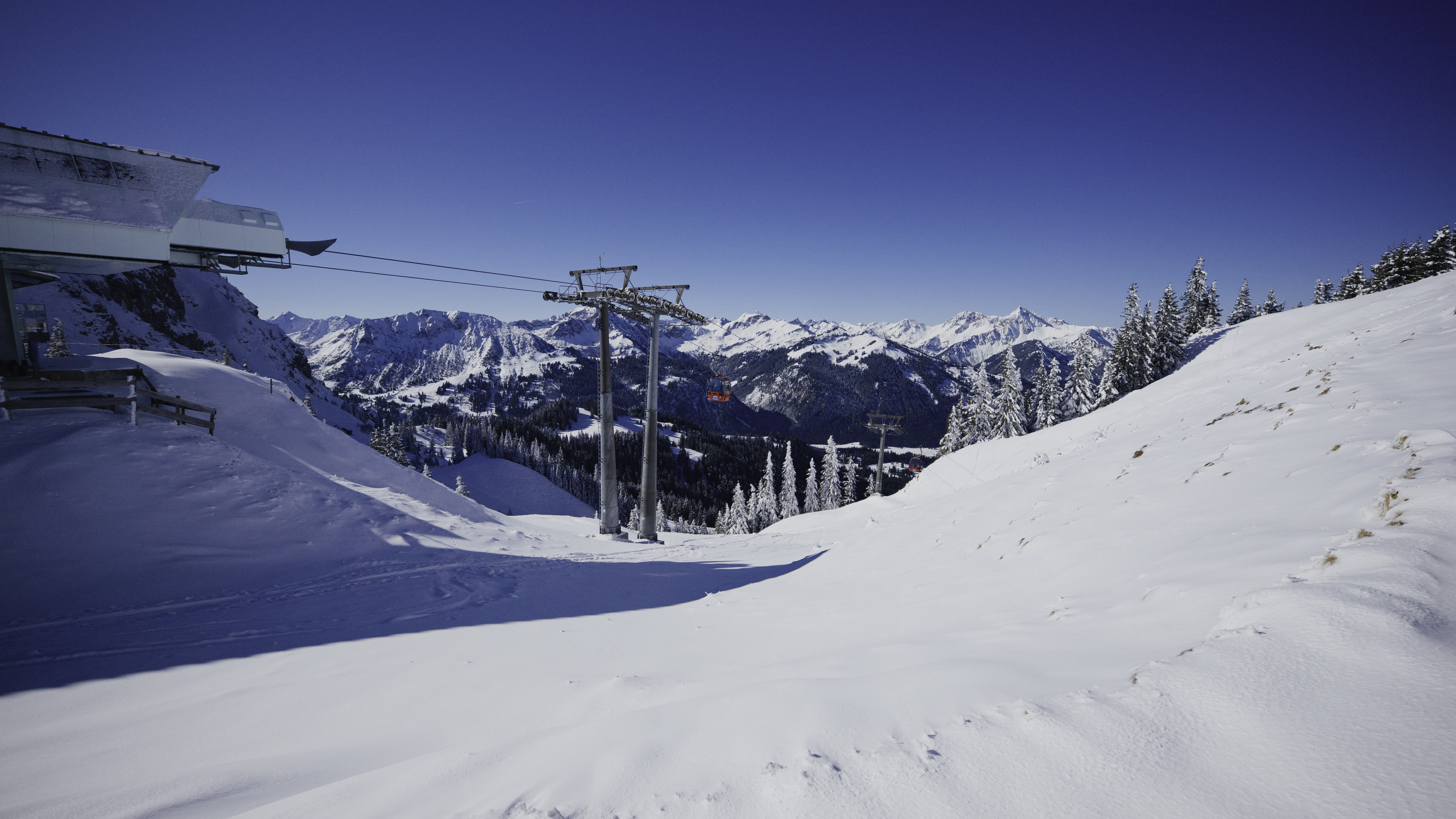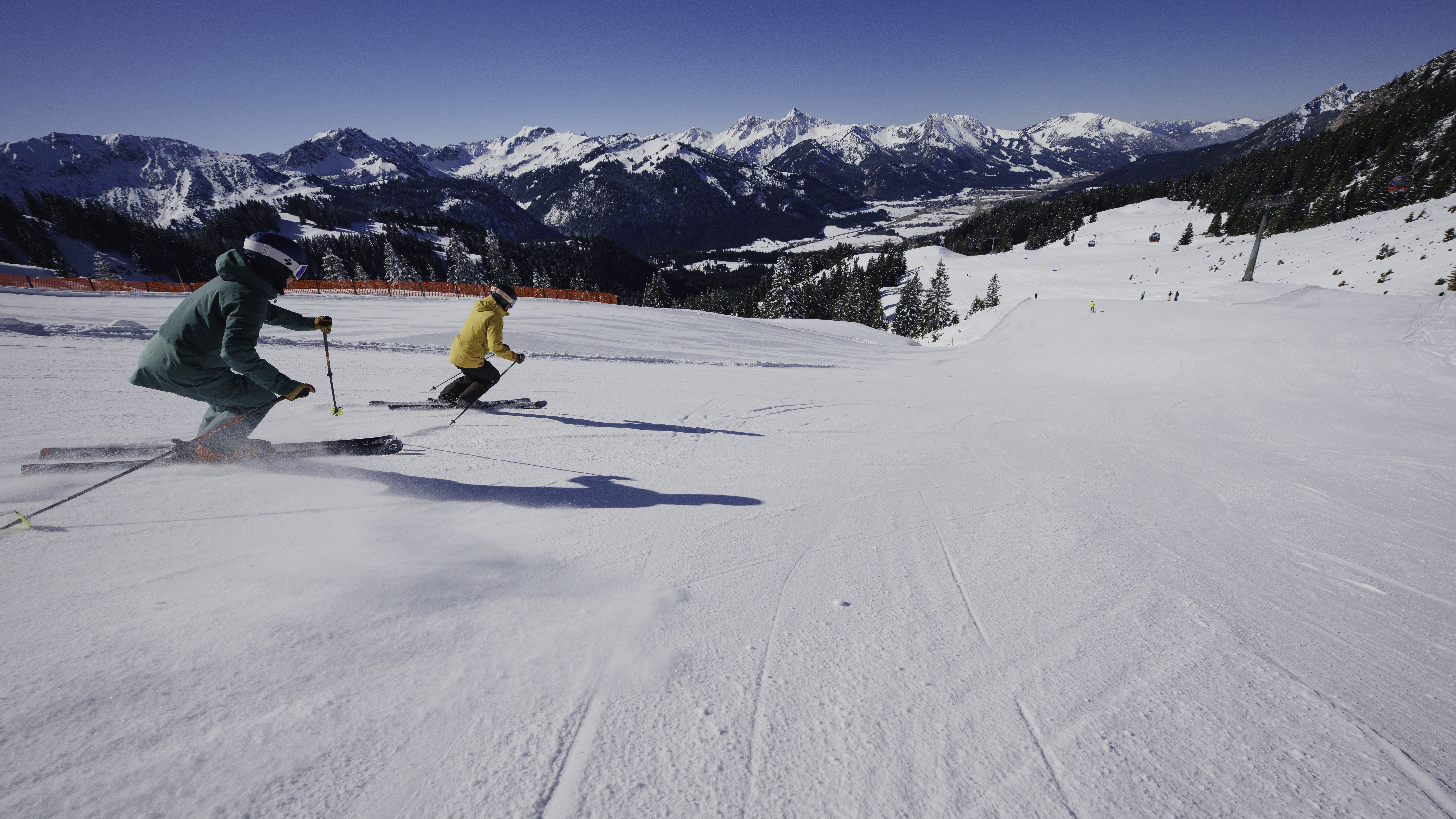 Die Talabfahrt führt Skifahrer von oberhalb der Baumgrenze durch den Wald bis hin zum Parkplatz der Talstation und bietet dabei einen tollen Ausblick auf das Tannheimer Tal.