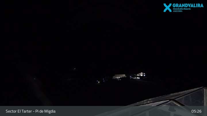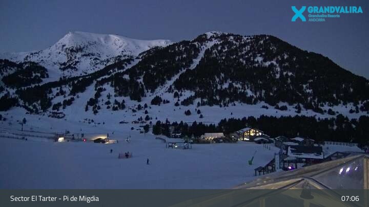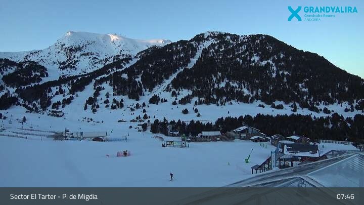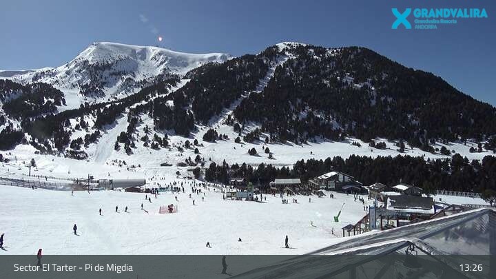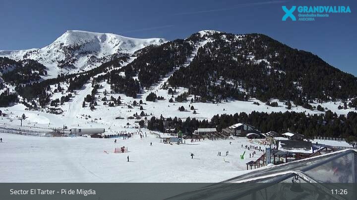Zu sehen ist der Bereich El Tarter im Skigebiet Grandvalira. Die Webcam ist an der Mittelstation positioniert. Gut zu erkennen ist unter anderem der große Snowpark und der Anfängerbereich. In diesem Bereich verläuft auch die Weltcupabfahrt Àliga.