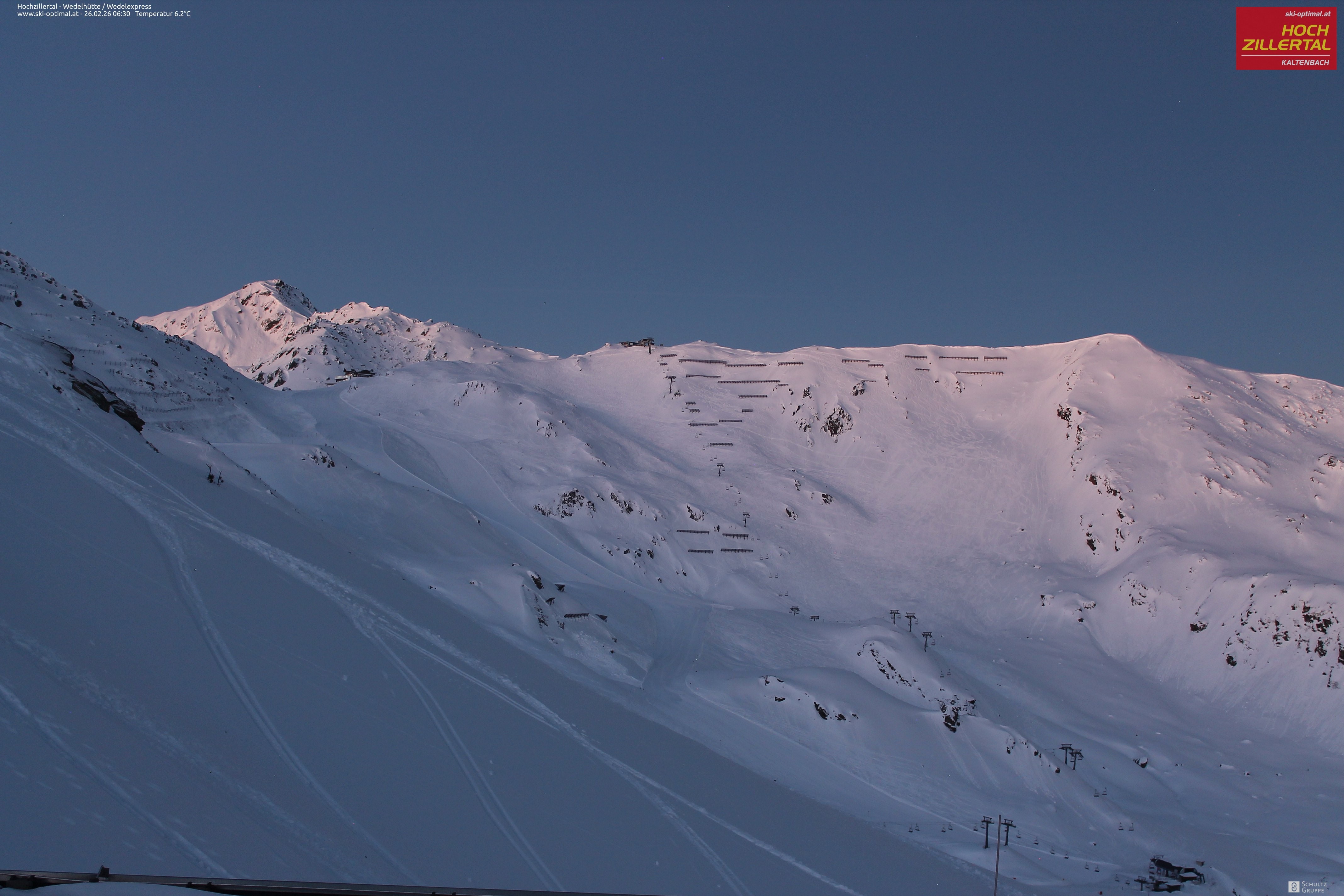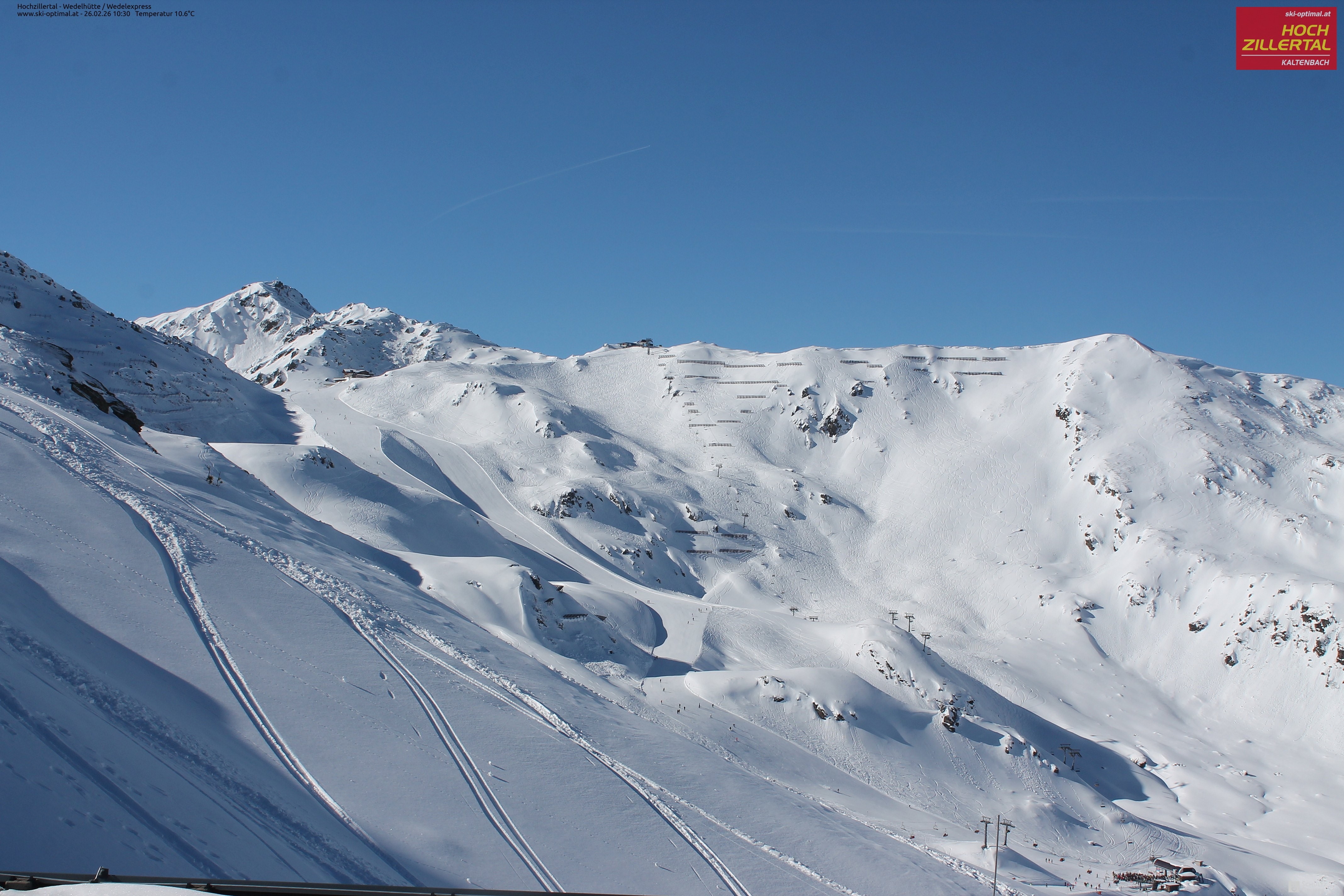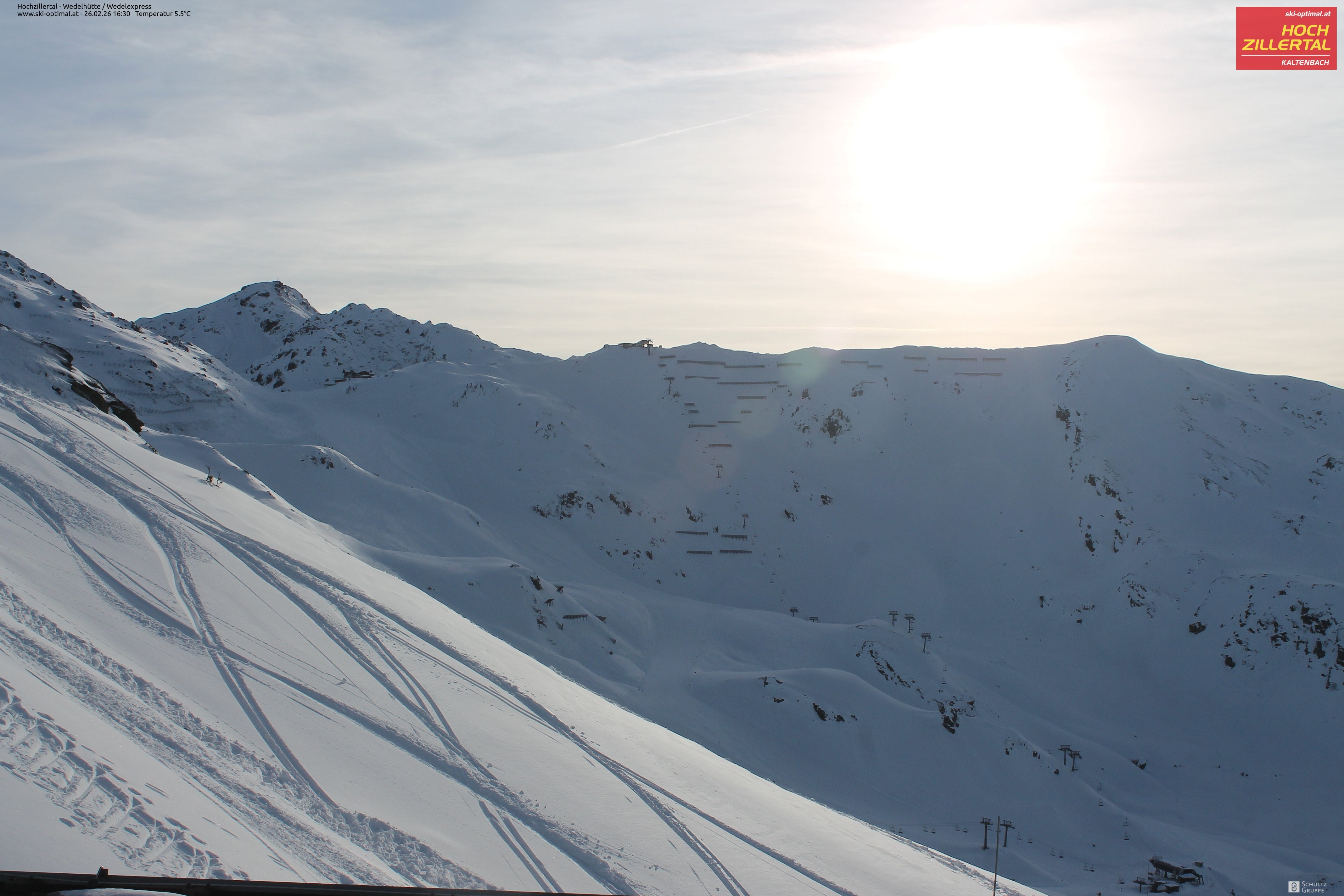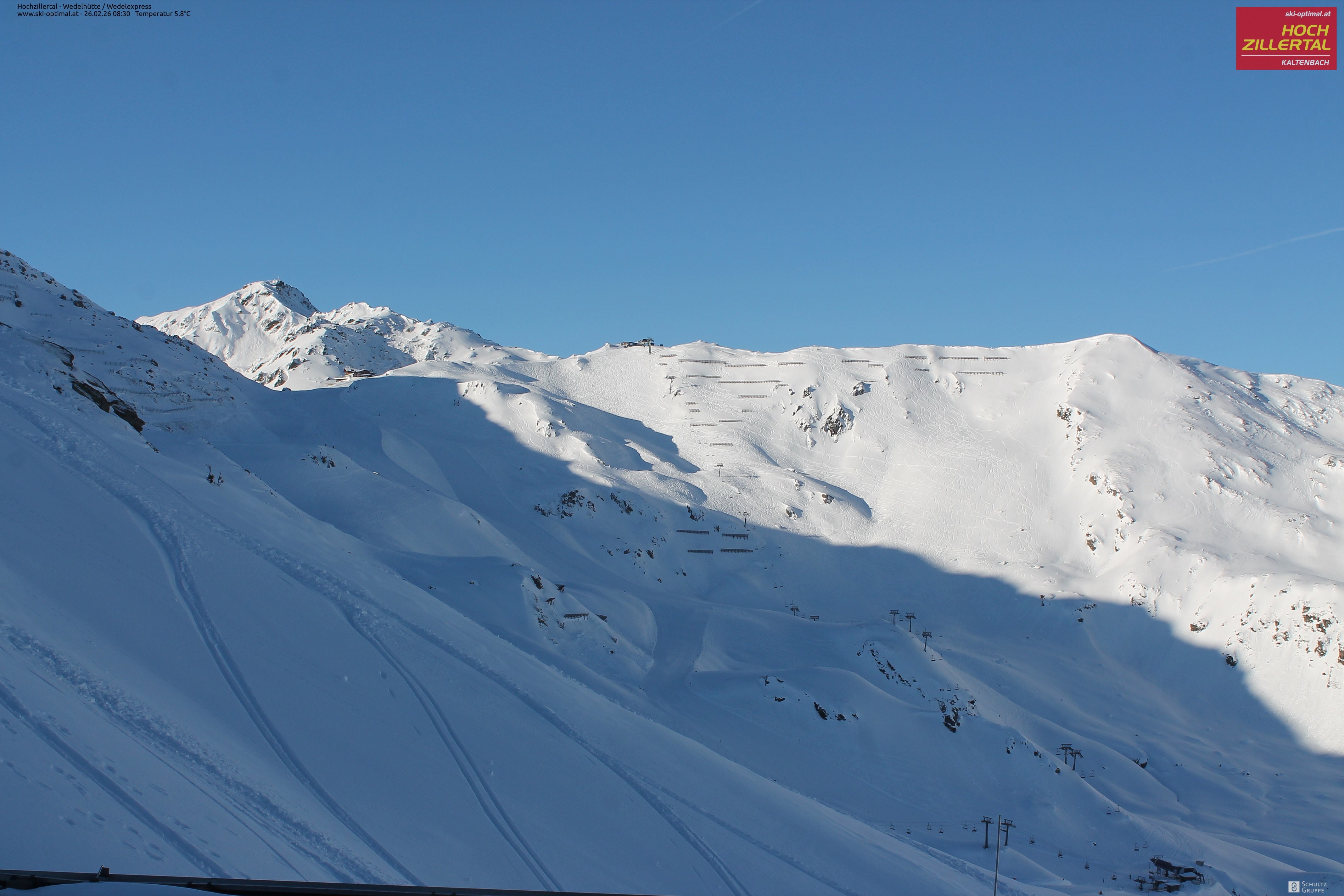 Aussicht auf die Wedelhütte im Hochzillertal. Hier kann man mitten im Skigebiet auf 5-Sterne Niveau nächtigen. Daneben erkennt man den Sessellift Wedel-Express.