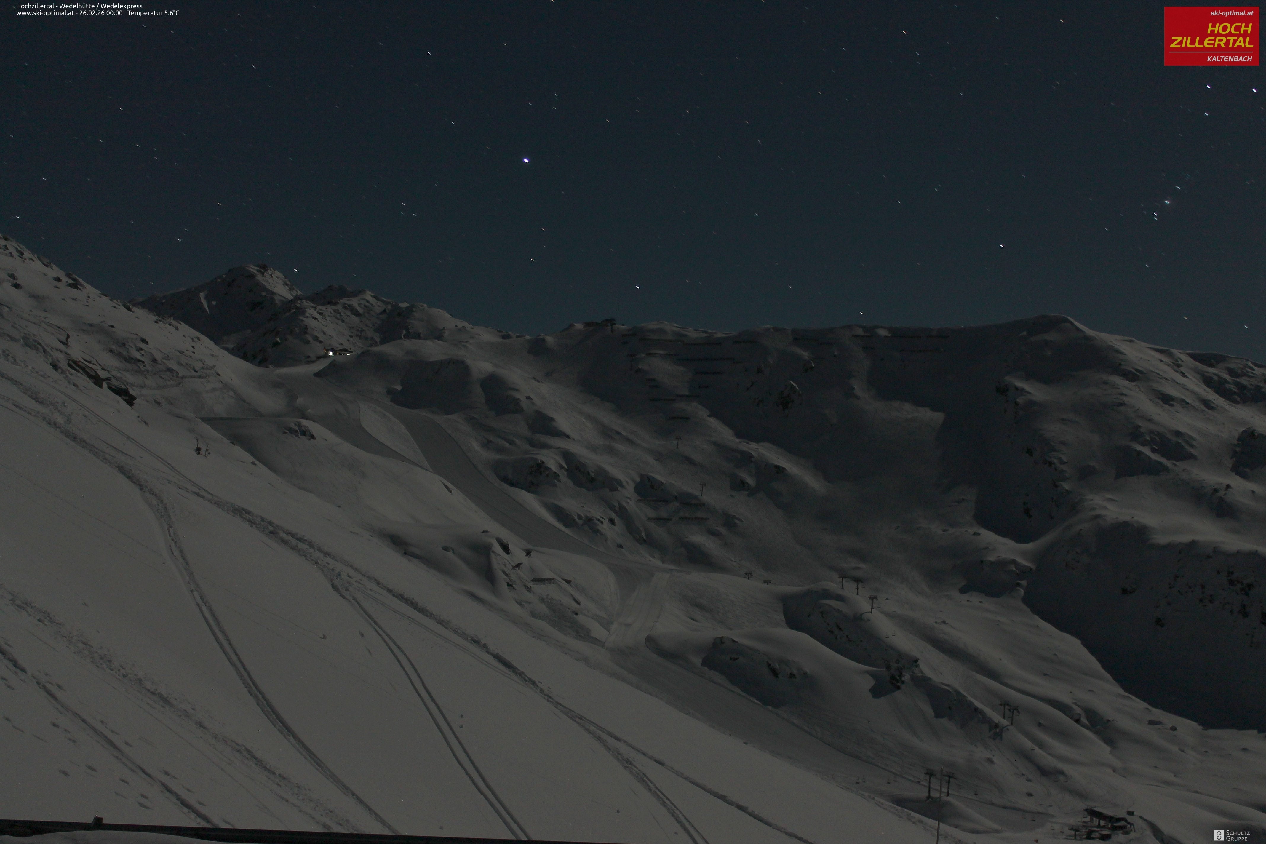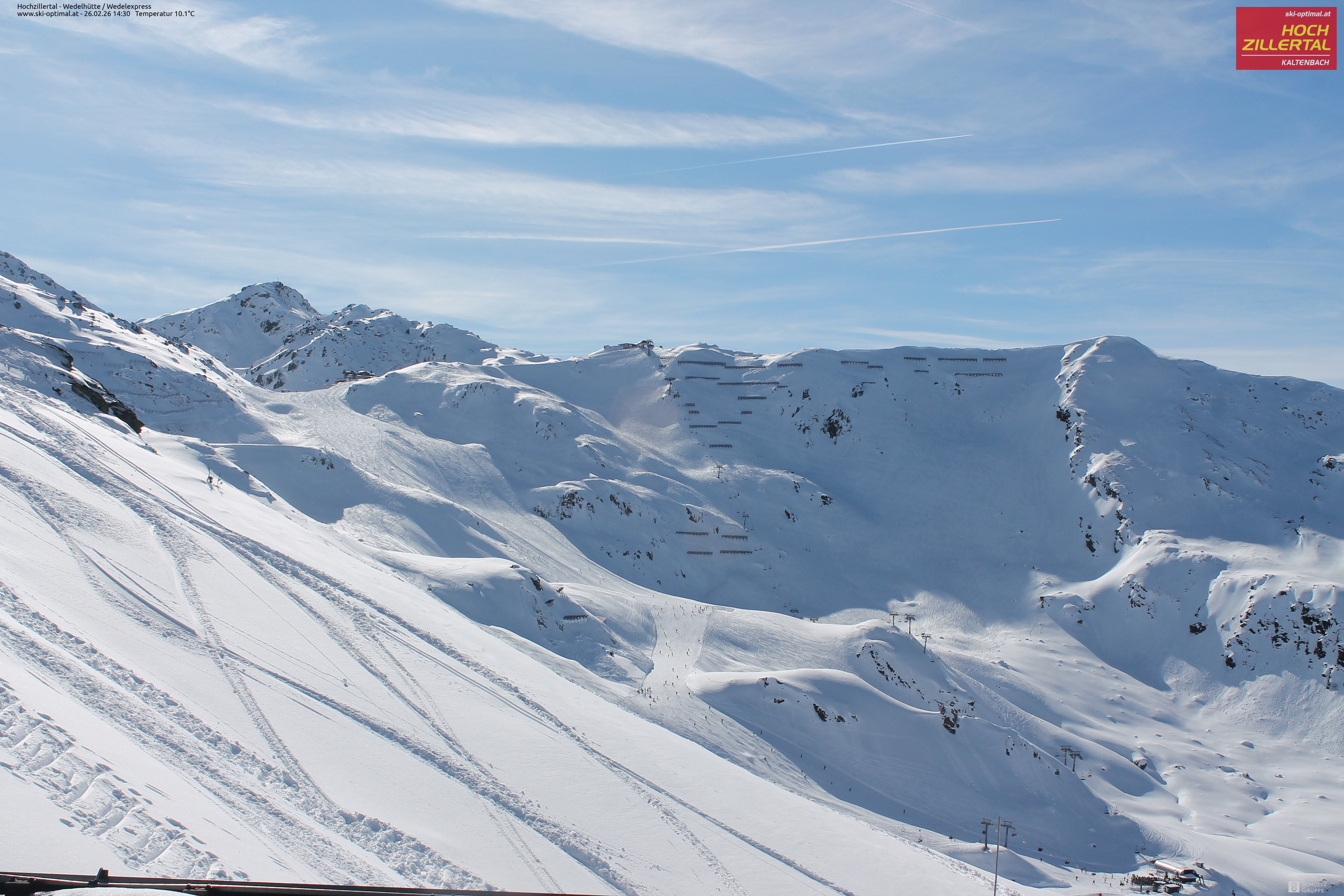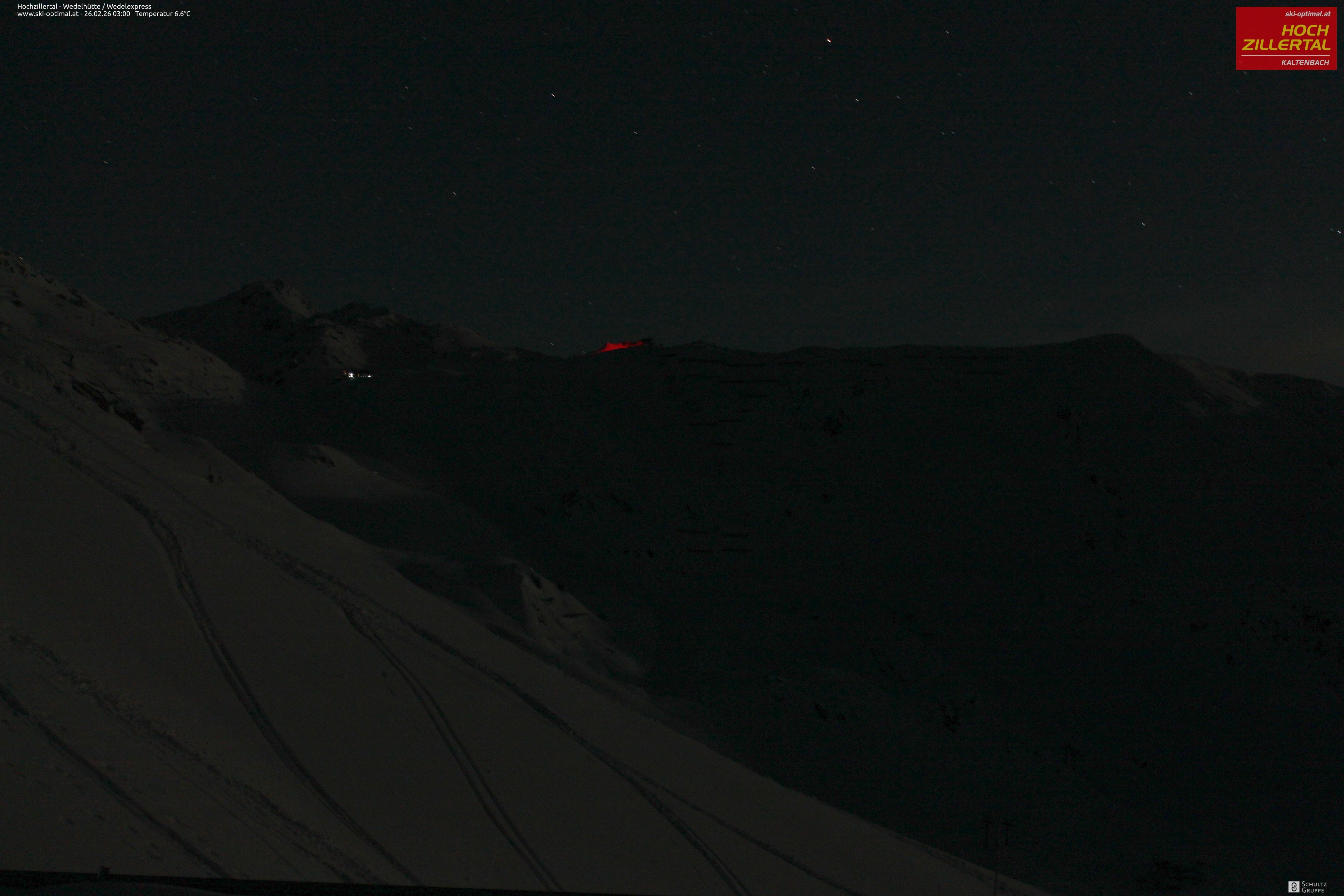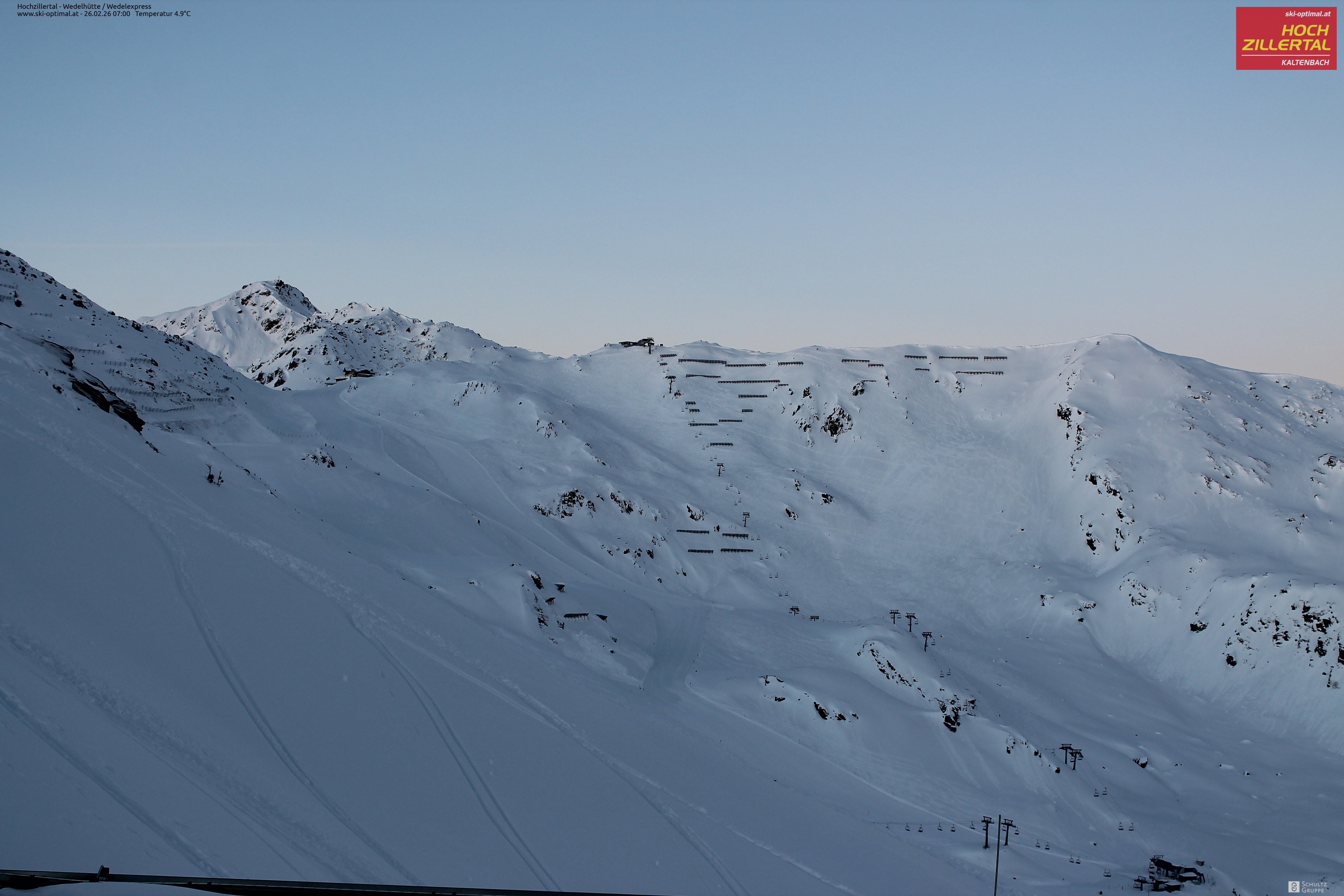 Aussicht auf die Wedelhütte im Hochzillertal. Hier kann man mitten im Skigebiet auf 5-Sterne Niveau nächtigen. Daneben erkennt man den Sessellift Wedel-Express.