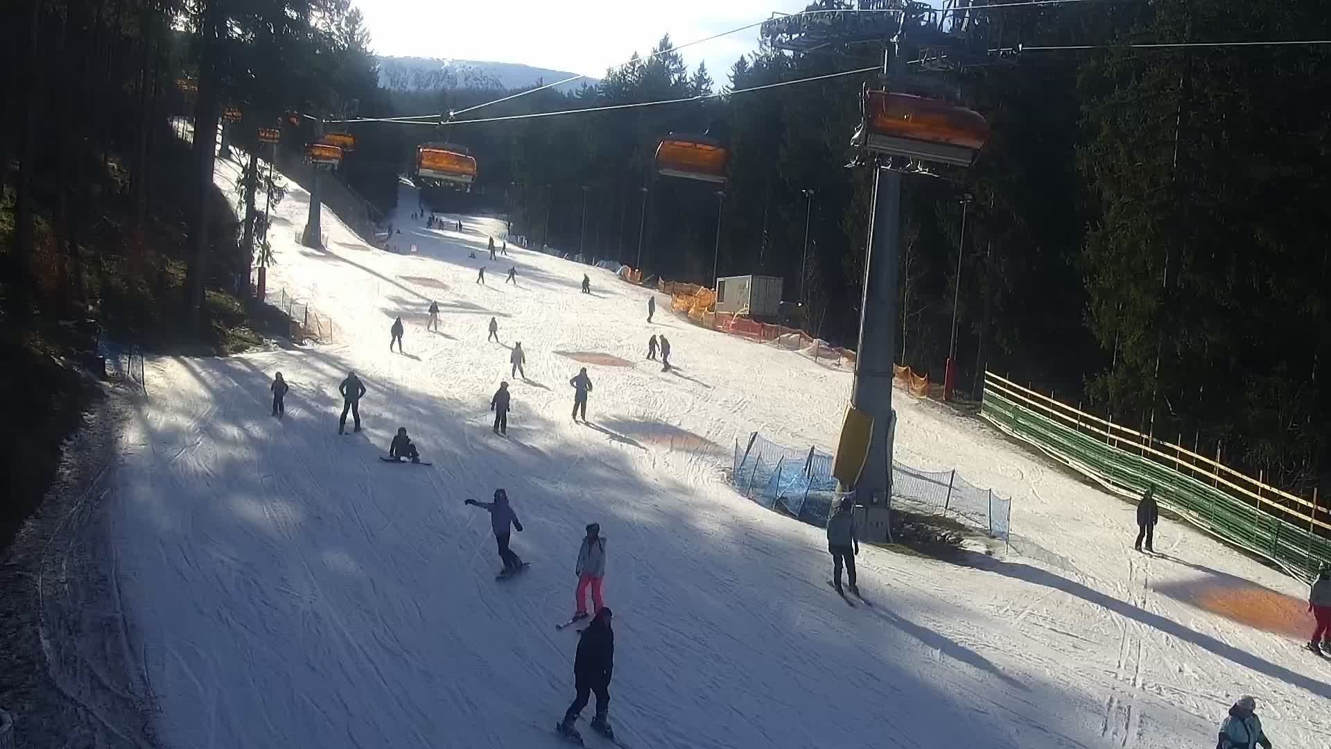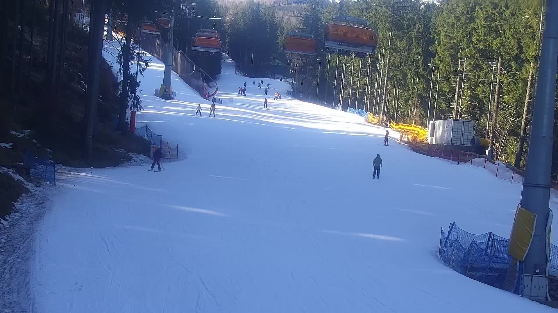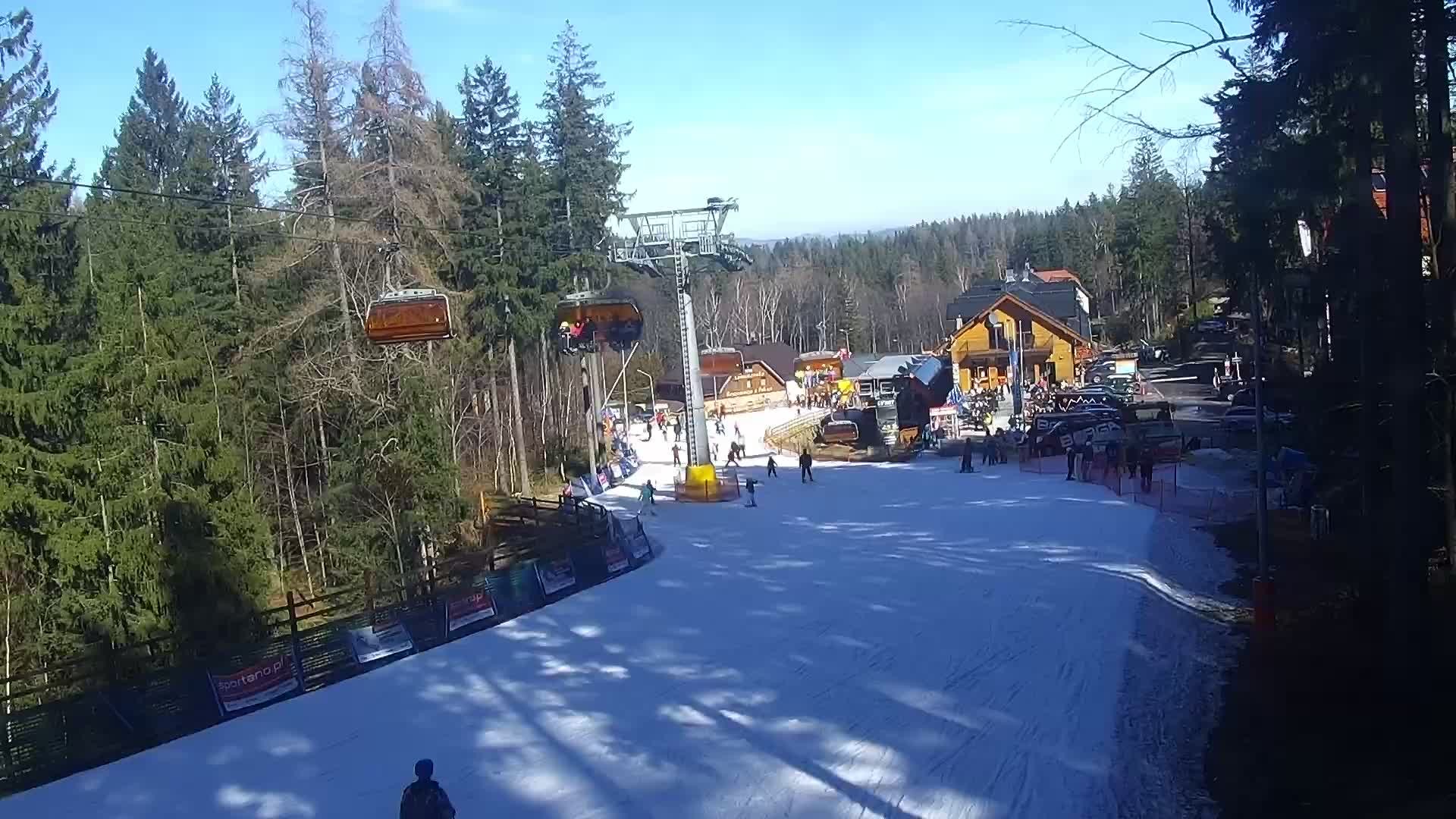 Die Kamera zeigt die Piste im Bereich der Talstation des Skigebiets Bialy Jar in Karpacz.