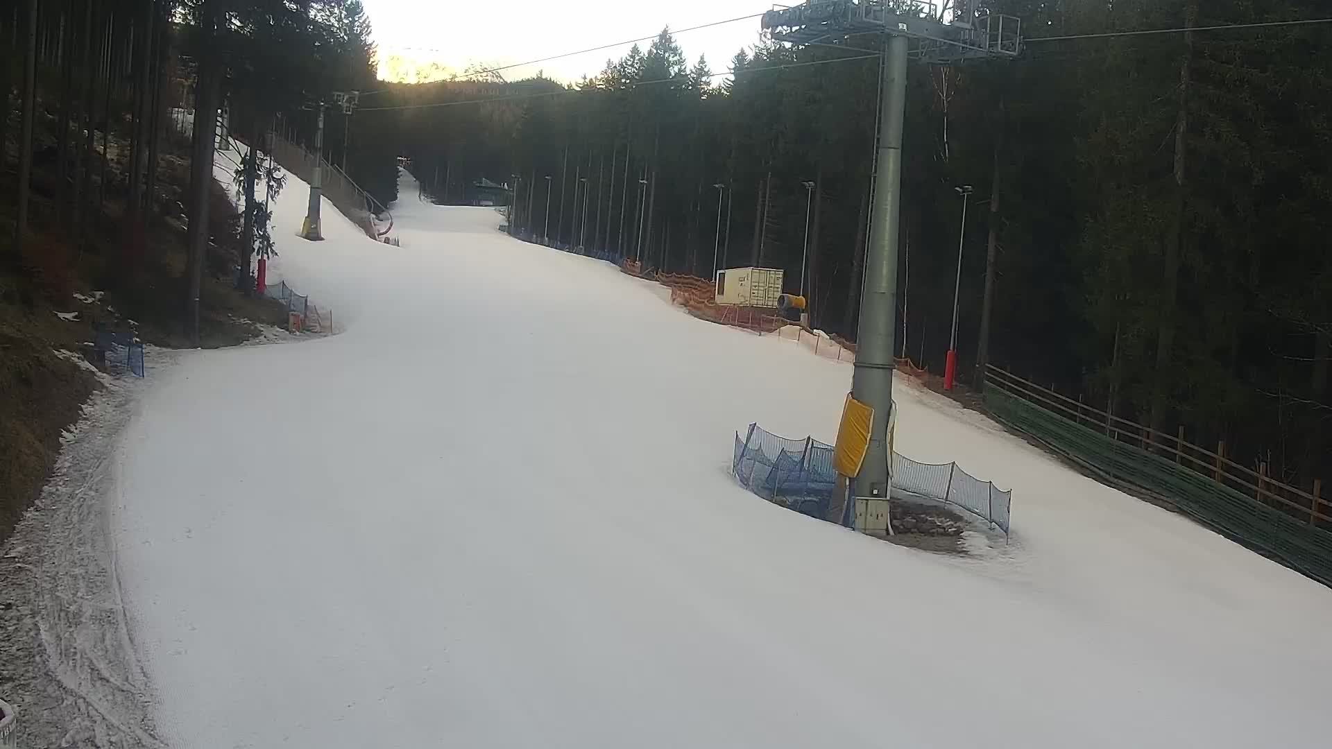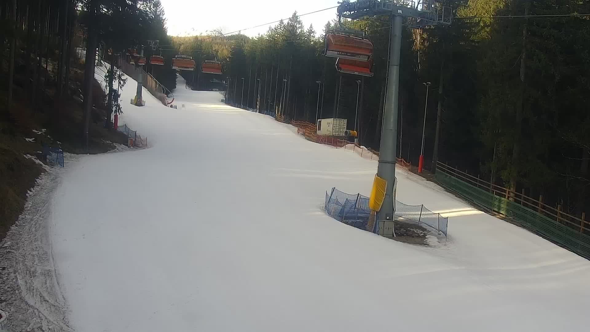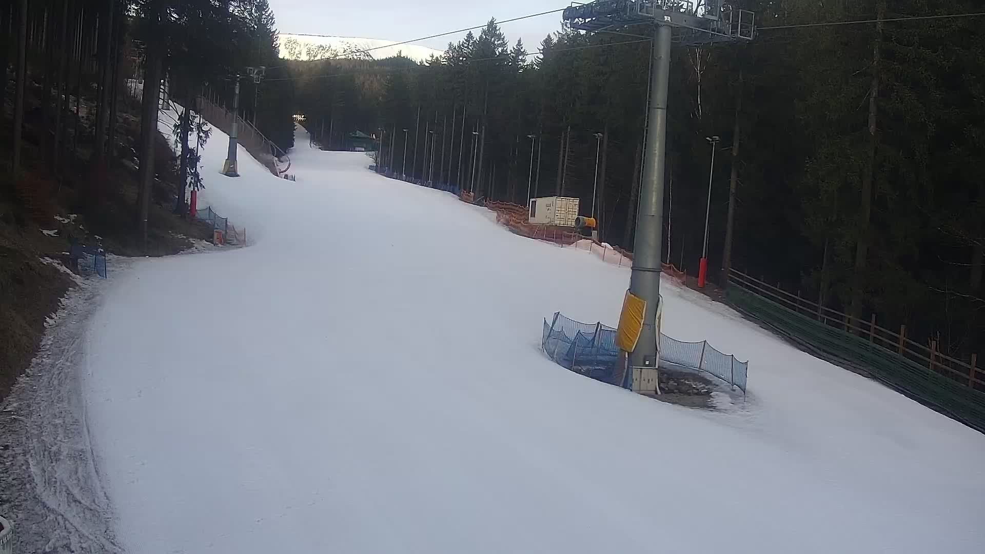 Die Kamera zeigt die Piste im Bereich der Talstation des Skigebiets Bialy Jar in Karpacz.