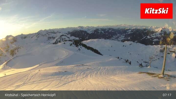 Auf rund 1700 m blickt diese Webcam über die umliegende Bergwelt der Kitzbüheler Alpen und den Speicherteich Hornköpfl.