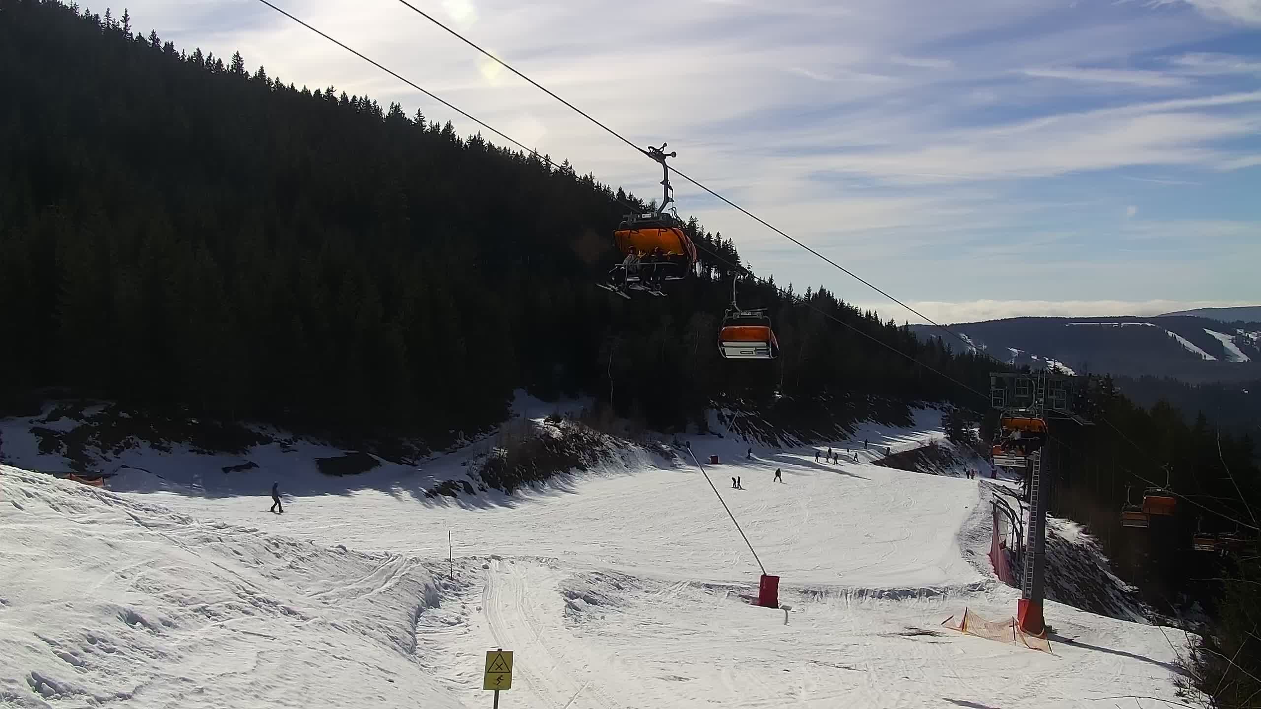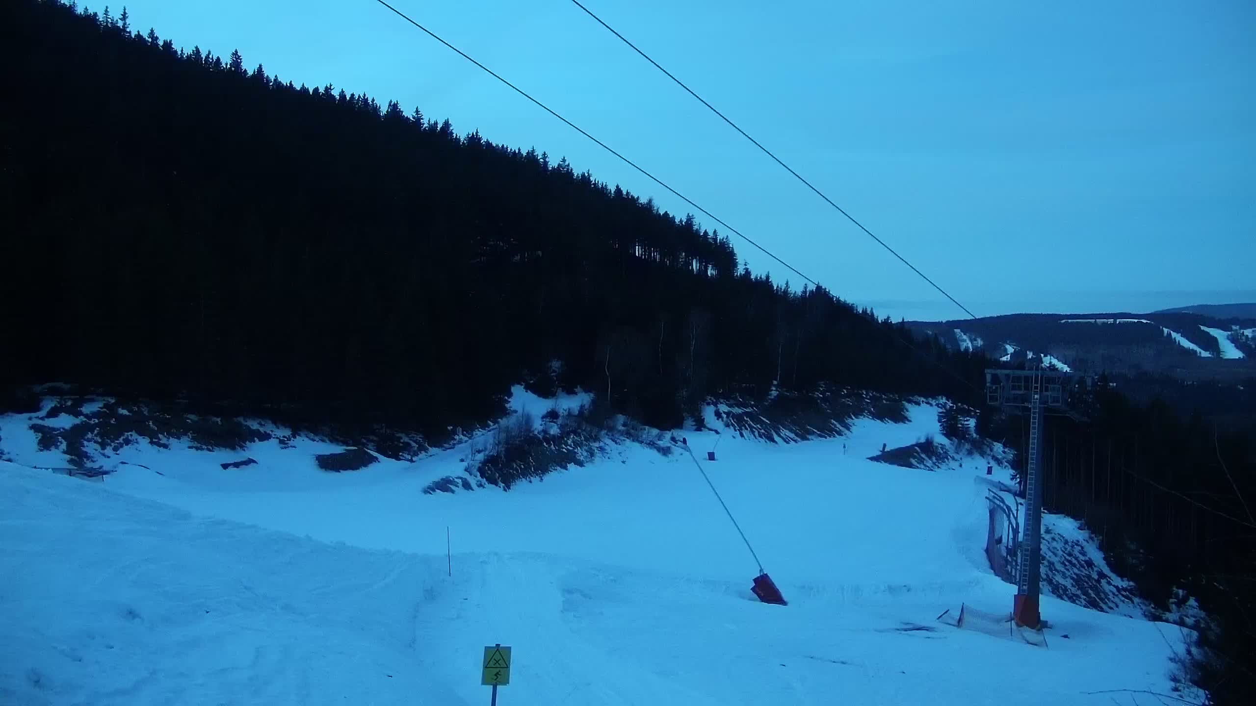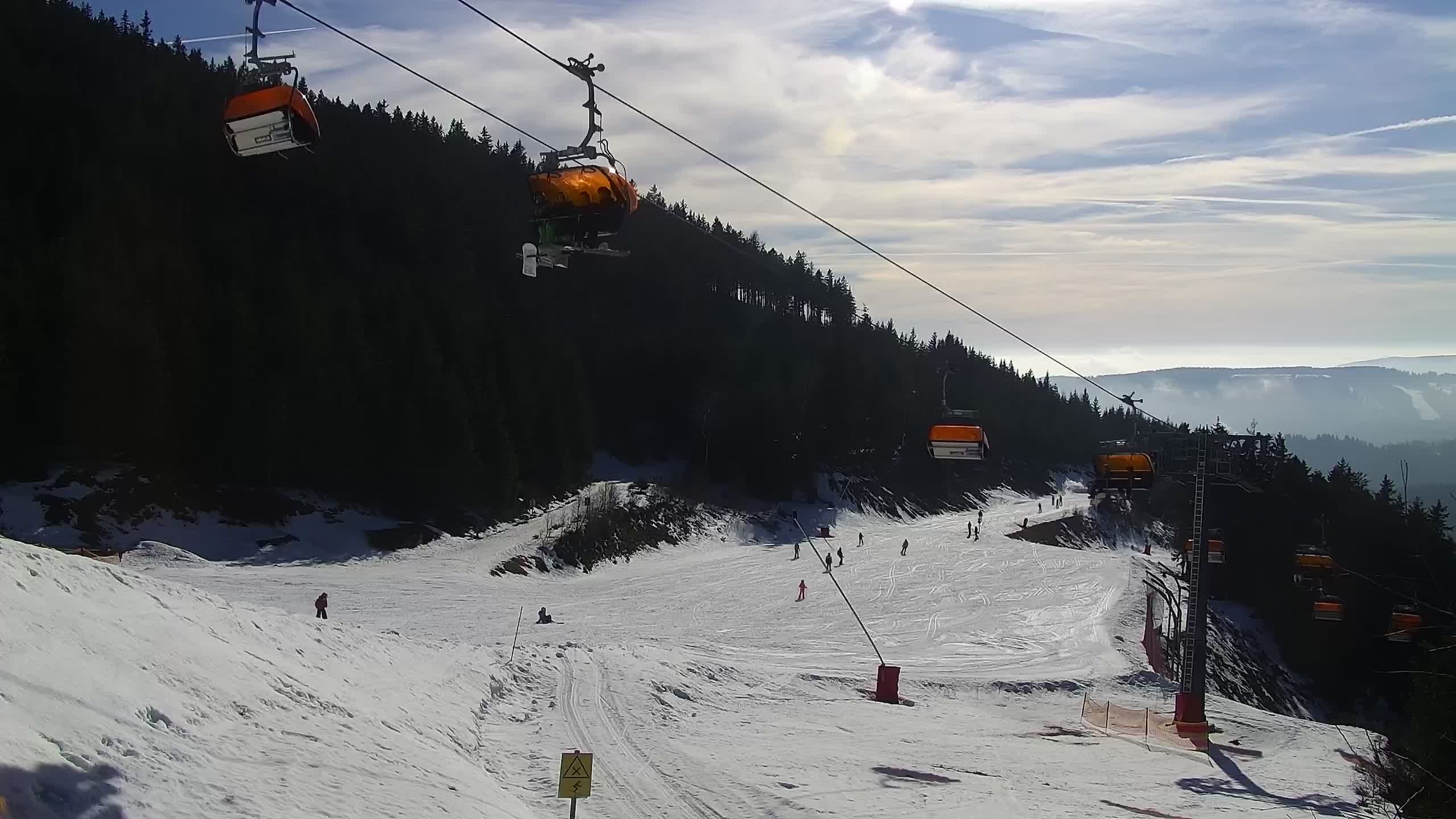 Die Skihänge in unmittelbarer Nähe zum Prima Express-Sessellift am Keilberg. Wie fast alle Pisten im Skigebiet Klinovecz können diese mittels Kunstschnee auch bei wenig Schneefall gut in Schuss gehalten werden.