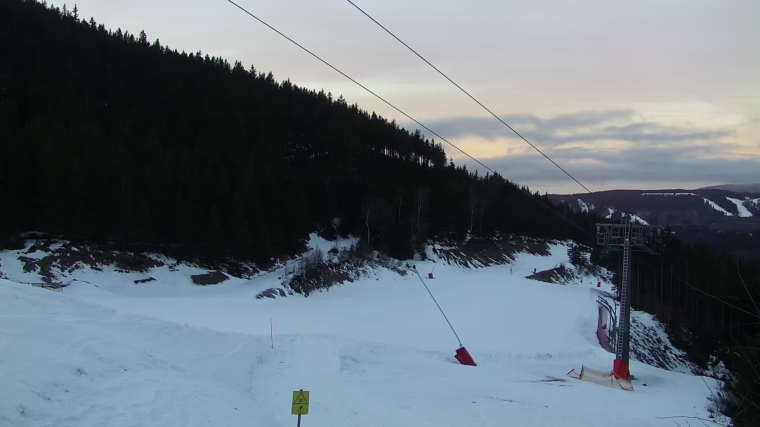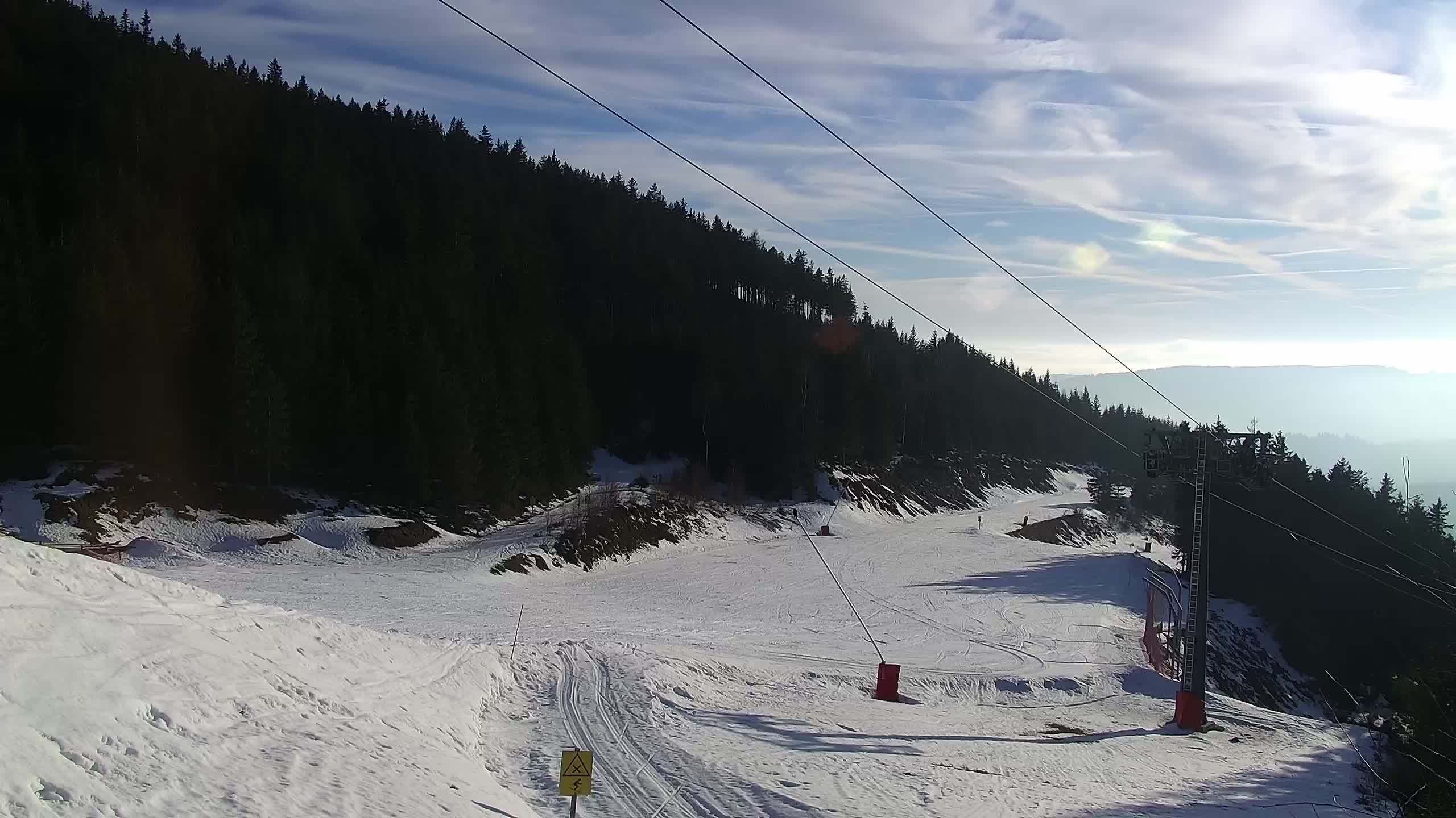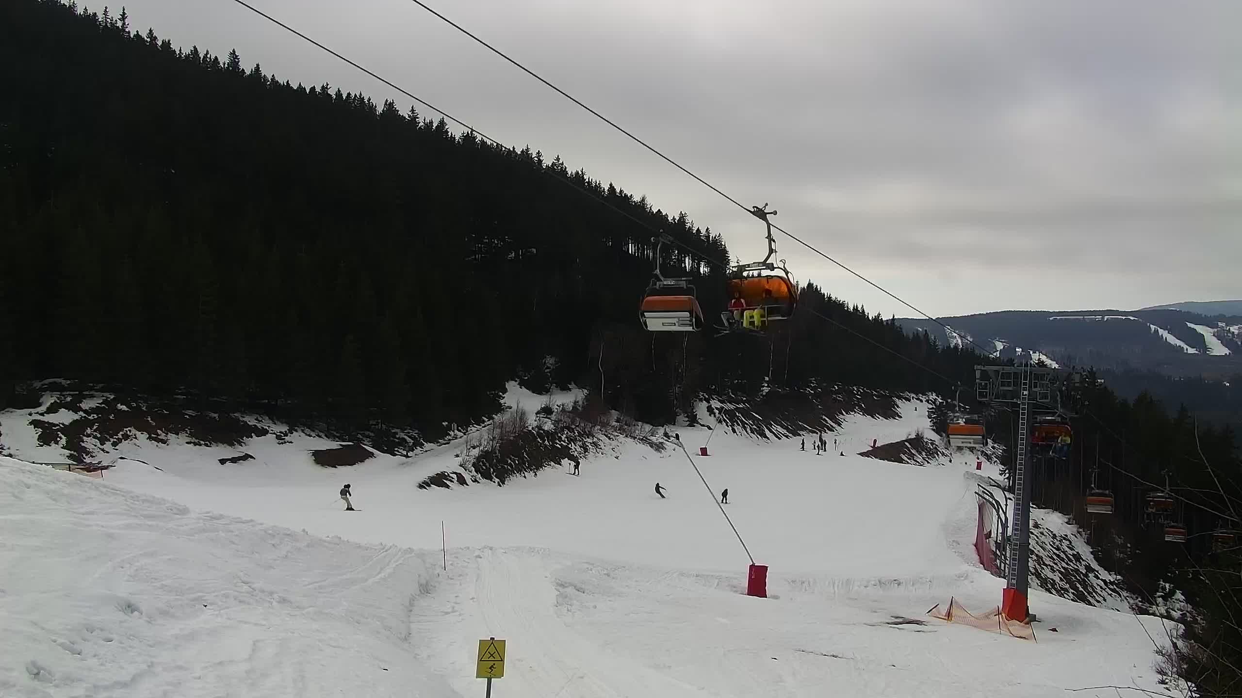 Die Skihänge in unmittelbarer Nähe zum Prima Express-Sessellift am Keilberg. Wie fast alle Pisten im Skigebiet Klinovecz können diese mittels Kunstschnee auch bei wenig Schneefall gut in Schuss gehalten werden.