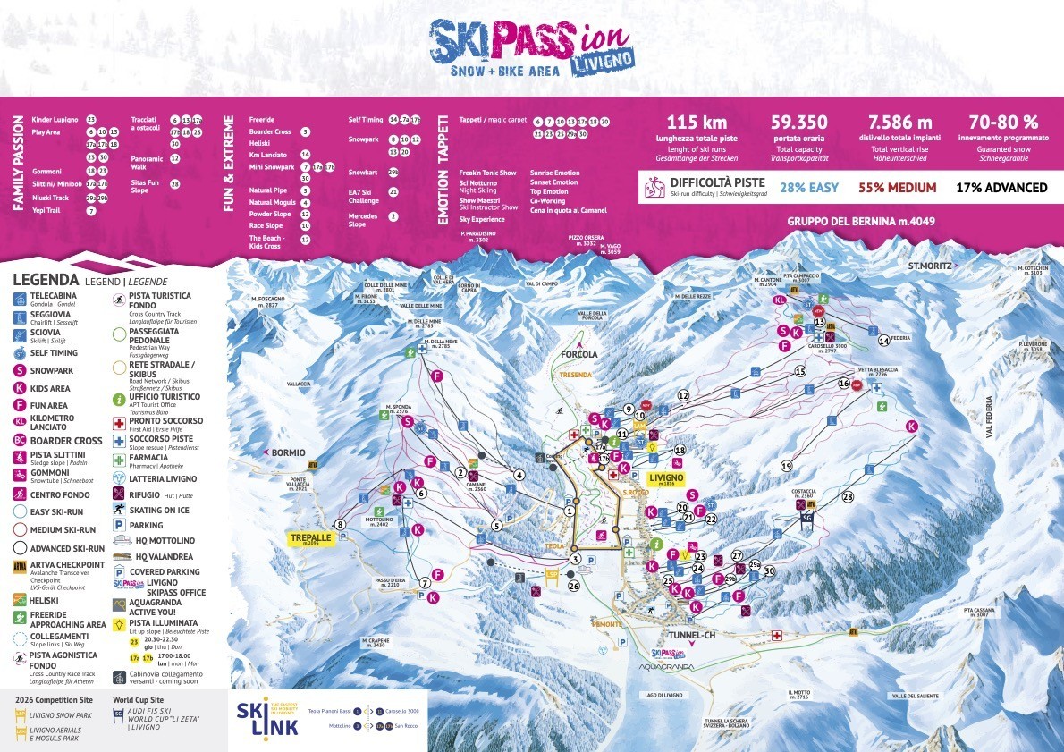 - Mit 115 km Pisten ist Livigno unter den 15 größten Skigebieten in Italien.