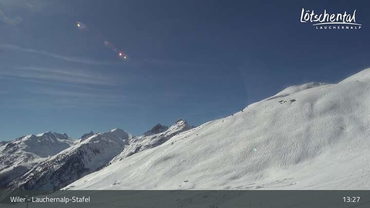Die Webcam am Stationsgebäude Stafel im Skigebiet Lötschental Lauchernalp im Wallis in der Schweiz.