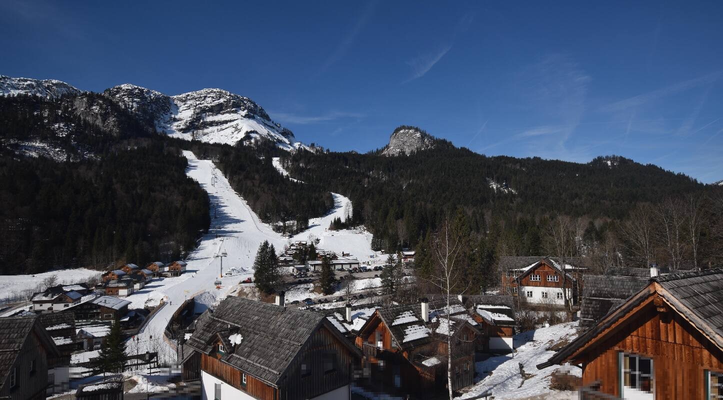 Die Kamera blickt von der Hagan Lodge bei Altaussee auf die 6er-Sesselbahn Sandling-Jet und das Skikinderland im Skigebiet Loser.