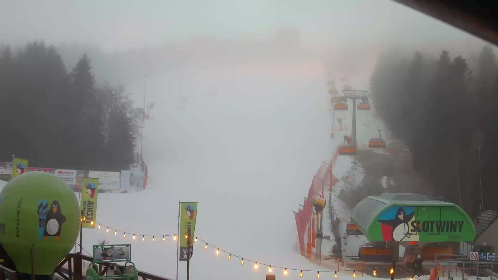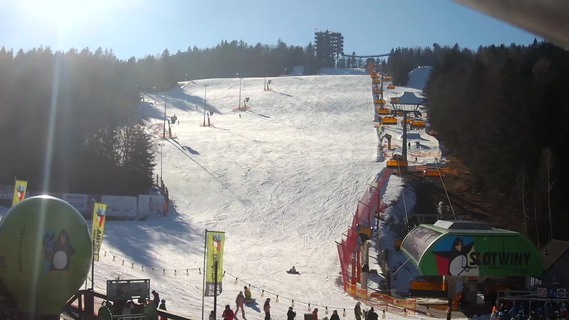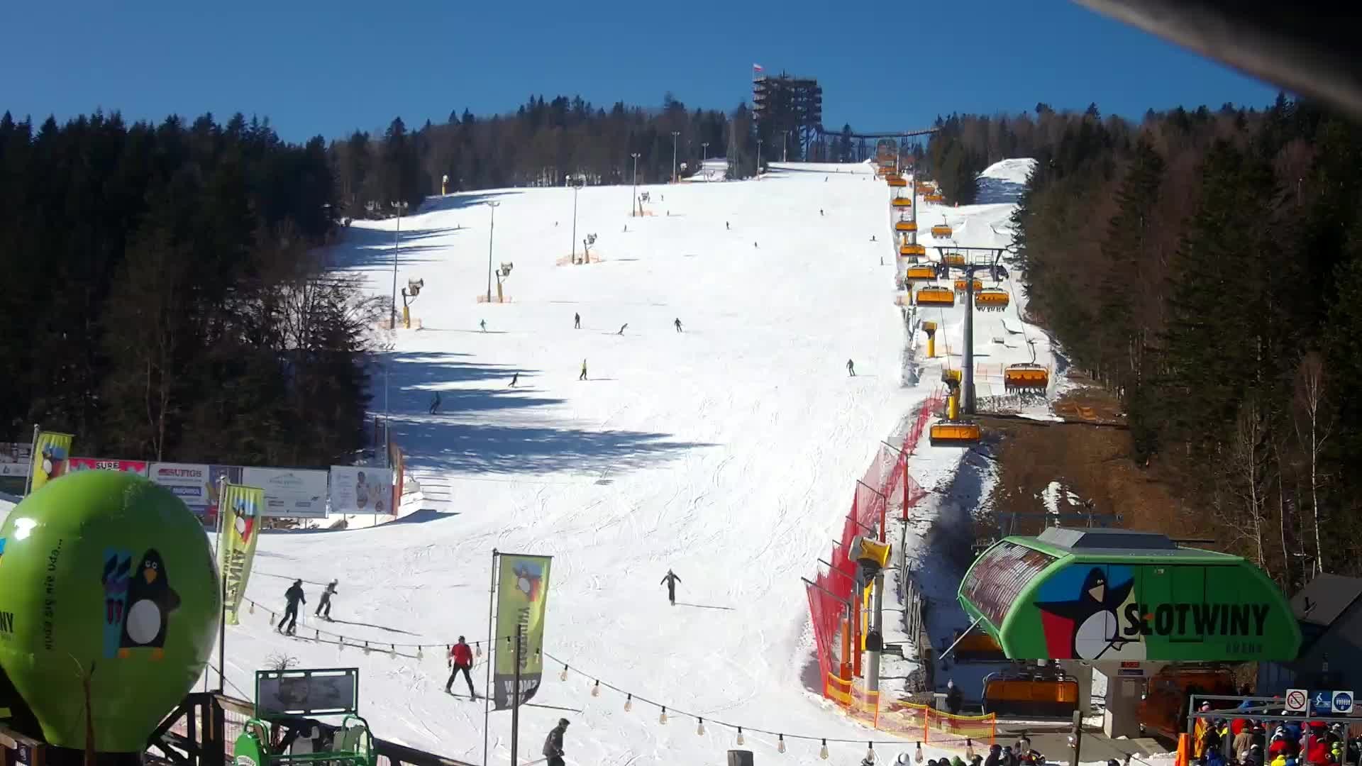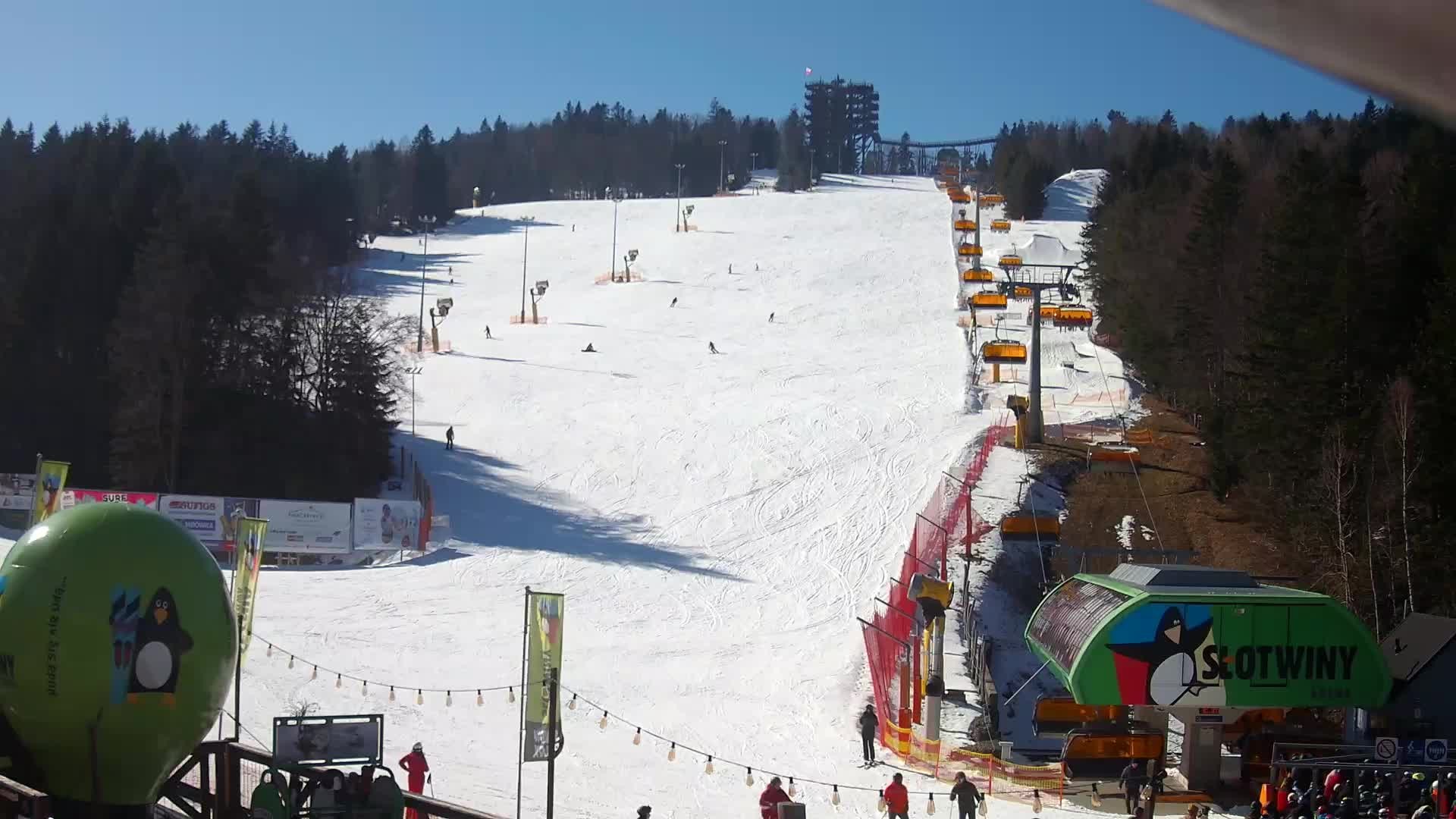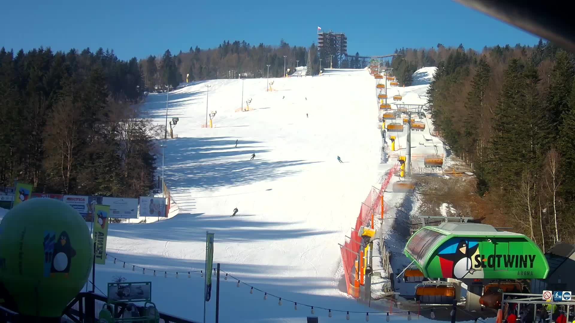 Die Webcam befindet sich an der Talstation des Sessellifts im Skigebiet Slotwiny Arena. Auf dem Gipfel ist auch der große Aussichtsturm zu sehen.