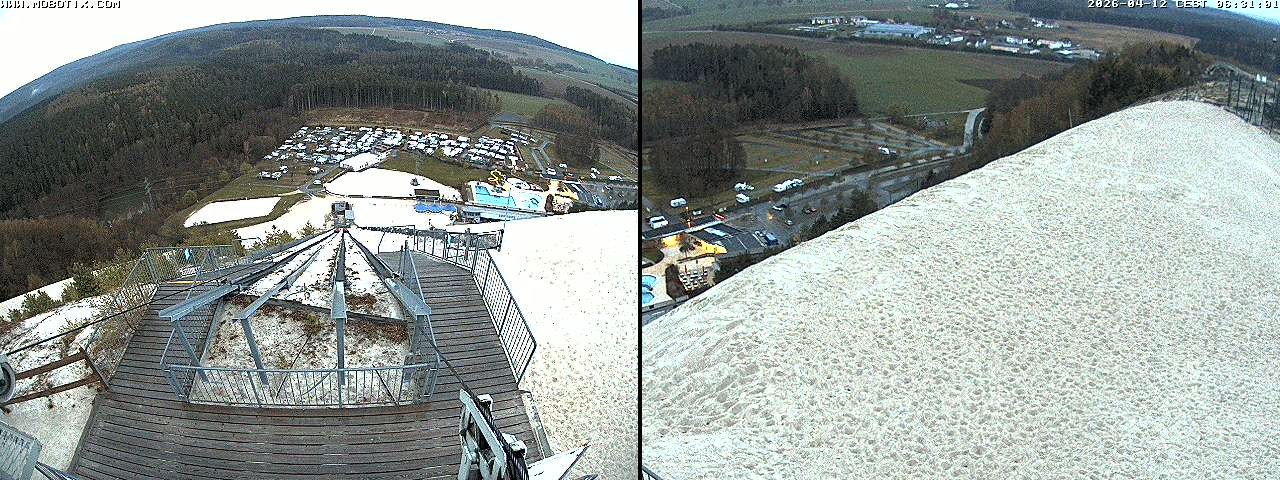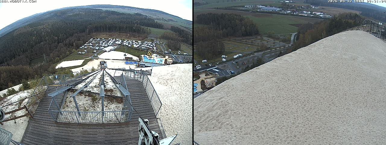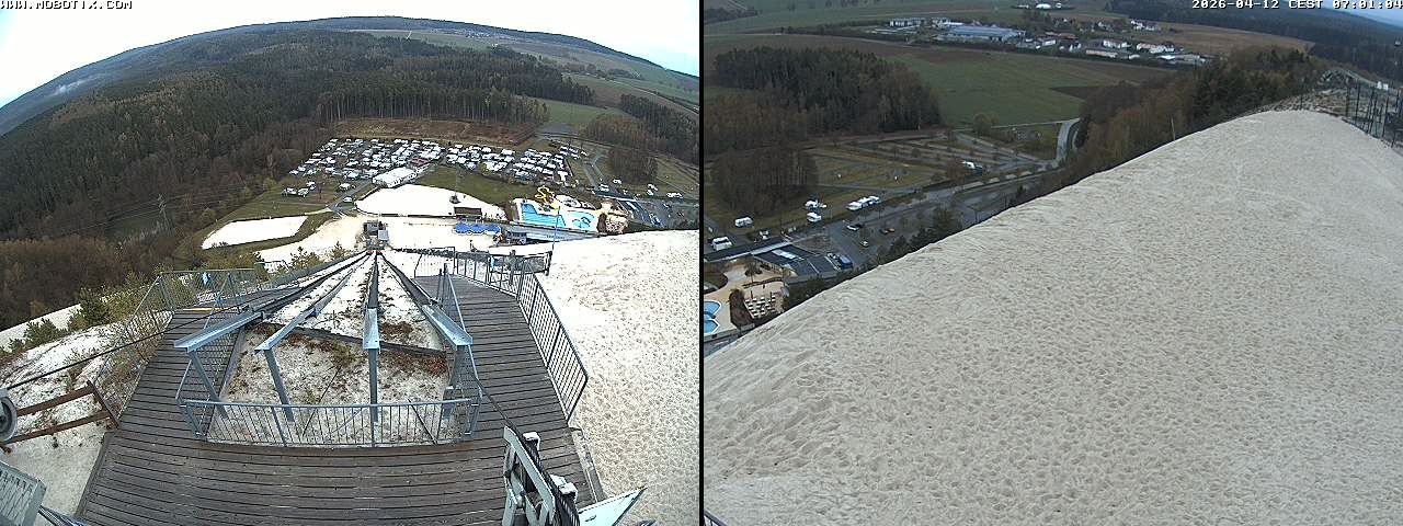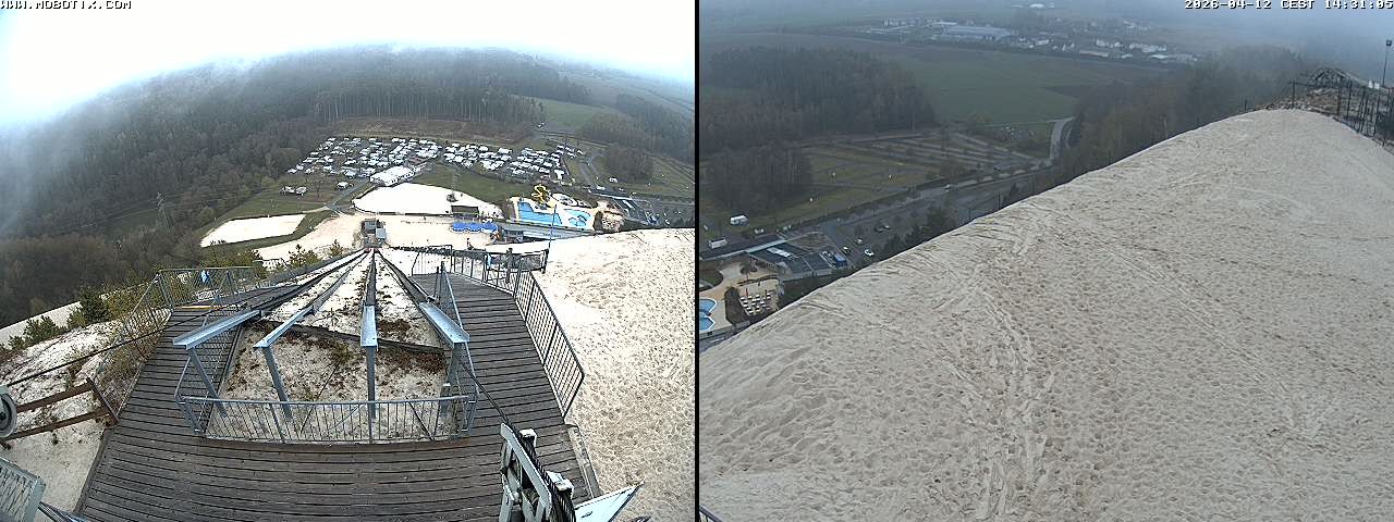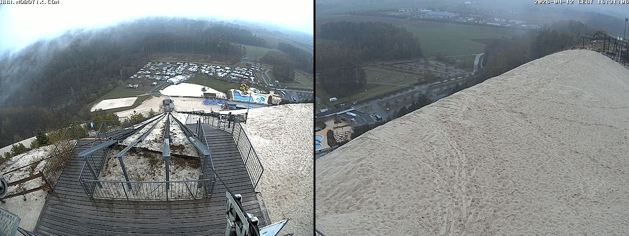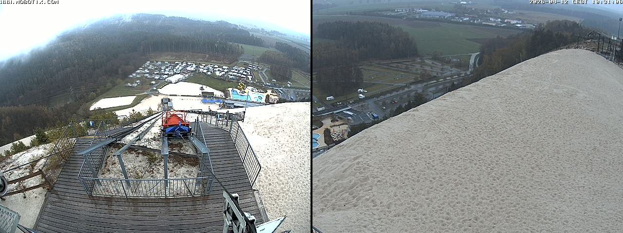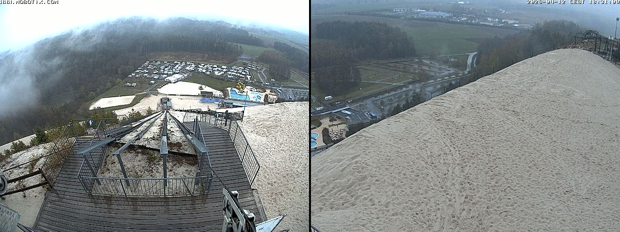 Diese Webcam zeigt den Blick gen Freibad von der Monte Kaolino Bergspitze in Hirschau, Bayern. Im Vordergrund siehst du die Standseilbahn, die Besucher auf den Gipfel des Monte Kaolinos zieht.