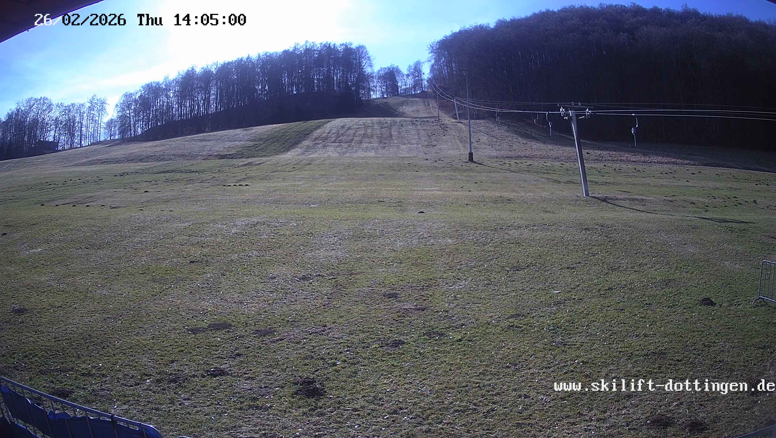 Die Webcam zeigt die Talstation des einzigen Schlepplifts im Skigebiet Dottingen in der Nähe von Münsingen in der Schwäbischen Alb. Der Schlepplift bringt die Skigebiets-Besucher 400m nach oben, wo ihnen 2 Pisten zur Verfügung stehen. Die Familienabfahrt mit einer Länge von 550 Metern und der Steilhang mit einer Länge von 400 Metern.
