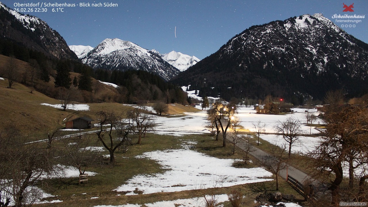 Die Webcam befindet sich am Scheibenhaus am südlichen Ortsrand von Oberstdorf. Du blickst nach Süden Richtung Kegelkopf, Kreuzeck und Fürschießer.