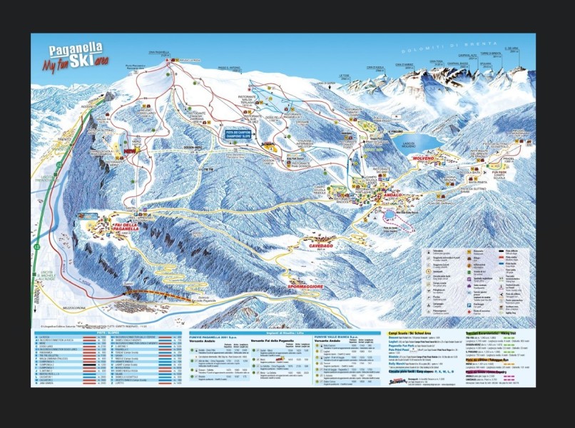 Über 30 Pistenkilometer, welche mit 12 roten und 1 schwarzen Piste vor allem für Fortgeschrittene und Könner interessant sind, sorgen für einen abwechslungsreichen Skiurlaub. Aber auch für Anfänger gibt es 7 blaue Pisten, auf denen man üben und Spaß haben kann sowie mehrere von Skischulen betreute Kinderparks mit 3 Zauberteppichen. Eine weitere blaue Anfängerpiste gibt es zudem unweit entfernt am Lago di Molveno, wo eine Seilbahn hinauf auf den Berg führt. Für reichlich Action ist mit den beidenFunparks Silver Park und Snowpark Dosso Larici gesorgt.