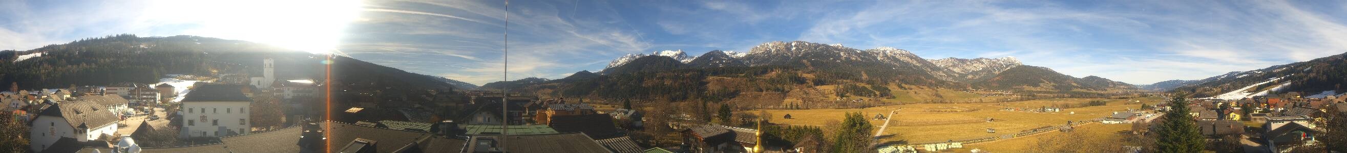 Die 360 Grad-Kamera eröffnet den Blick auf den Ort Haus im Ennstal in der Steiermark. Im Hintergrund sind bei guten Wetterverhältnissen unter anderem die Gipfel folgender Berge zu erkennen: Stoderzinken (2.048 m), Kammspitz (2.139 m), Hauser Kaibling (2.015 m), Planai (1.906 m) und Luserwand (2.135 m).