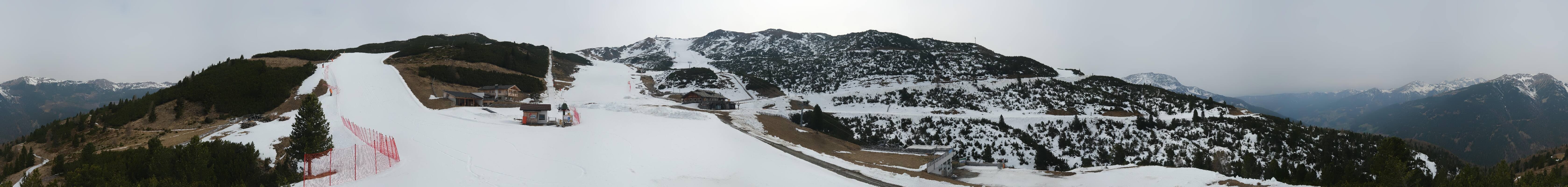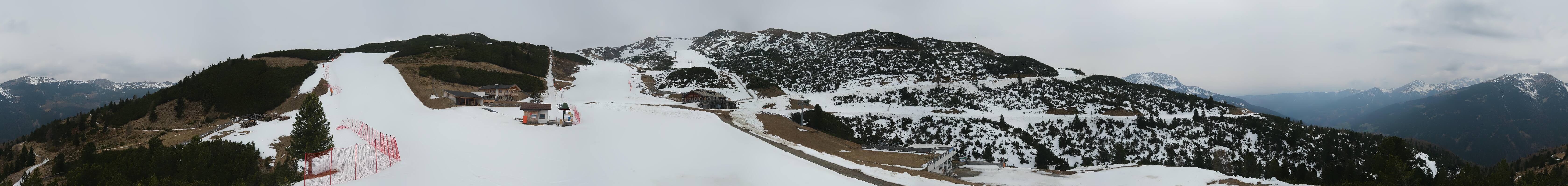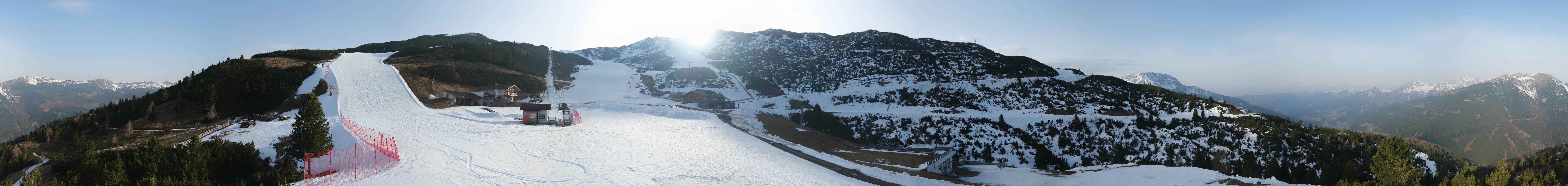 360-Grad-Panorama im Skigebiet Reinswald. Die Kamera ist positioniert nahe der Talstation des Sattele Sessellifts und zeigt unter anderem auch die Pfnatschpiste und das Restaurant Pfnatsch Alm.
