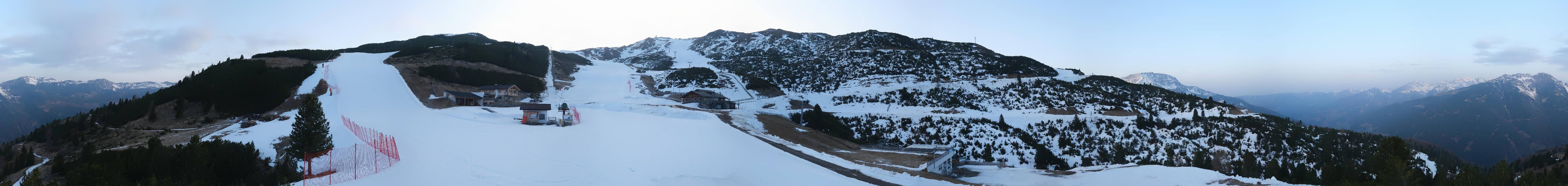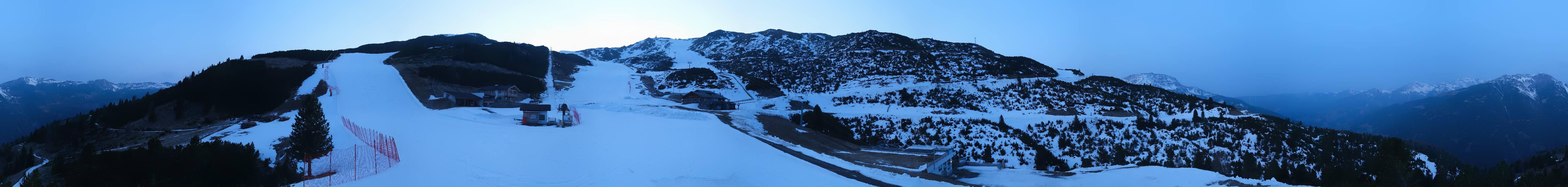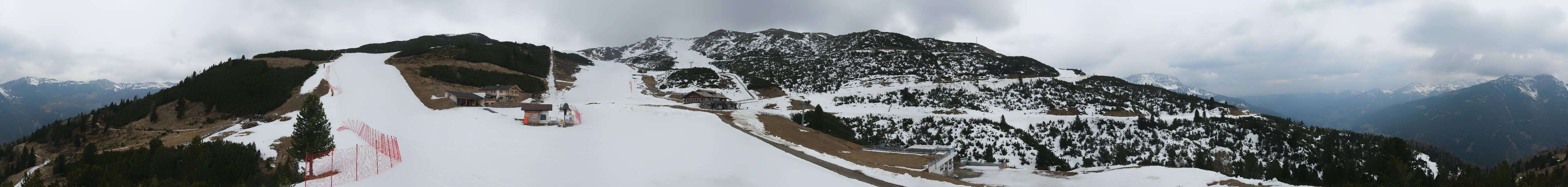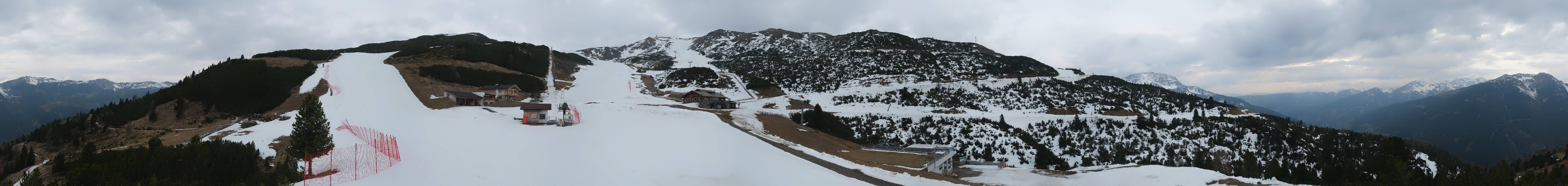 360-Grad-Panorama im Skigebiet Reinswald. Die Kamera ist positioniert nahe der Talstation des Sattele Sessellifts und zeigt unter anderem auch die Pfnatschpiste und das Restaurant Pfnatsch Alm.