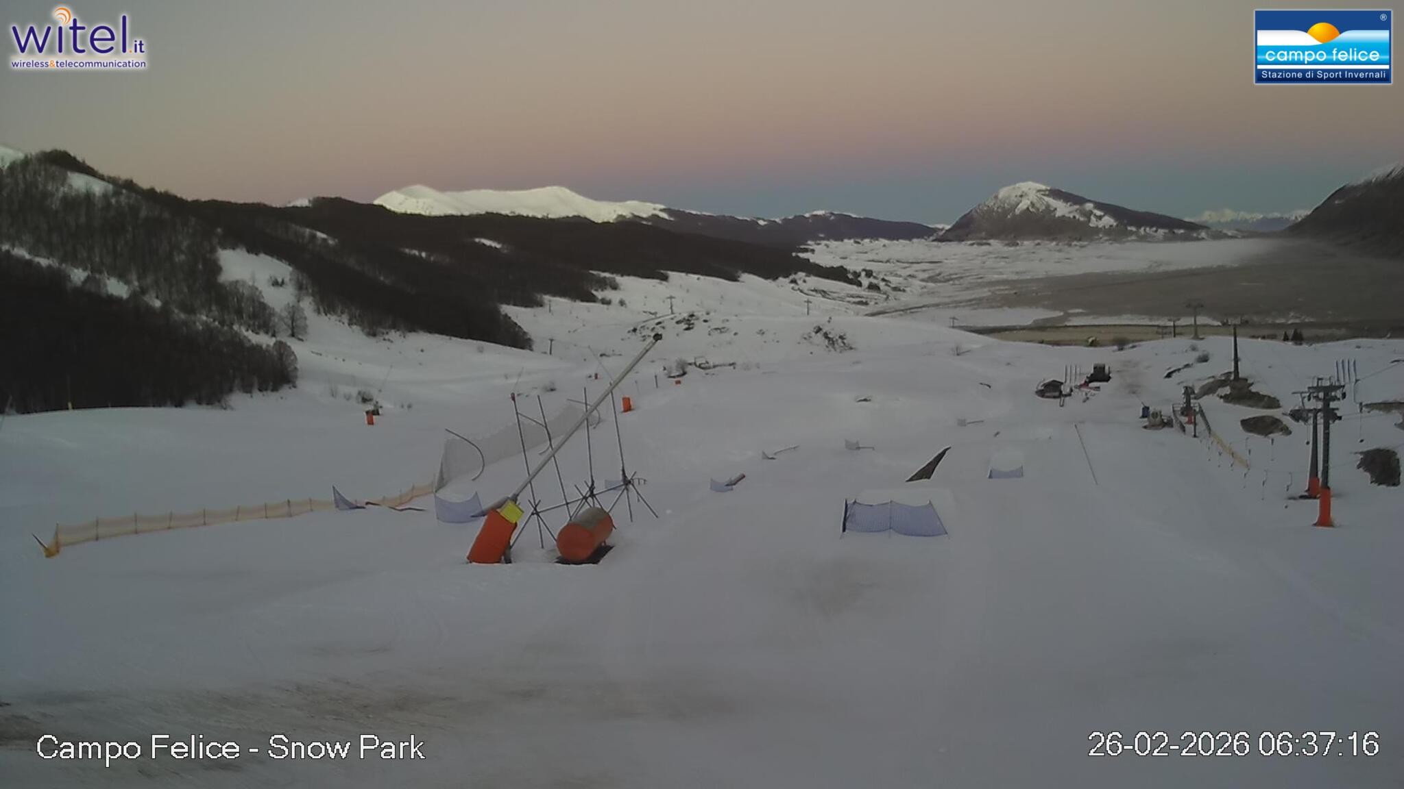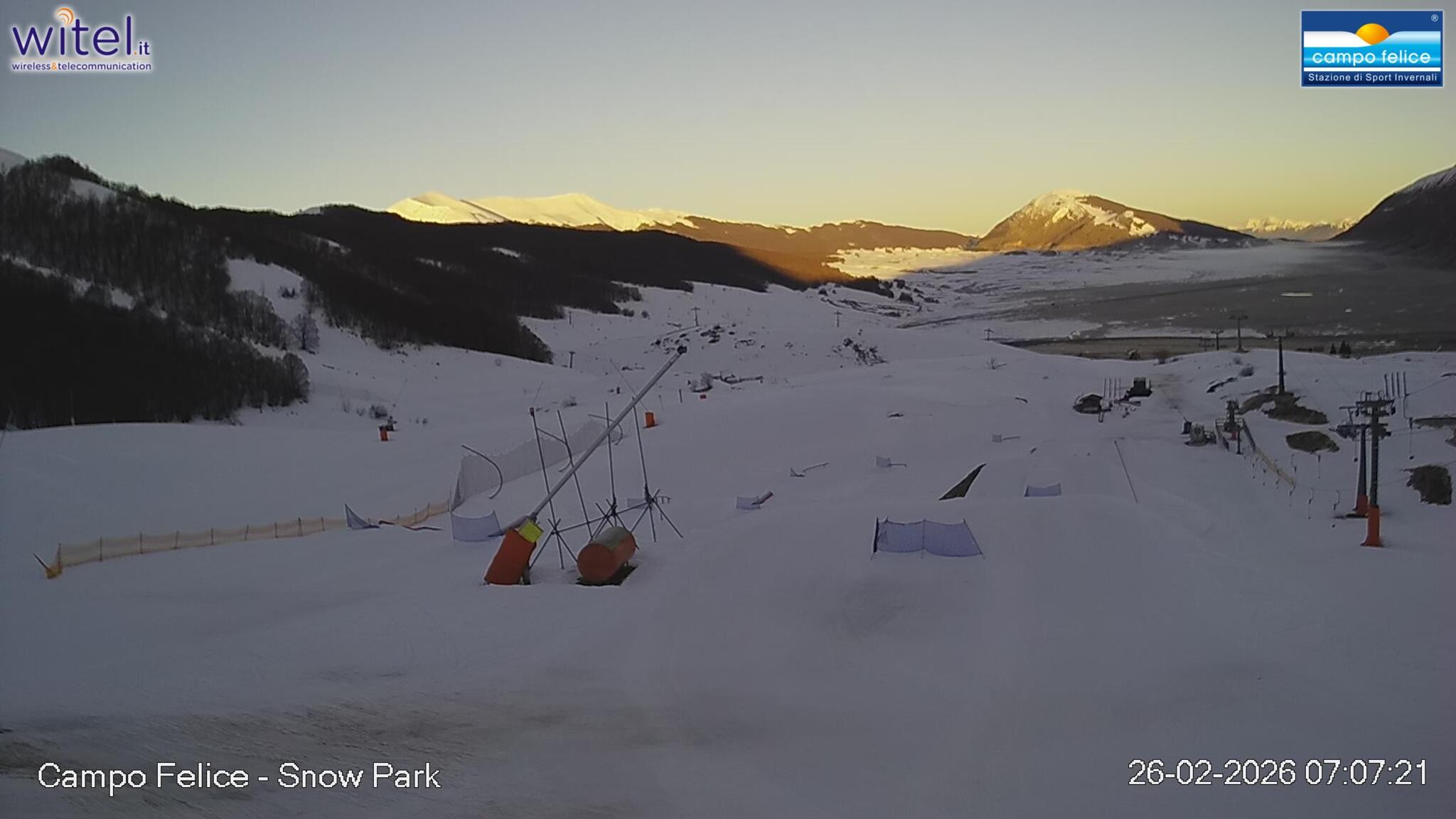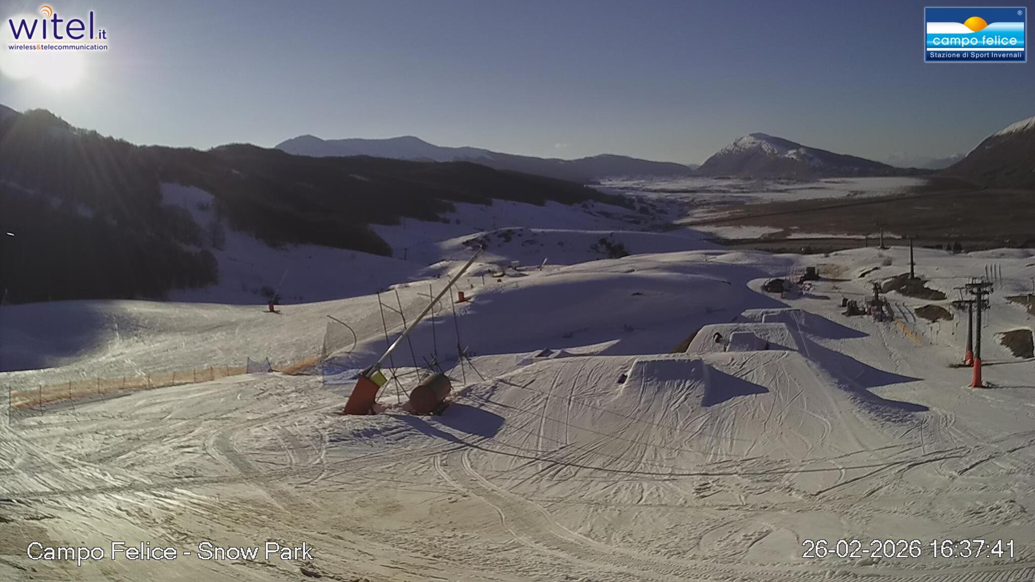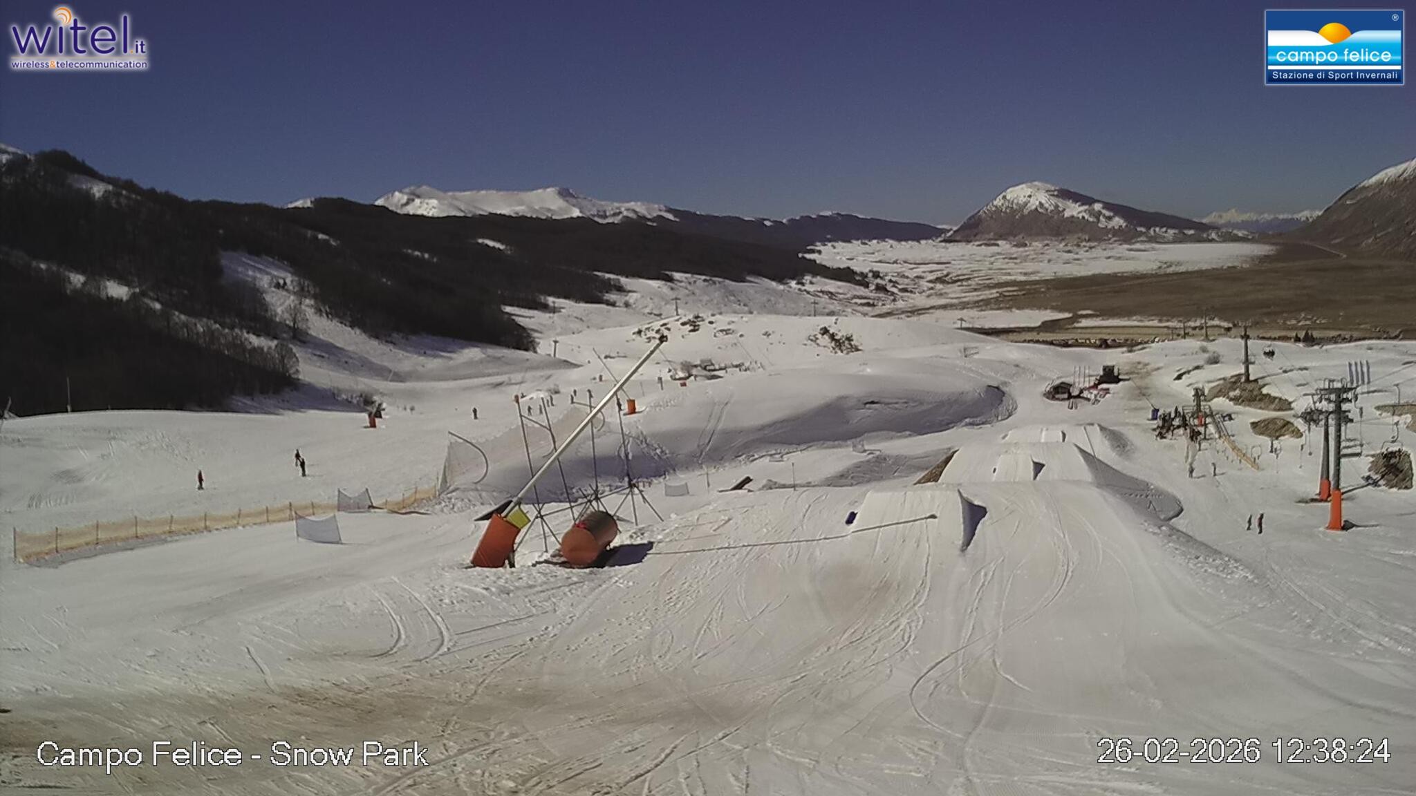 Einen guten Überblick über den Snowpark im italienischen Skigebiet Campo Felice bietet diese Webcam. Zu sehen sind unter anderem der Sessellift Campo Felice, der Schlepplift „Snow Park“ und die blau-markierten Pisten Scorpione und Gemelli.