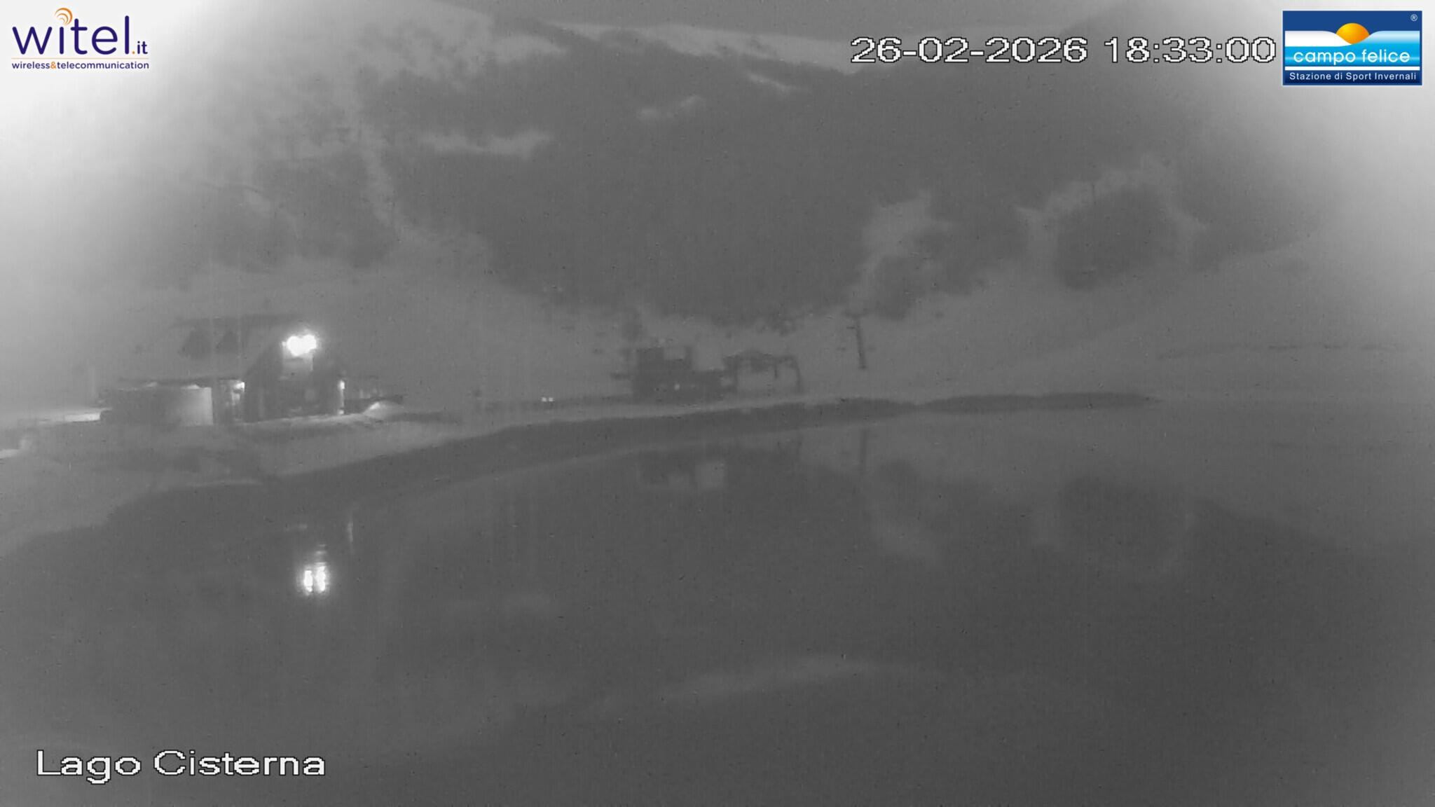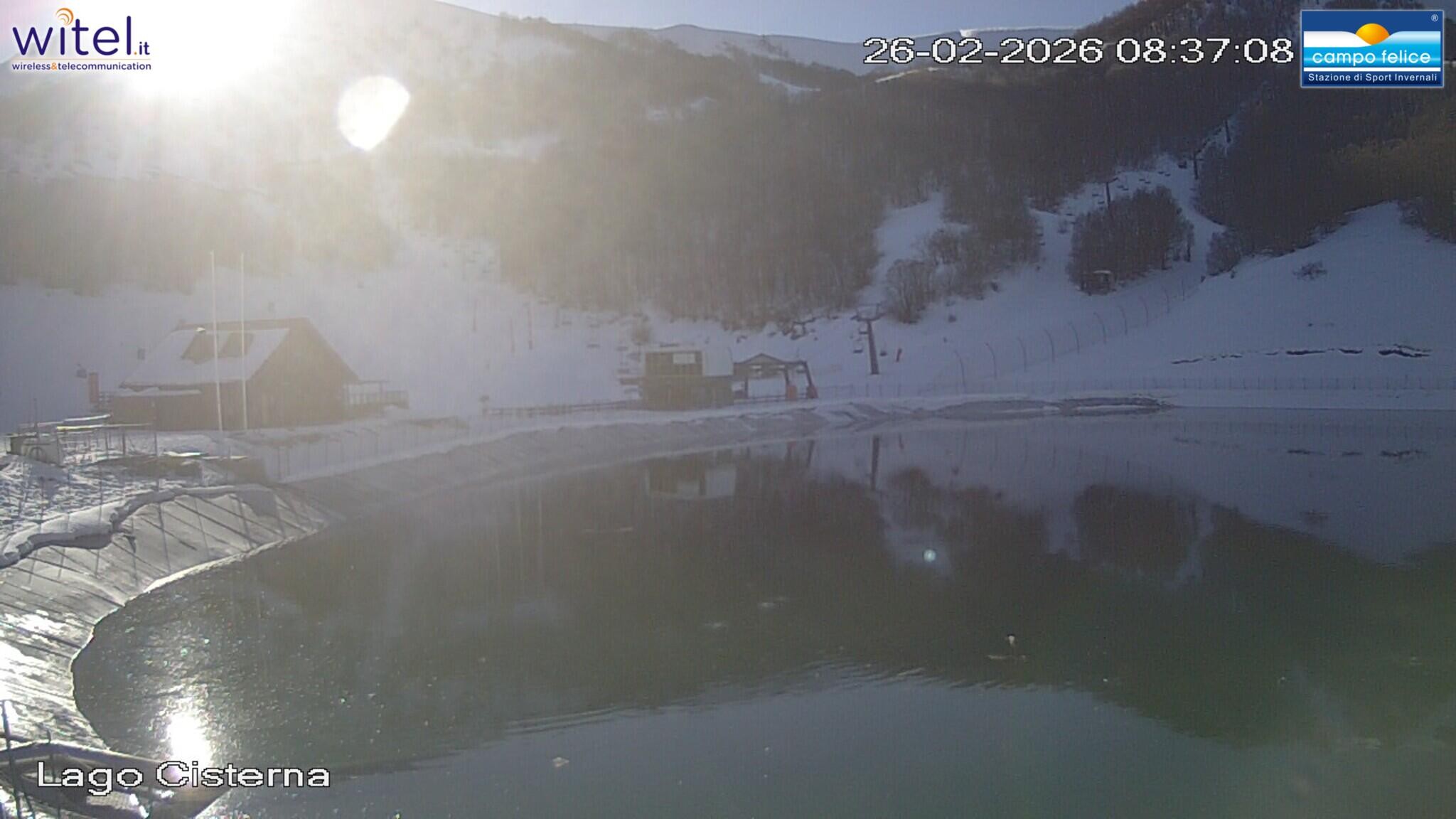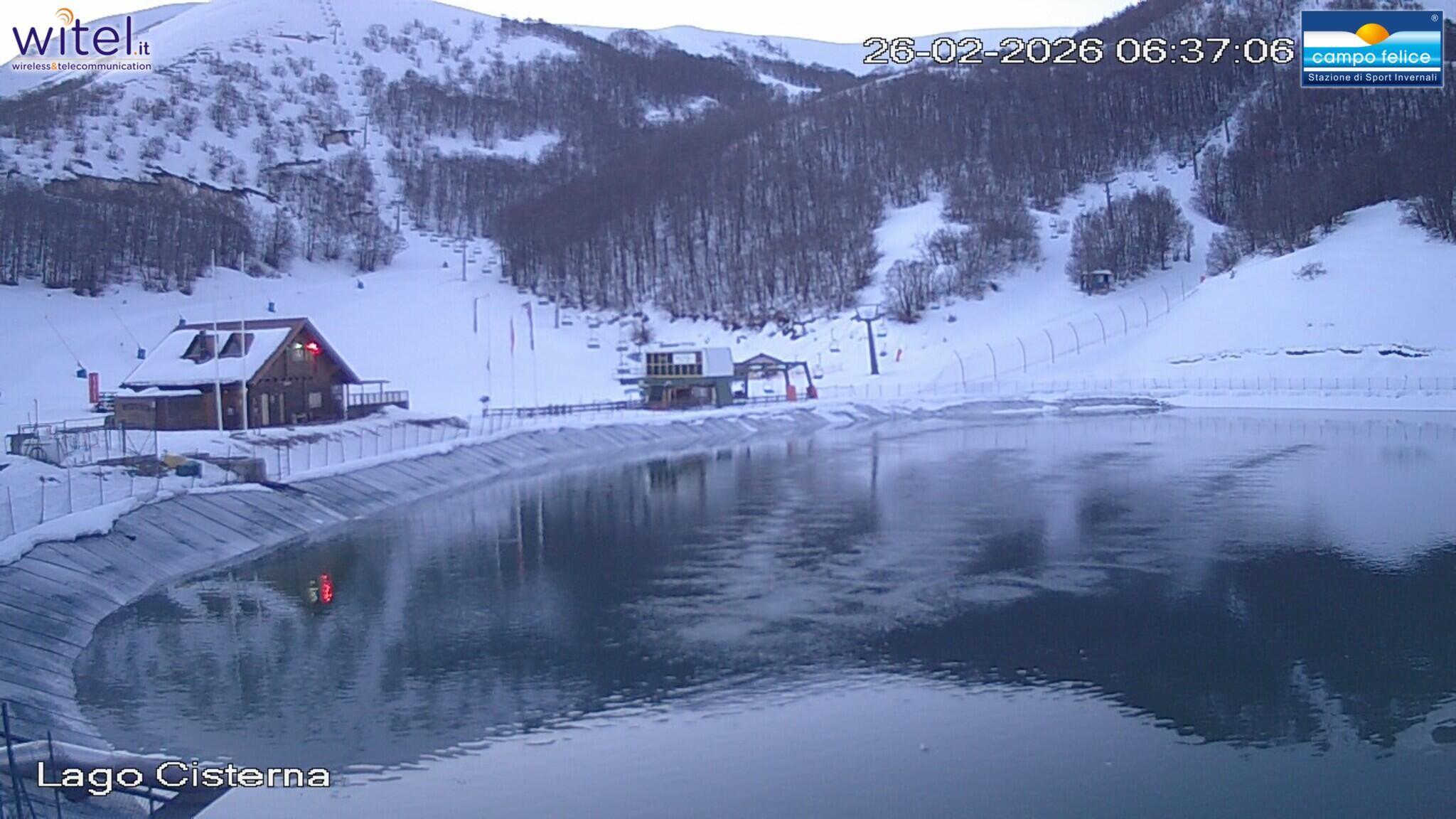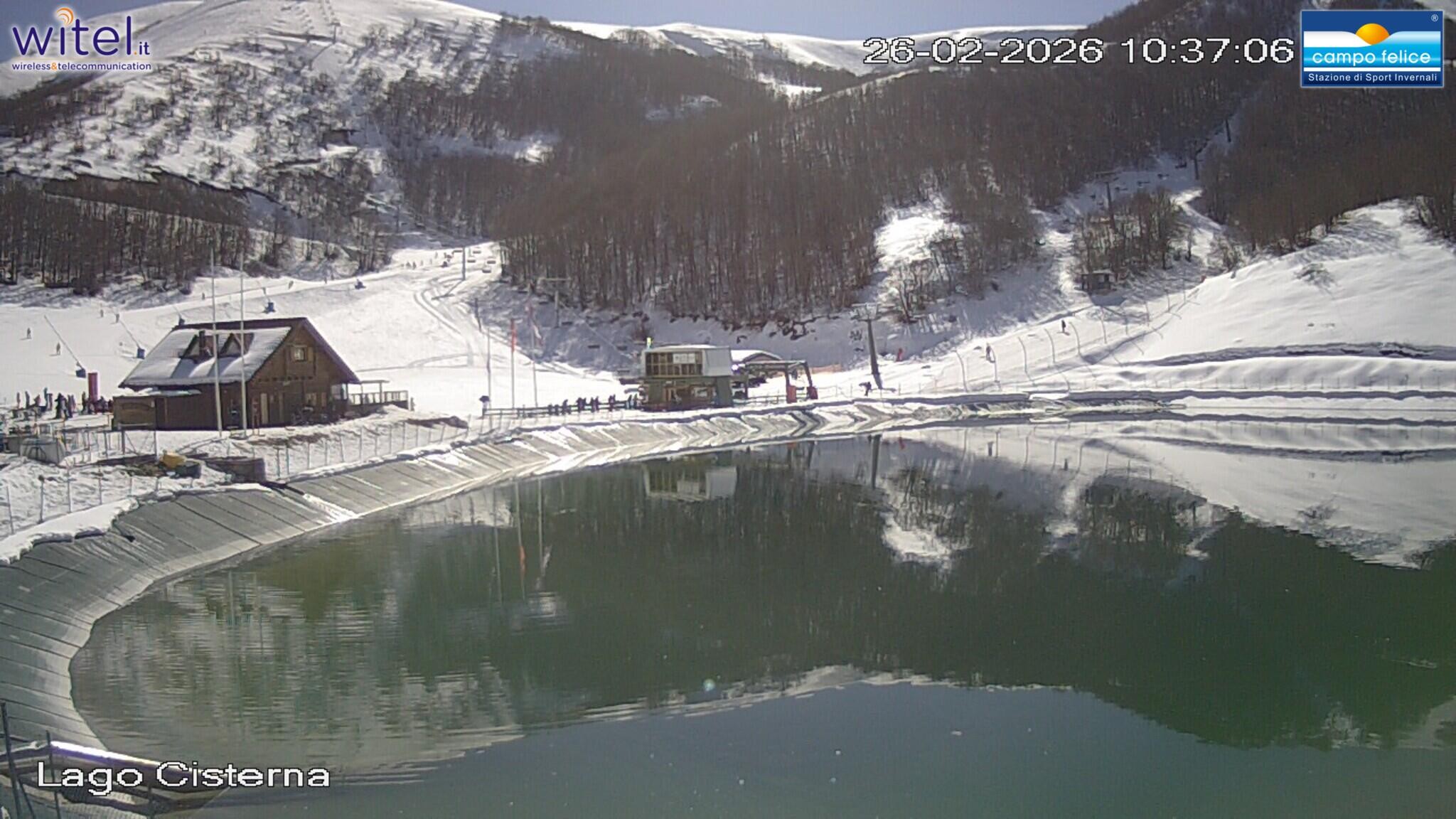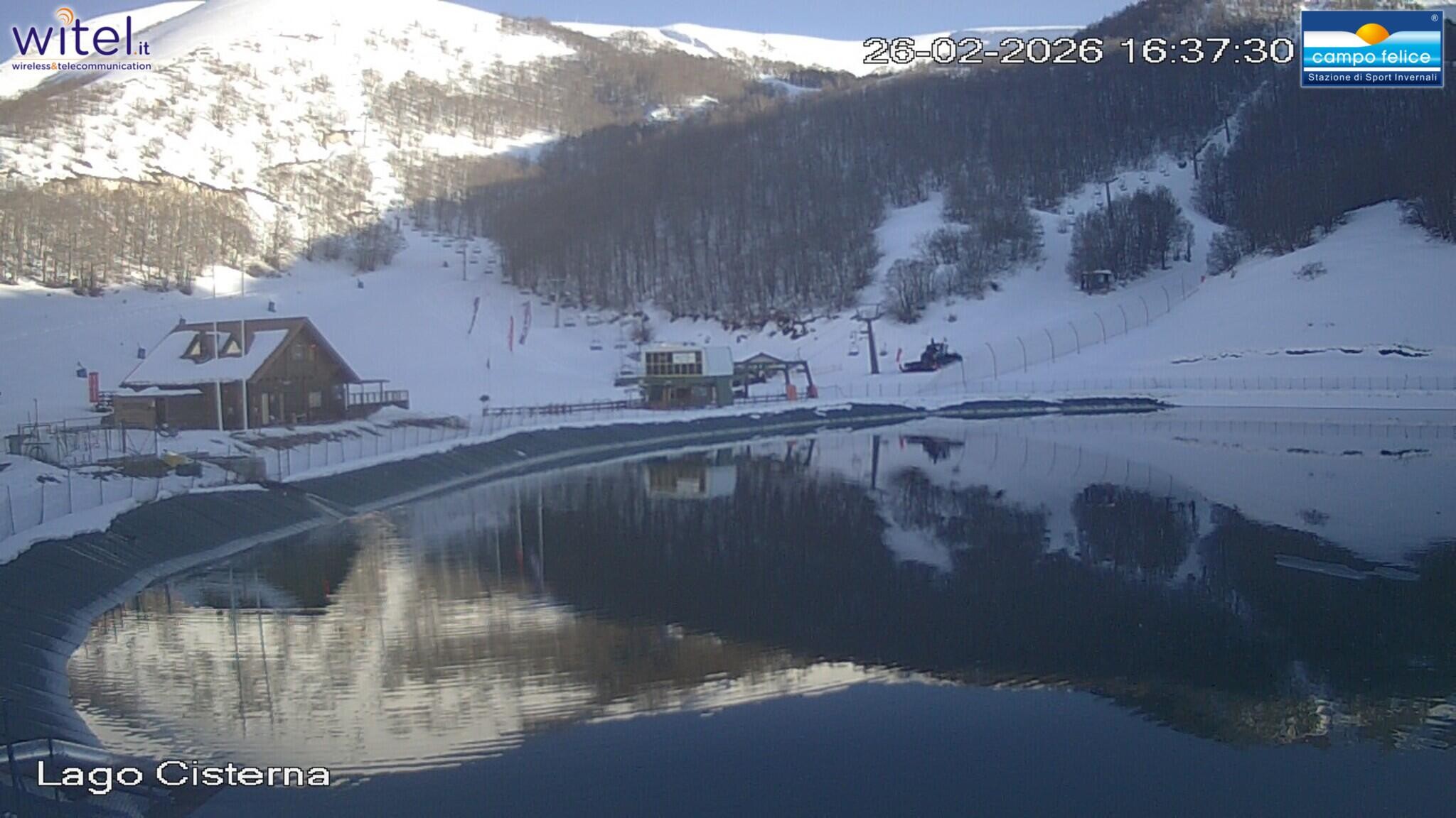 Hier blickt man auf die Talstation des Sessellifts Cisterna am gleichnamigen See im Skigebiet Campo Felice (Italien). Im Chalet del Lago können Wintersportler sich mit Snacks stärken. Im Hintergrund sind außerdem der Sessellift Monterotondo sowie die schwarz-markierten Pisten Gigi Panei und Scorpione und die rot-markierte Piste Rodini zu erkennen.