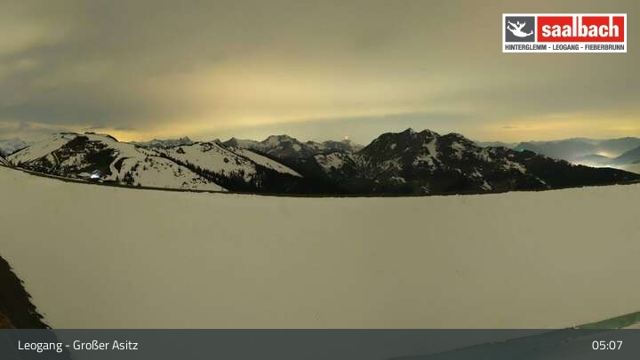 Ausblick vom Großen Asitz in Leogang über die Skipisten und die umliegenden Alpen.