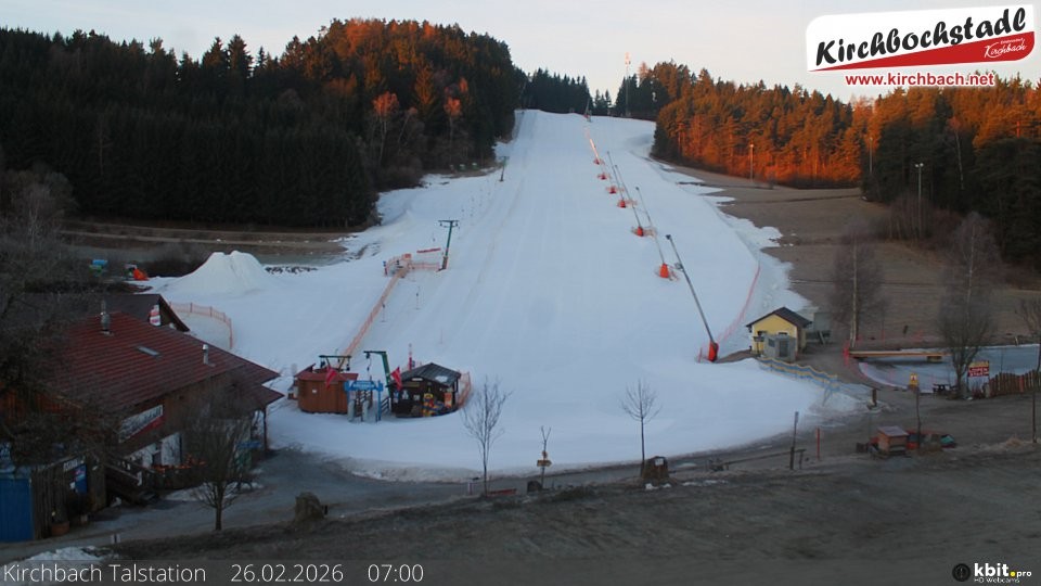 Archived webcam image showing Lift and run at the ski resort Schidorf Kirchbach on 26 Feb 2026 at 06:39 05:00
