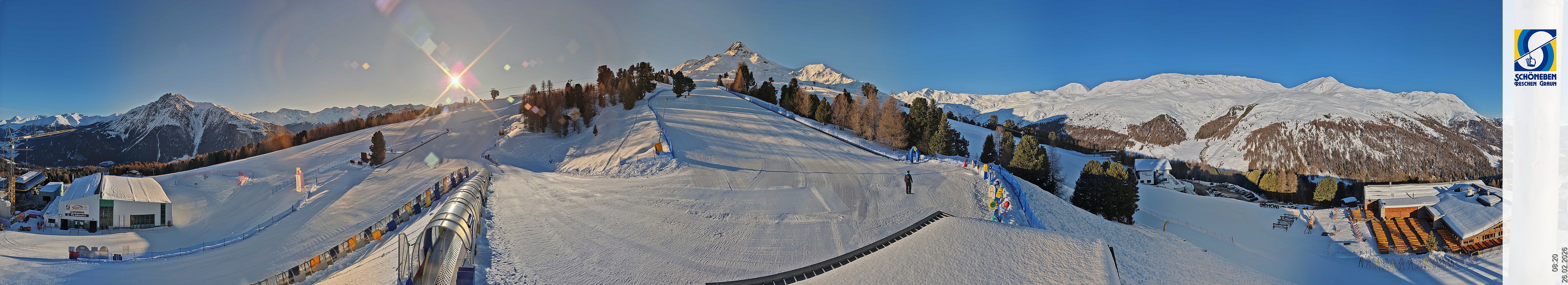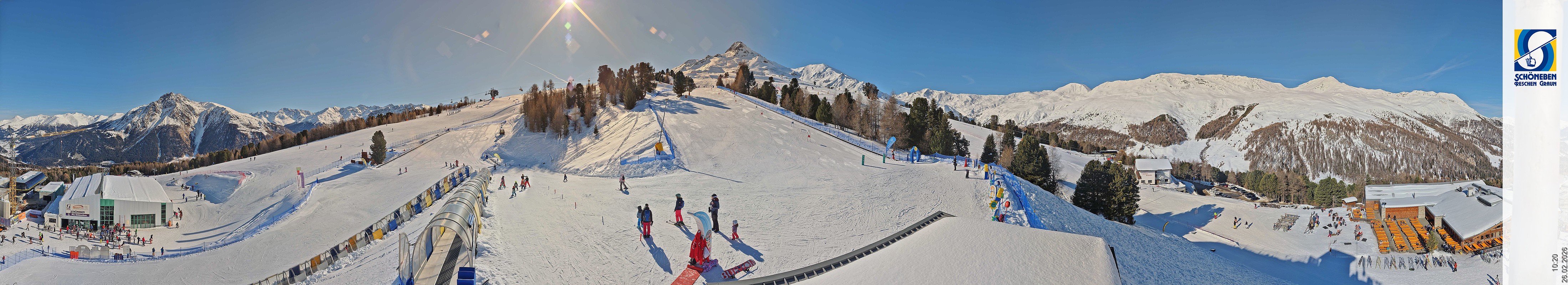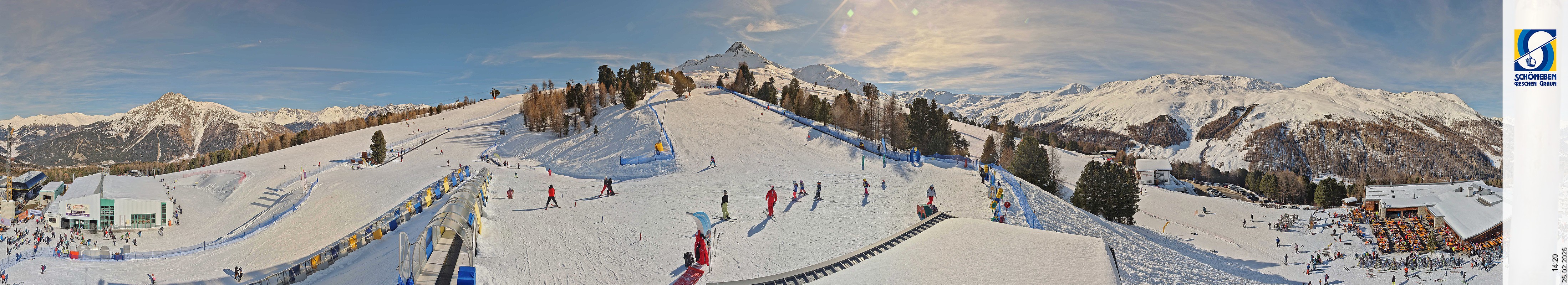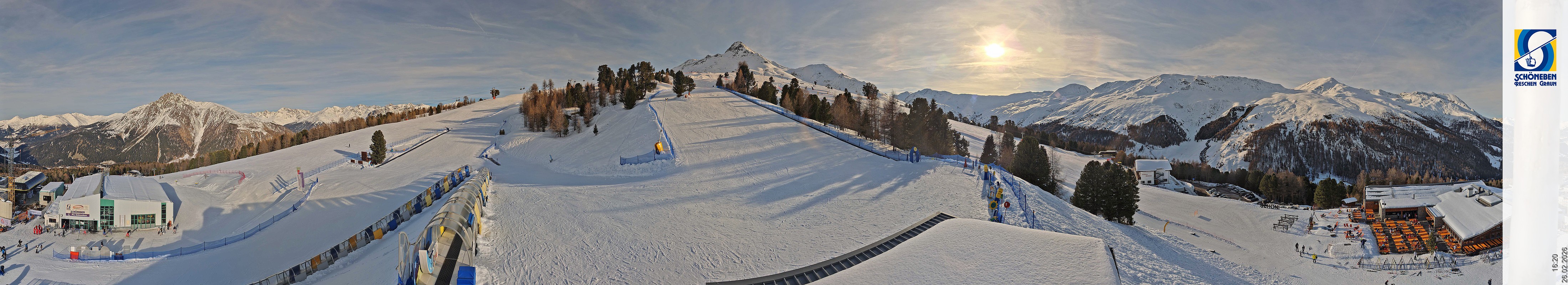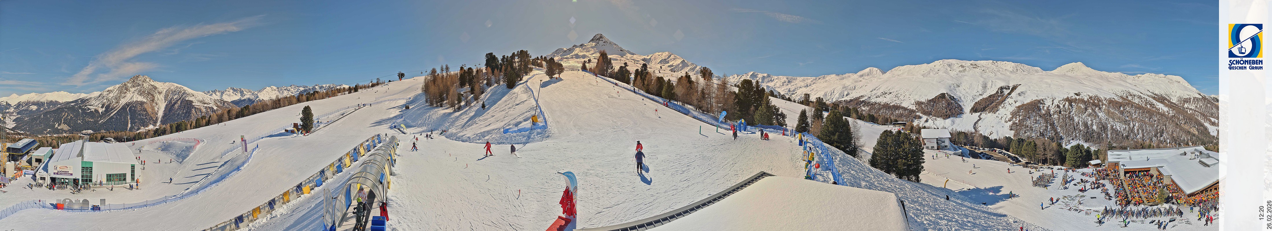 Die Webcam zeigt den Blick über die Mittelstation des Skigebiete Schöneben hinunter Richtung Reschenpass und Reschensee.